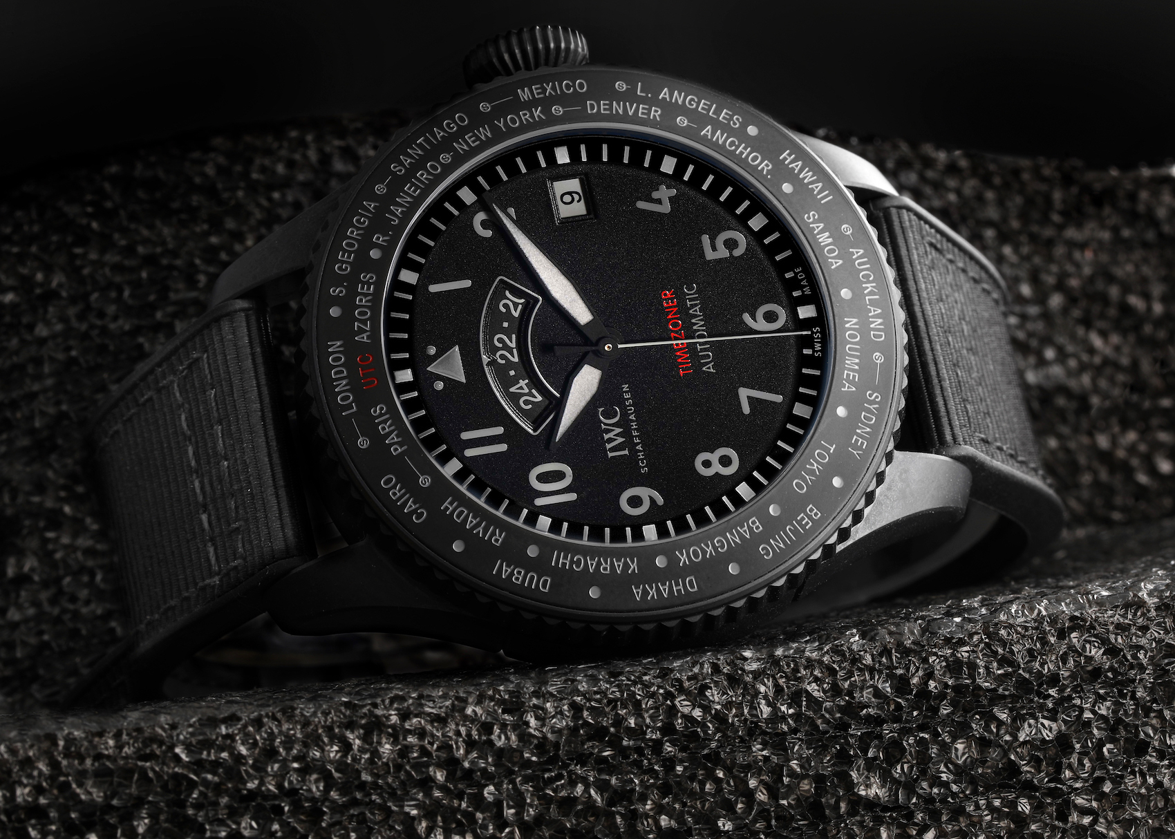 With the Timezoner, IWC became the first watchmaker to offer a timepiece that permits the wearer to set another timezone in addition to the date and 24-hour hand, with a single action on the bezel: press, rotate, and release. The Timezoner works without stopping the movement, thus not losing a single second in the process, even across the dateline. This design was created by Michael Vogt, who outfitted his creations with this bezel-set GMT mechanism under the Vogard brand, which debuted at 2014 Baselworld. He eventually sold it to IWC, who further developed it. |