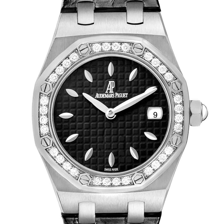 Audemars Piguet Lady Royal Oak 33 Steel Diamond Ladies Watch 67601ST Papers. Quartz movement. Stainless steel case 33.0 mm in diameter. Circular grained crown set with the white spinel cabochon. Original Audemars Piguet factory diamond bezel punctuated with 8 signature screws. Scratch resistant sapphire crystal. Black decorated dial with index hour markers and hands. Date window at the 3 o'clock position. Black leather strap with a stainless steel deployant clasp.