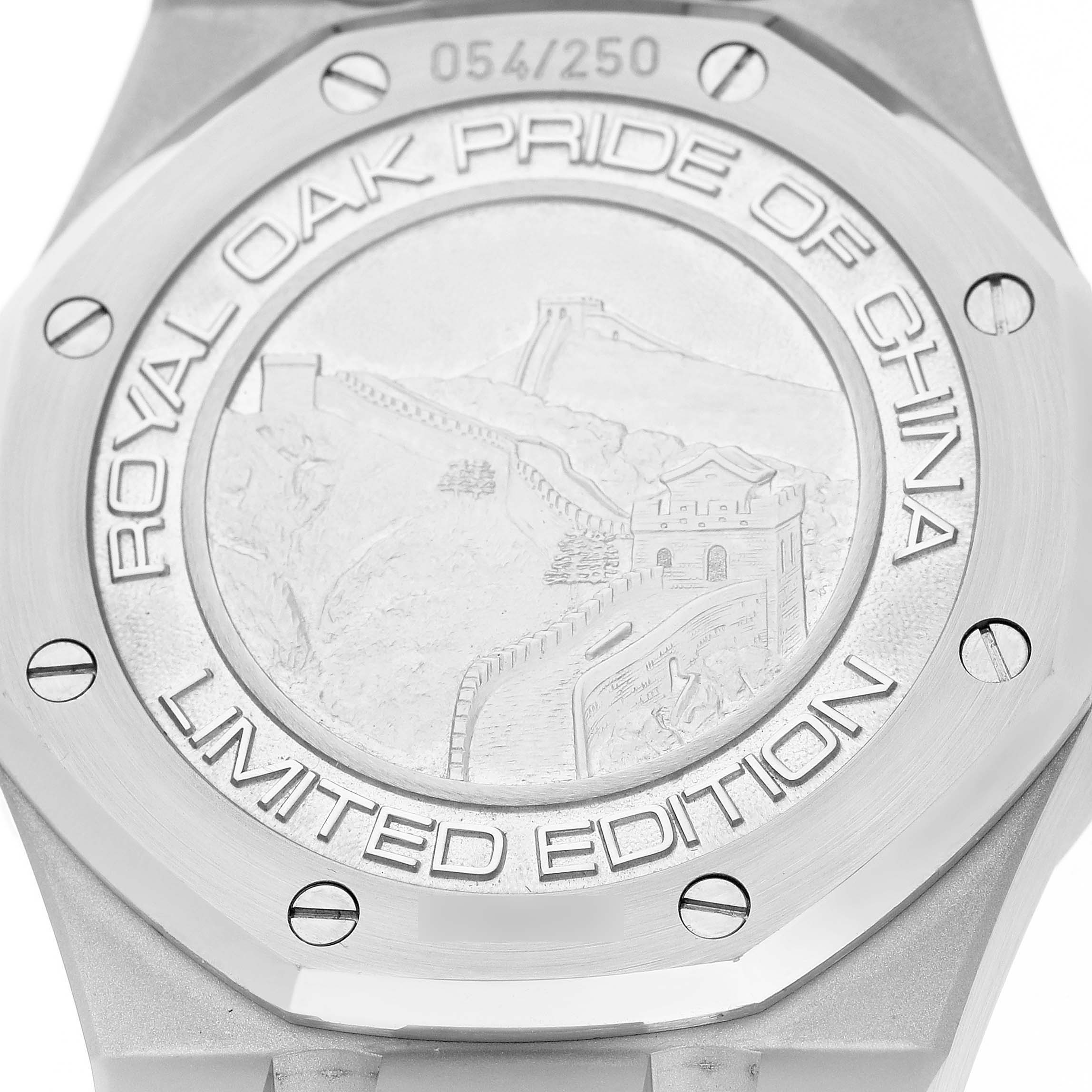 | Case: | Stainless steel case 39.0 mm in diameter. AP logo on the 18k rose gold crown. Solid case back features a picture of the Great Wall of China with text "Royal Oak Pride of China" and "Limited Edition". |