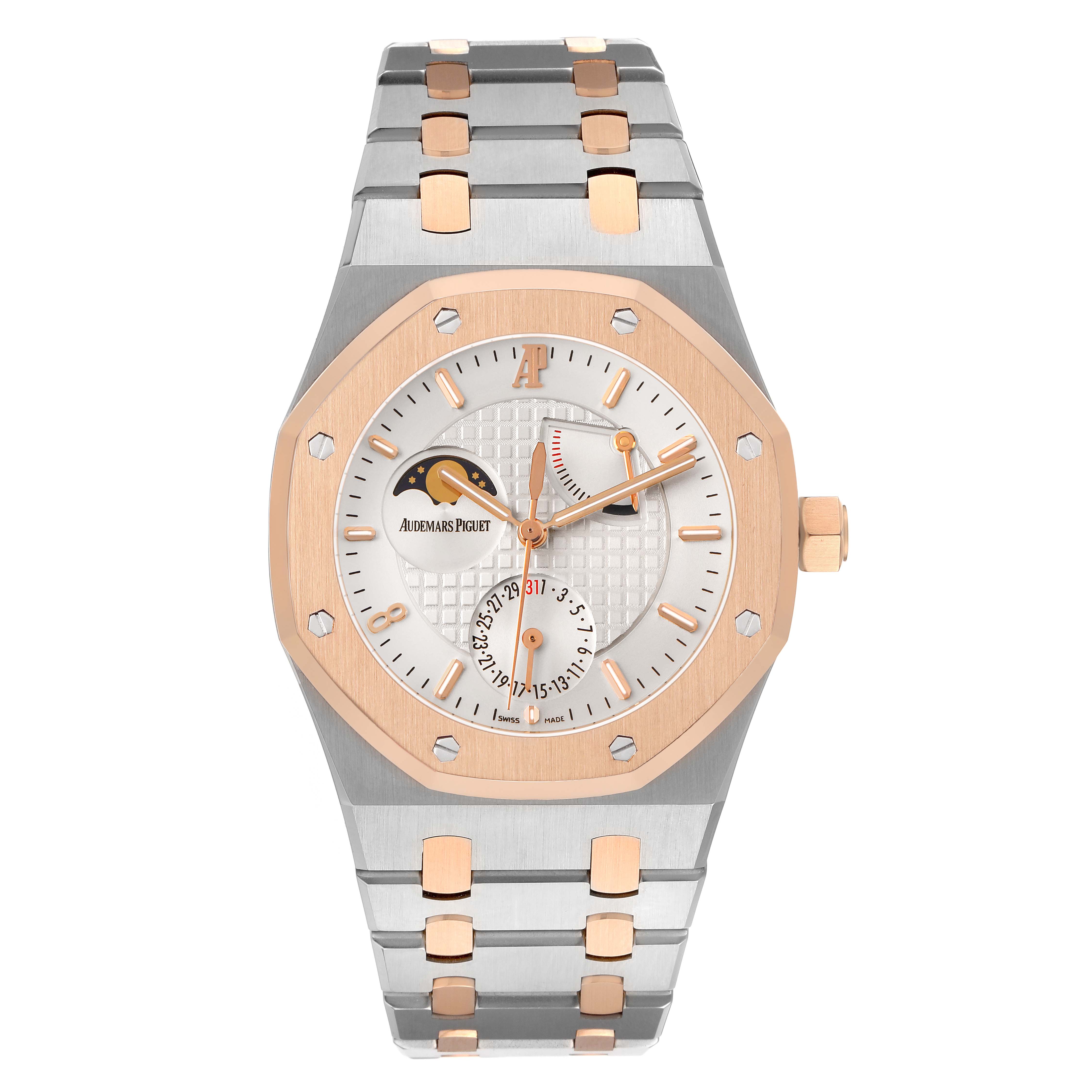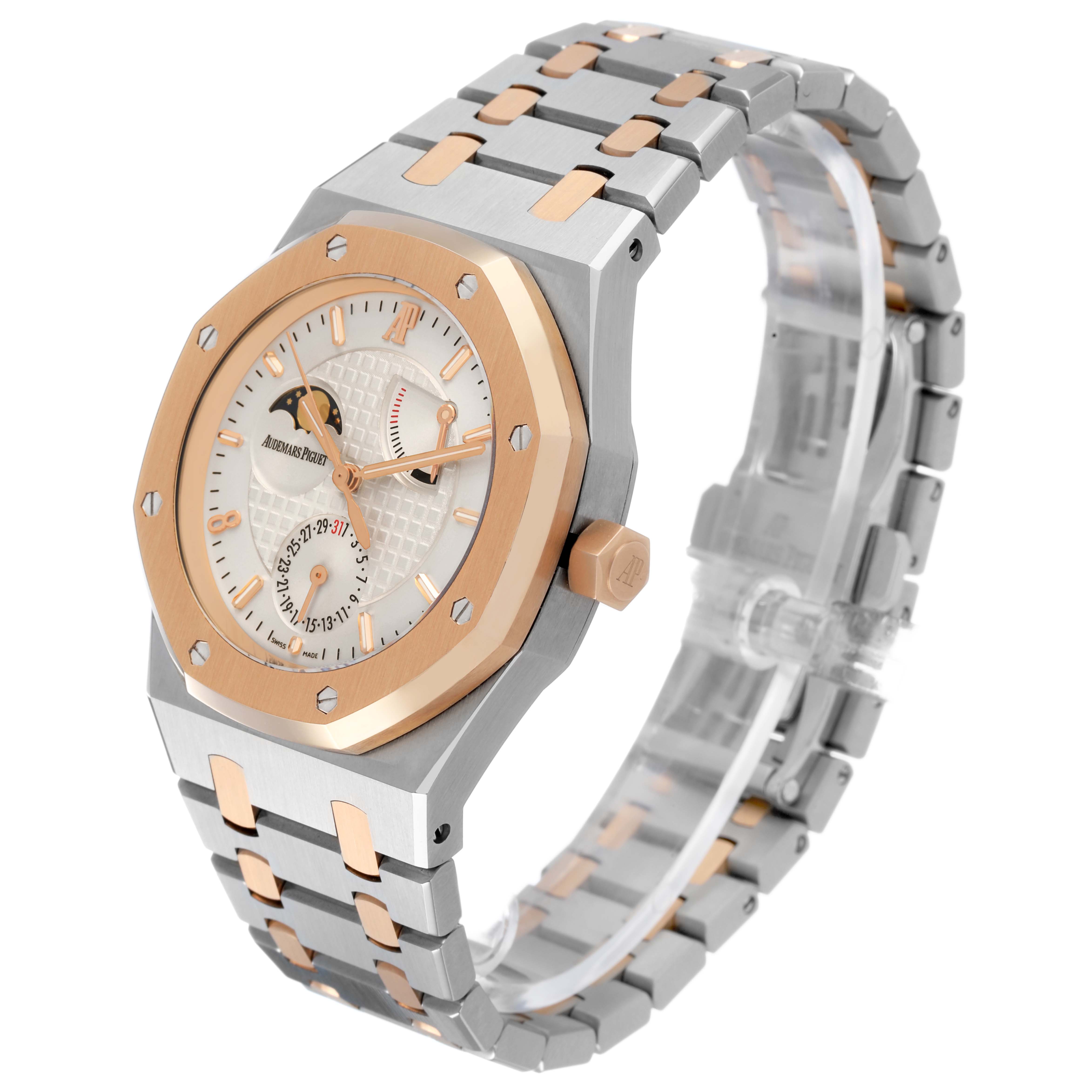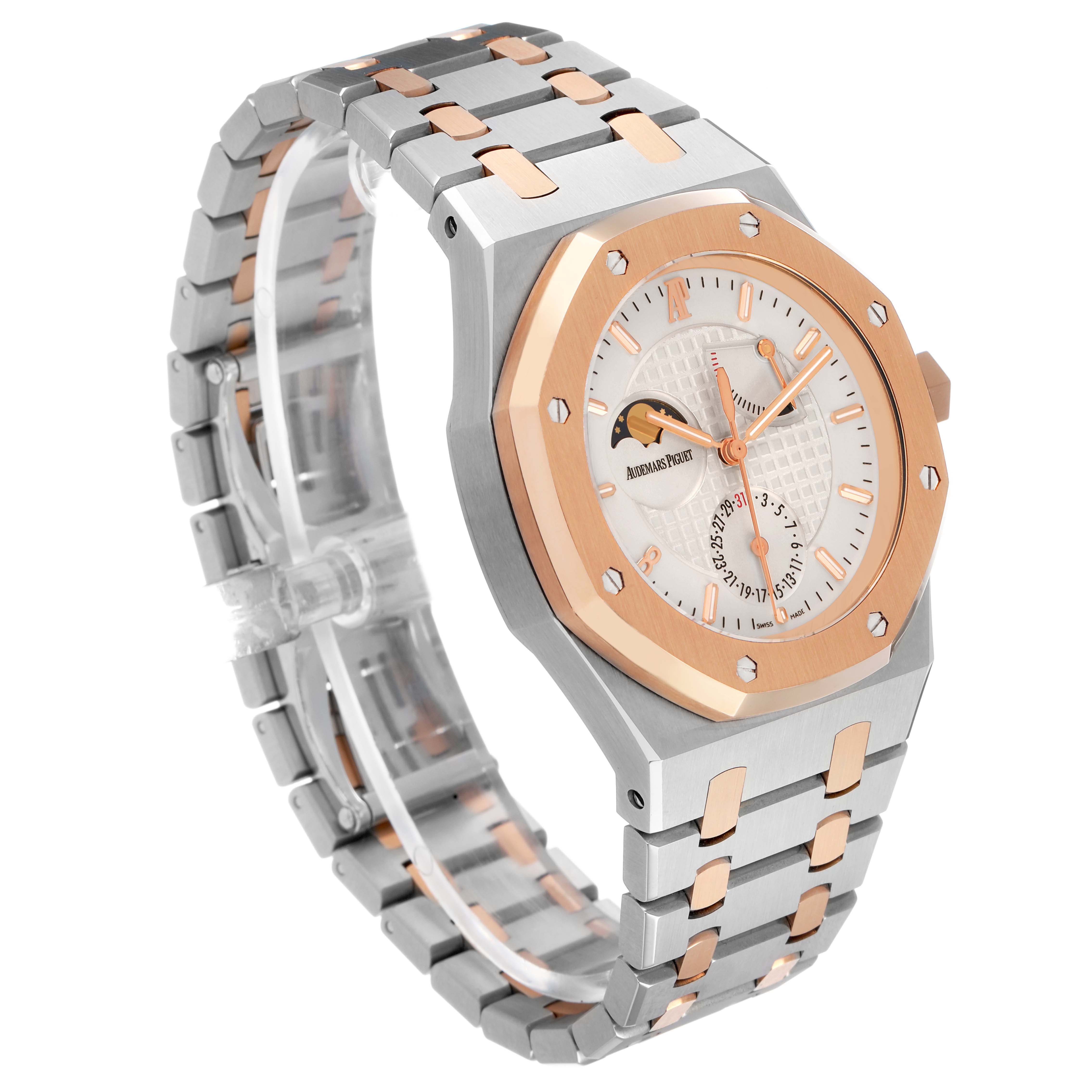 Audemars Piguet Royal Oak LE Pride of China Steel Rose Gold Mens Watch 26168SR. Automatic self-winding movement. Stainless steel case 39.0 mm in diameter. AP logo on the 18k rose gold crown. Solid case back features a picture of the Great Wall of China with text "Royal Oak Pride of China" and "Limited Edition". 18k rose gold octagonal bezel punctuated with 8 signature screws. Scratch resistant sapphire crystal. Silver Grande Tapisserie dial with 18k rose gold luminescent baton hour markers and hands. Rose gold Arabic numeral hour marker at 8 o'clock. Sweep center seconds hand. Date window at the 6 o'clock subdial. Power reserver indicator between 1 and 2 o'clock. Moonphase display at 10 o'clock. Stainless steel and 18k rose gold bracelet with a push-button deployant butterfly clasp. Fits an 8" wrist.