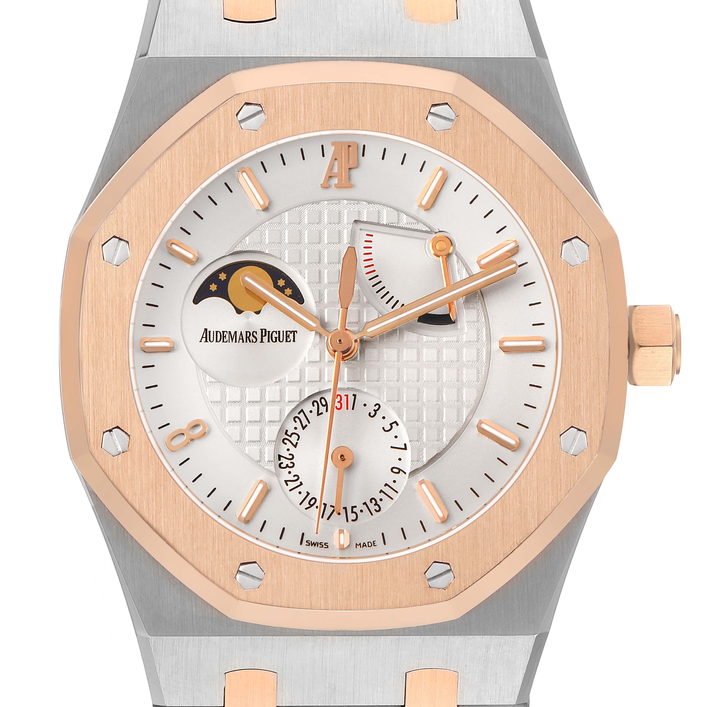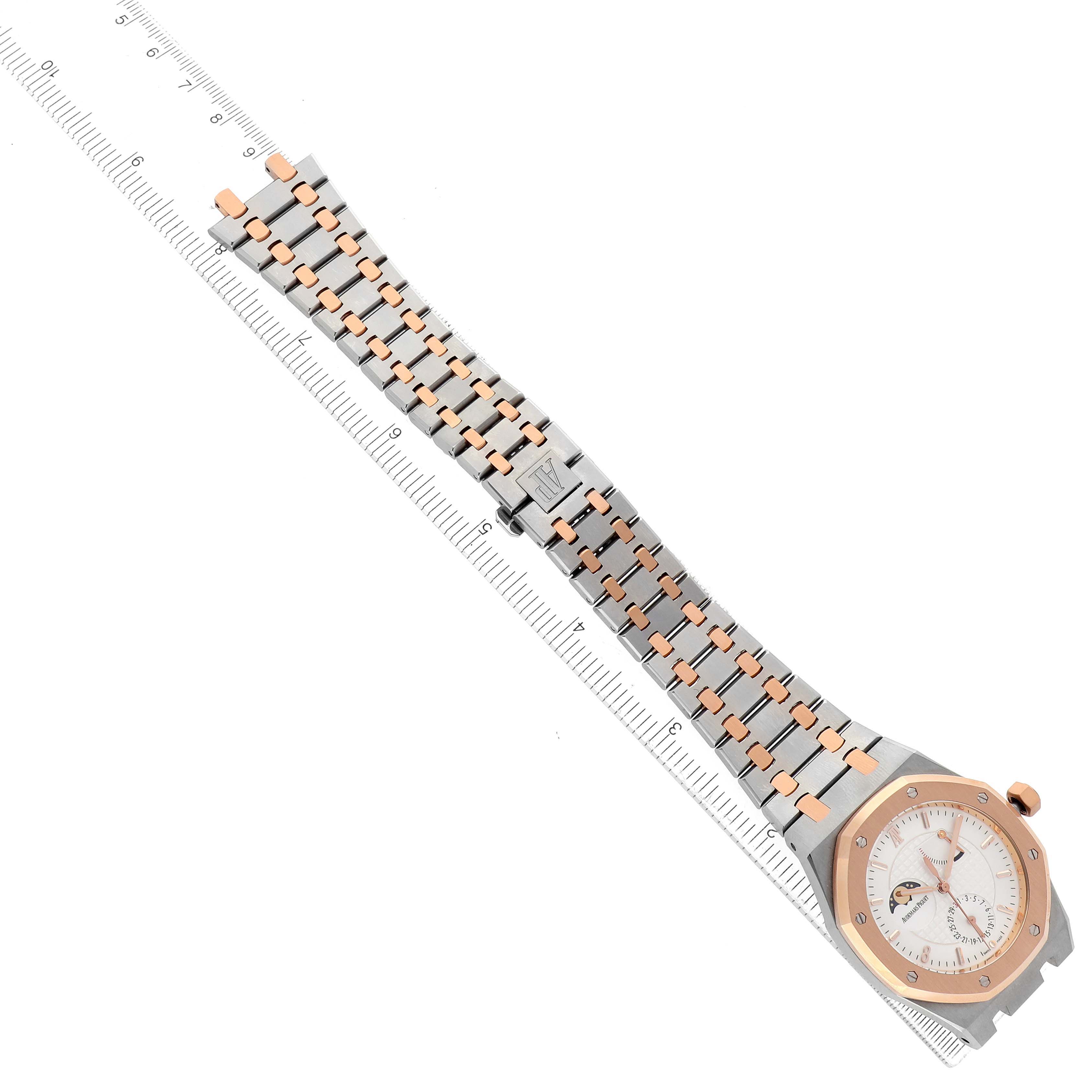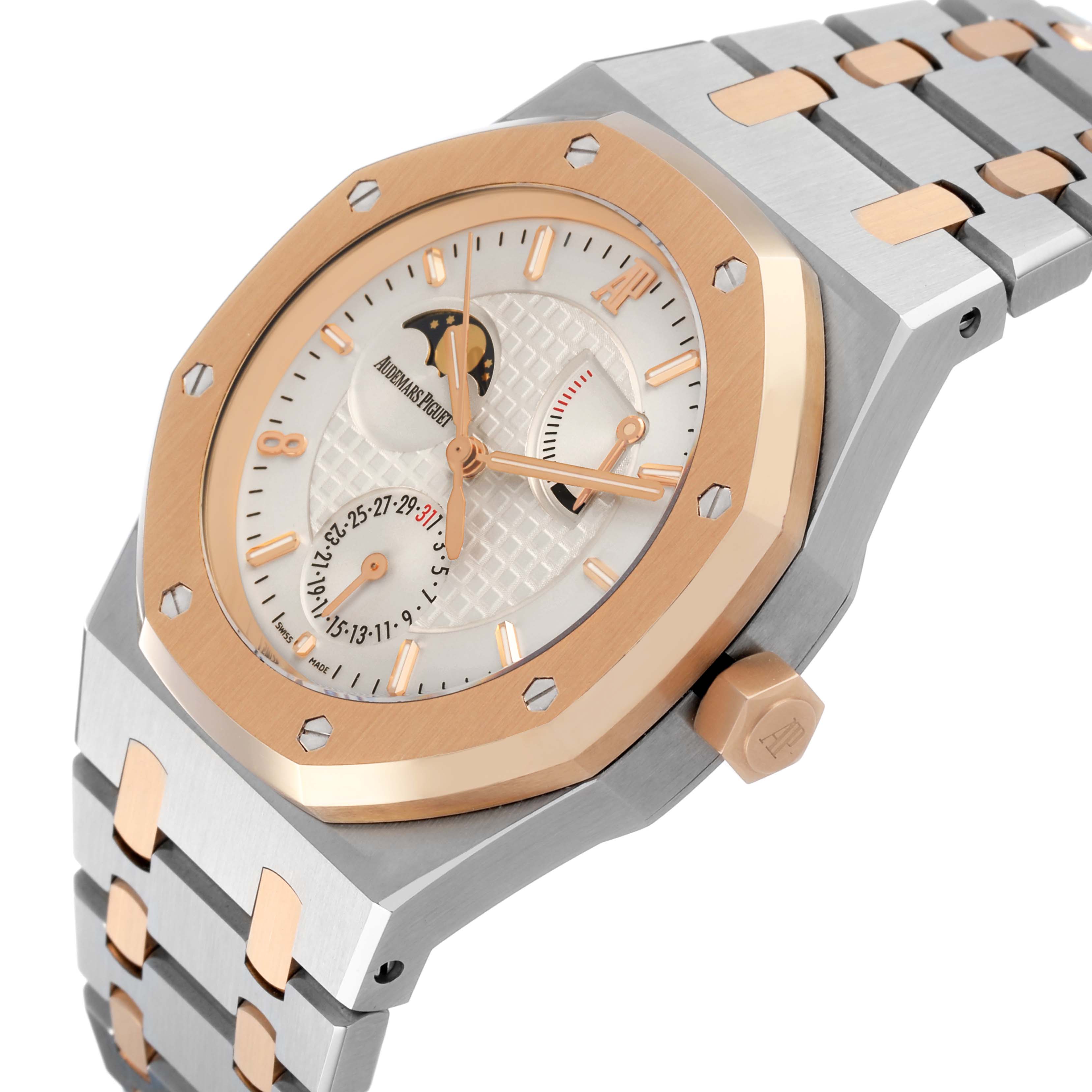 Audemars Piguet Royal Oak LE Pride of China Steel Rose Gold Mens Watch 26168SR. Automatic self-winding movement. Stainless steel case 39.0 mm in diameter. AP logo on the 18k rose gold crown. Solid case back features a picture of the Great Wall of China with text "Royal Oak Pride of China" and "Limited Edition". 18k rose gold octagonal bezel punctuated with 8 signature screws. Scratch resistant sapphire crystal. Silver Grande Tapisserie dial with 18k rose gold luminescent baton hour markers and hands. Rose gold Arabic numeral hour marker at 8 o'clock. Sweep center seconds hand. Date window at the 6 o'clock subdial. Power reserver indicator between 1 and 2 o'clock. Moonphase display at 10 o'clock. Stainless steel and 18k rose gold bracelet with a push-button deployant butterfly clasp. Fits an 8" wrist.
