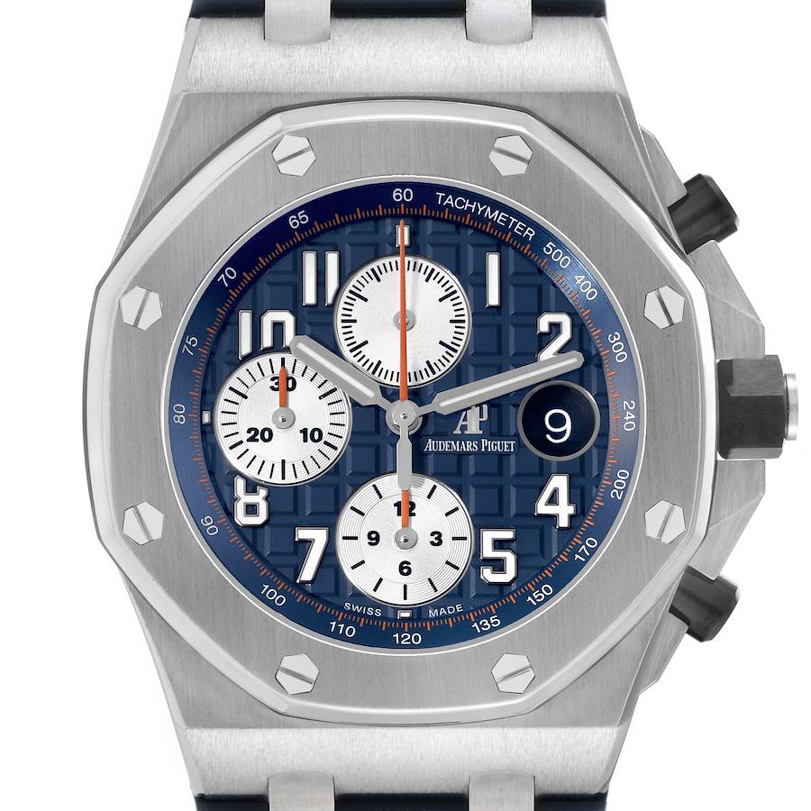 Audemars Piguet Royal Oak Offshore Chronograph Mens Watch 26470ST Box Papers. Automatic self-winding chronograph movement. Stainless octagonal case 42 mm in diameter. Exhibition sapphire crystal case back. Black ceramic crown with a brushed stainless steel center & an engraved AP logo. Black ceramic chronograph buttons. Stainless steel bezel punctuated with 8 signature screws. Scratch resistant glareproof sapphire crystal. Blue dial with Mega Tapisserie waffle pattern, white gold arabic numerals and hands with luminous fill. Central Seconds hand. Date window at 3 o'clock aperture. Tachymeter scale around the blue inner bezel. Three silver chronograph sub-dials -- 60 second, 30 minute and 12 hour. Blue rubber strap with stainless steel tang buckle.