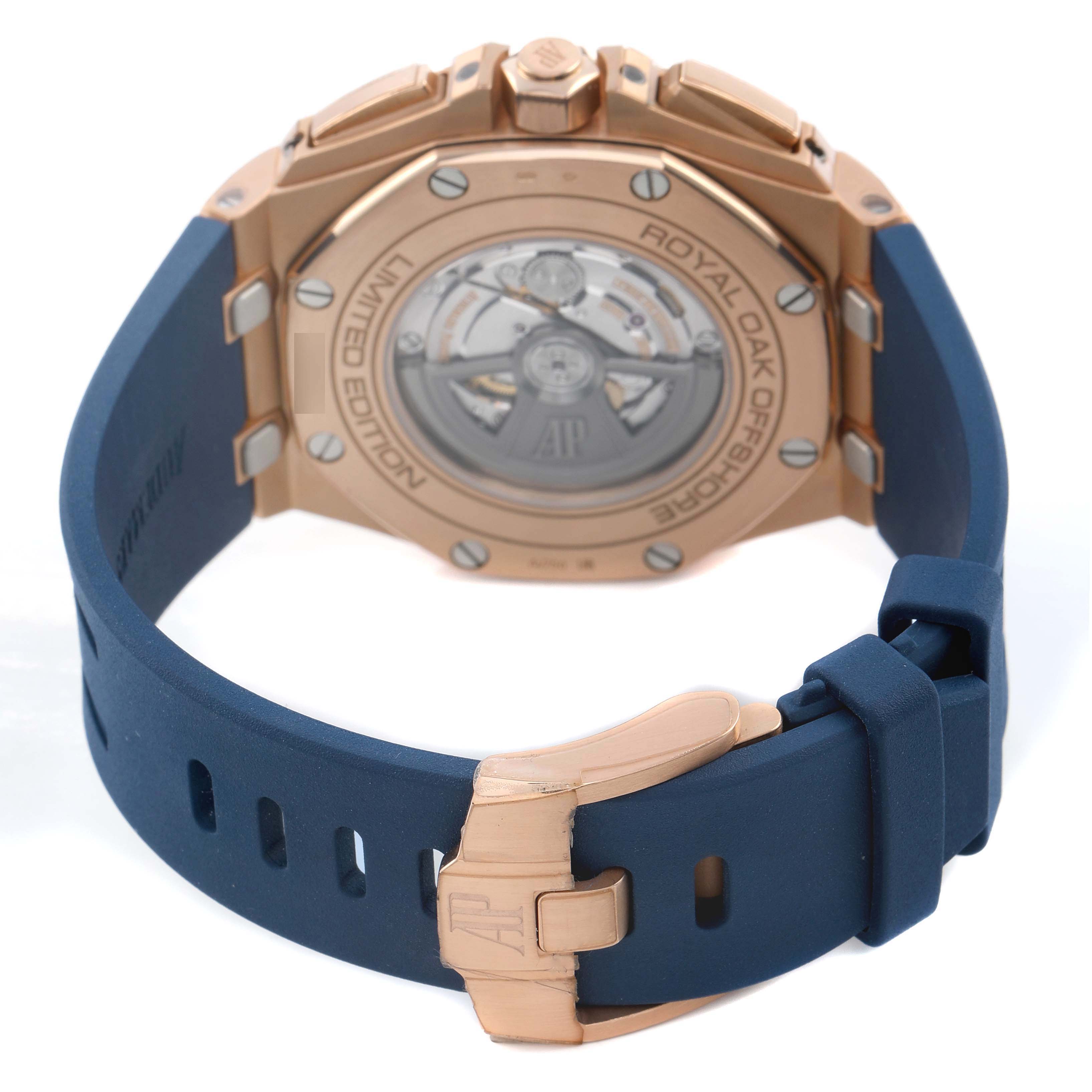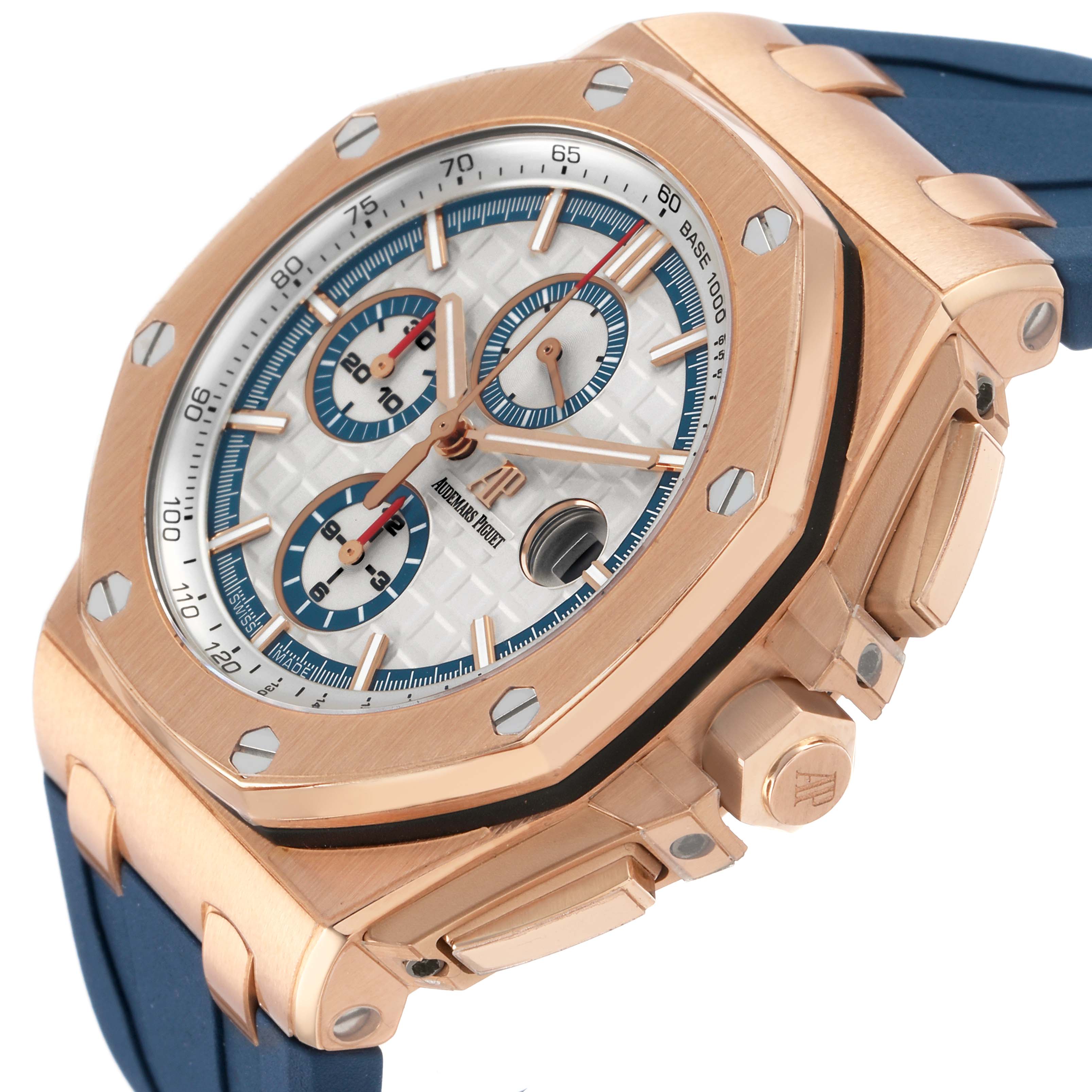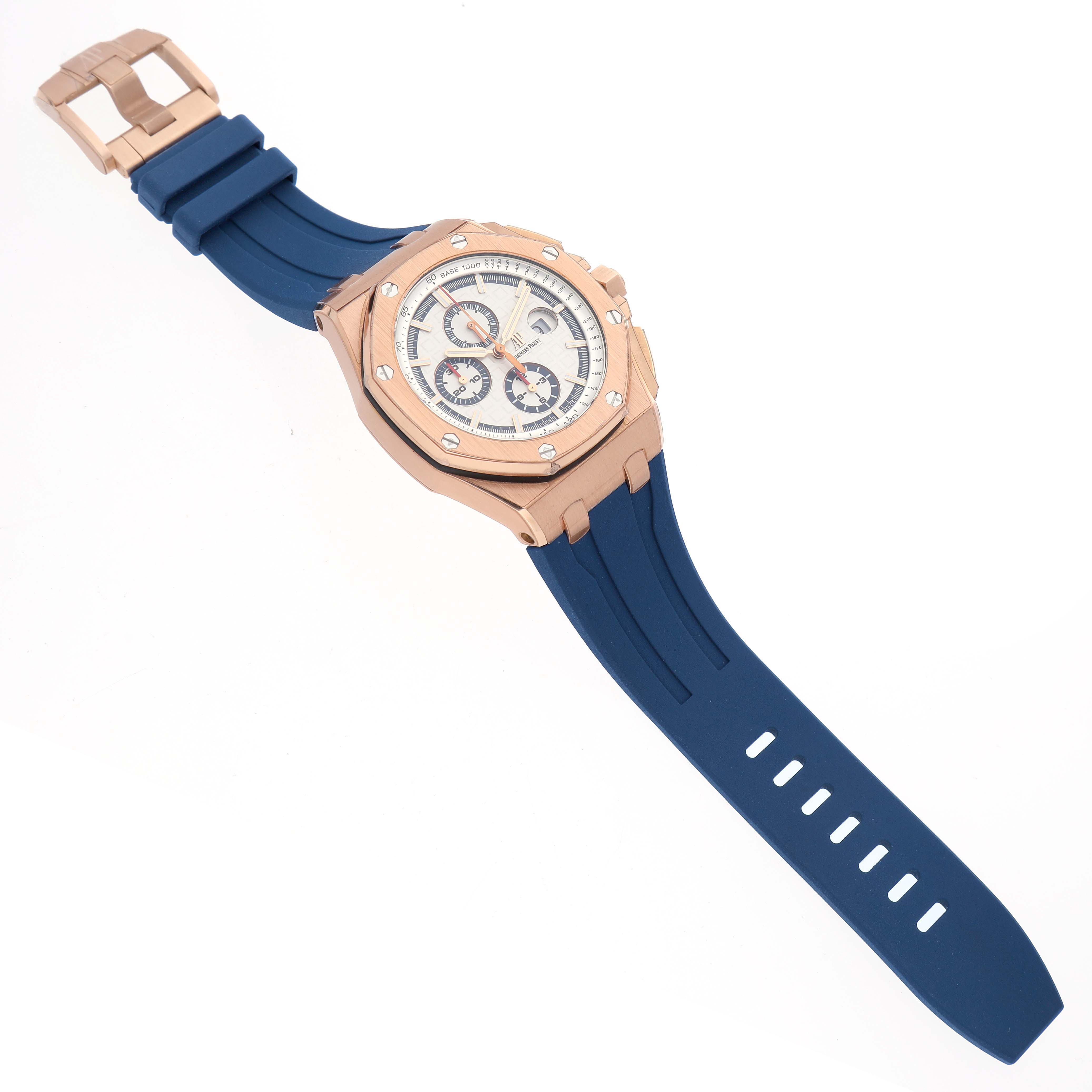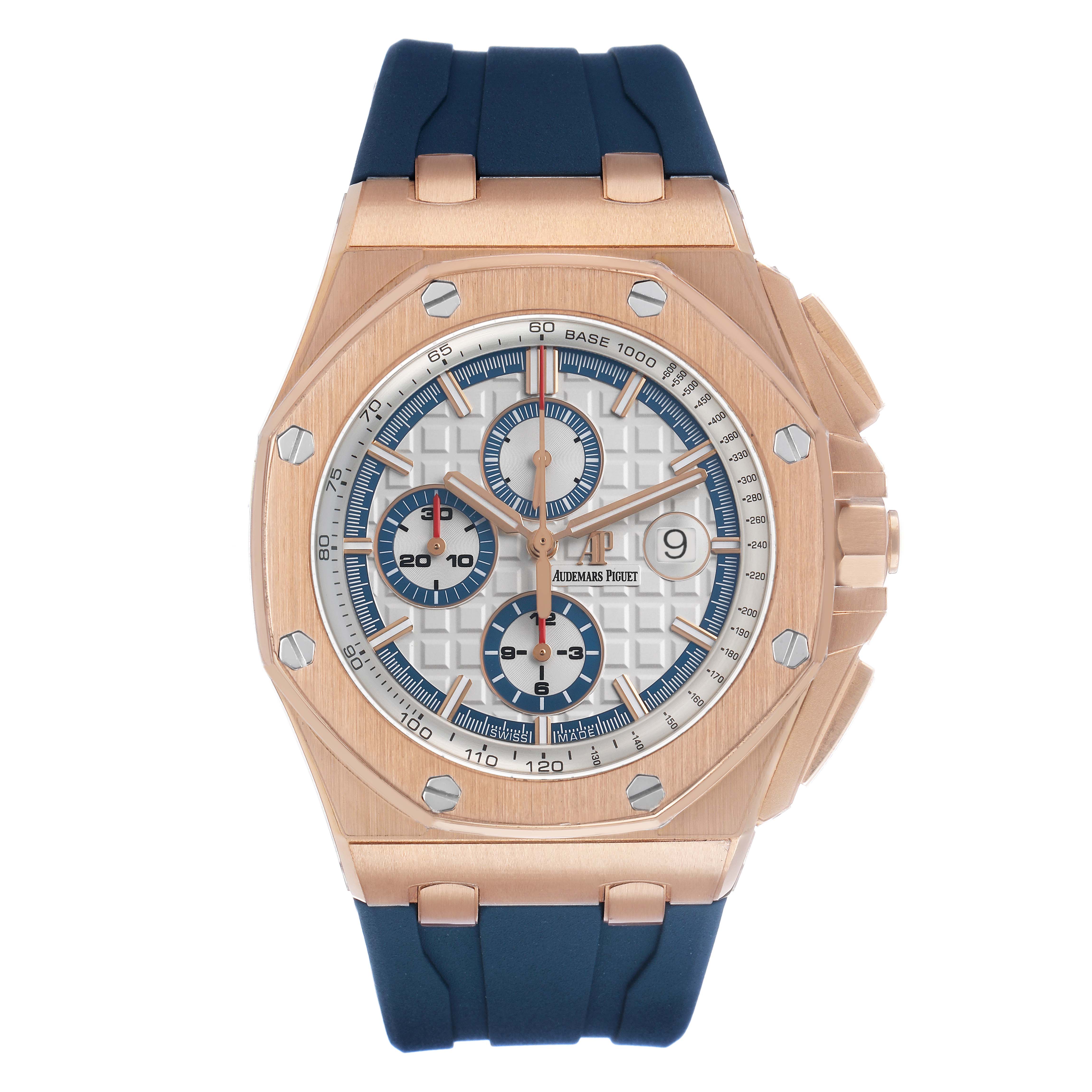 Audemars Piguet Royal Oak Offshore Rose Gold Mens Watch 26408OR Box Papers. Automatic self-winding chronograph movement. 18k rose gold octagonal case 44 mm in diameter. Exhibition sapphire crystal case back. Rose gold crown with a brushed rose gold center and engraved AP logo. Rose gold chronograph pushers. Limited edition. Fixed 18-carat rose gold bezel punctuated with 8 signature screws. Scratch resistant sapphire crystal. Silver-toned dial with Mega Tapisserie waffle pattern, baton hour markers and hands with luminous fill. Central Seconds hand. Date window at 3 o'clock aperture. Tachymeter scale around the inner bezel. Three chronograph sub-dials -- 60 second, 30 minute, and 12 hour. Blue rubber strap with an 18k rose gold tang buckle. Additional white rubber strap.