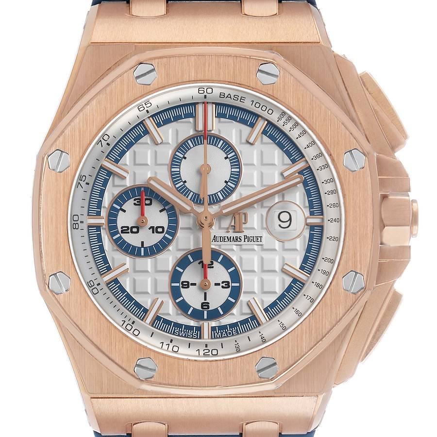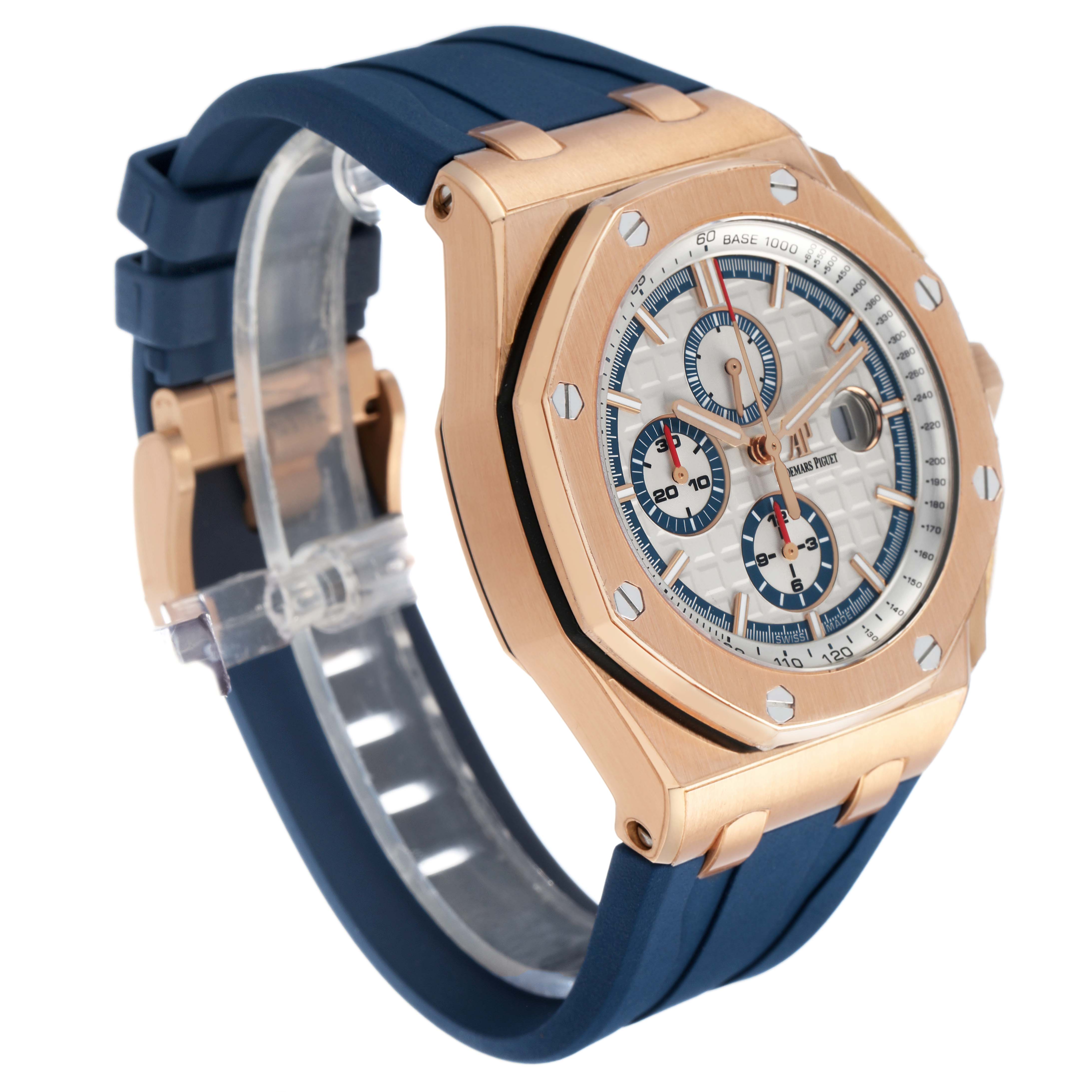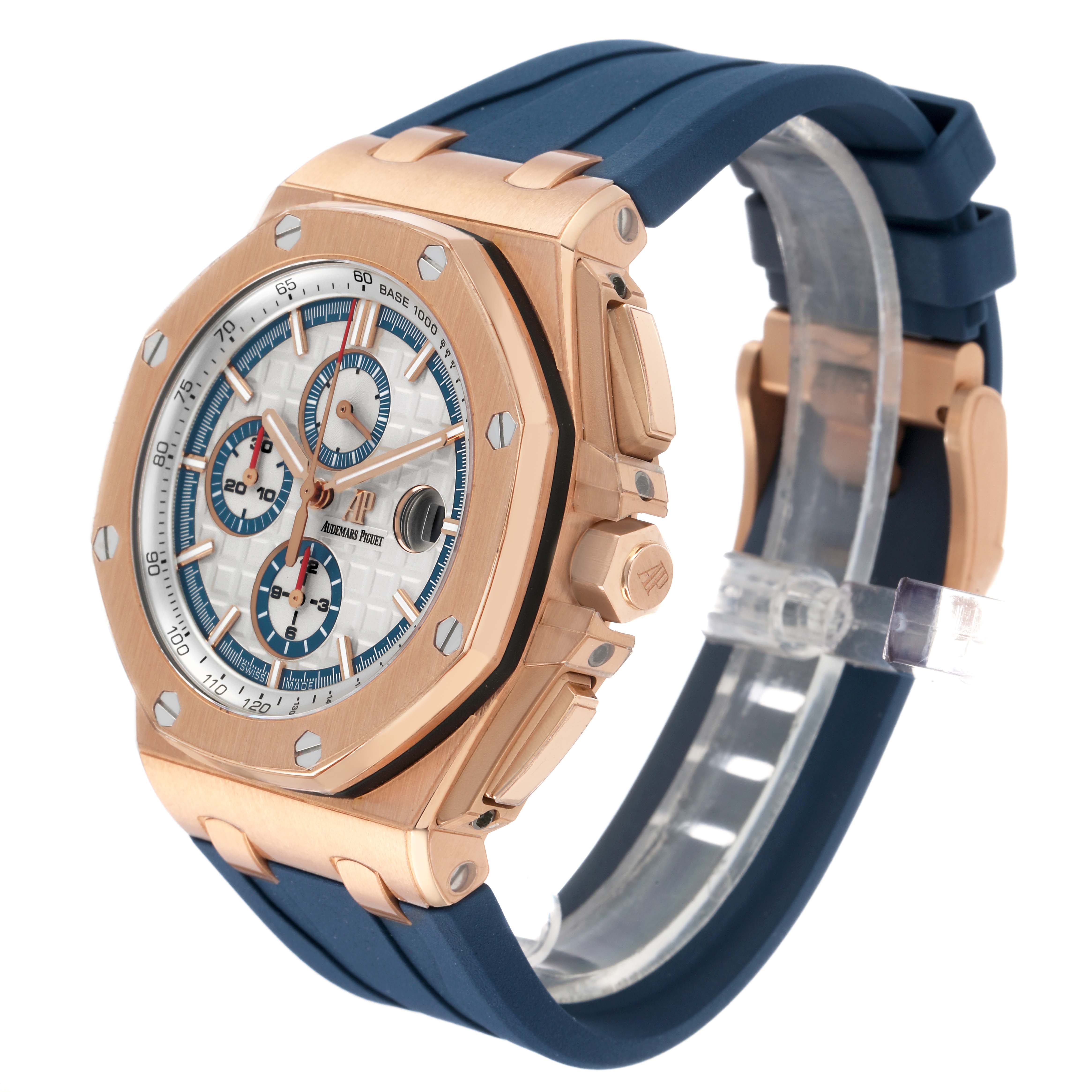 Audemars Piguet Royal Oak Offshore Rose Gold Mens Watch 26408OR Box Papers. Automatic self-winding chronograph movement. 18k rose gold octagonal case 44 mm in diameter. Exhibition sapphire crystal case back. Rose gold crown with a brushed rose gold center and engraved AP logo. Rose gold chronograph pushers. Limited edition. Fixed 18-carat rose gold bezel punctuated with 8 signature screws. Scratch resistant sapphire crystal. Silver-toned dial with Mega Tapisserie waffle pattern, baton hour markers and hands with luminous fill. Central Seconds hand. Date window at 3 o'clock aperture. Tachymeter scale around the inner bezel. Three chronograph sub-dials -- 60 second, 30 minute, and 12 hour. Blue rubber strap with an 18k rose gold tang buckle. Additional white rubber strap.
