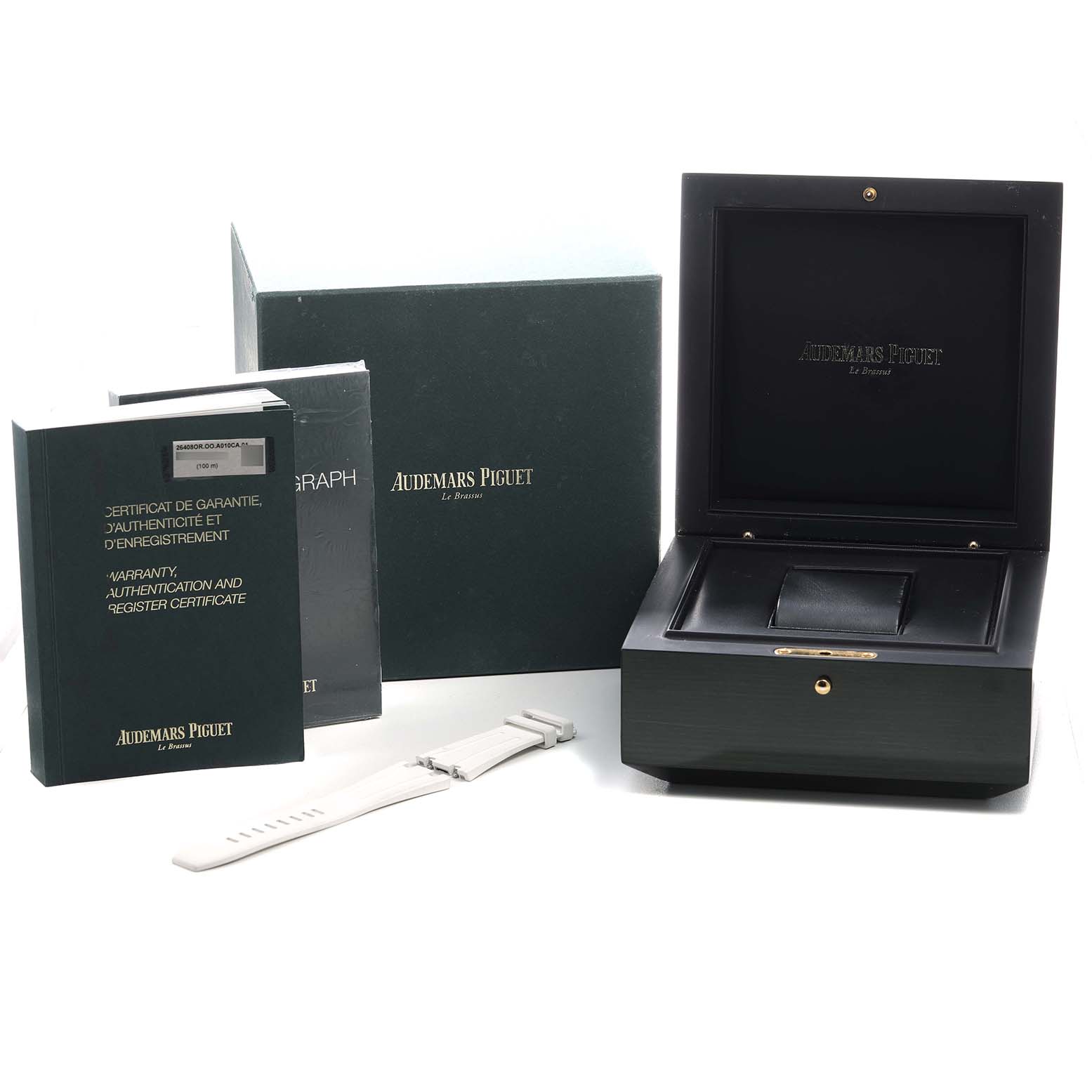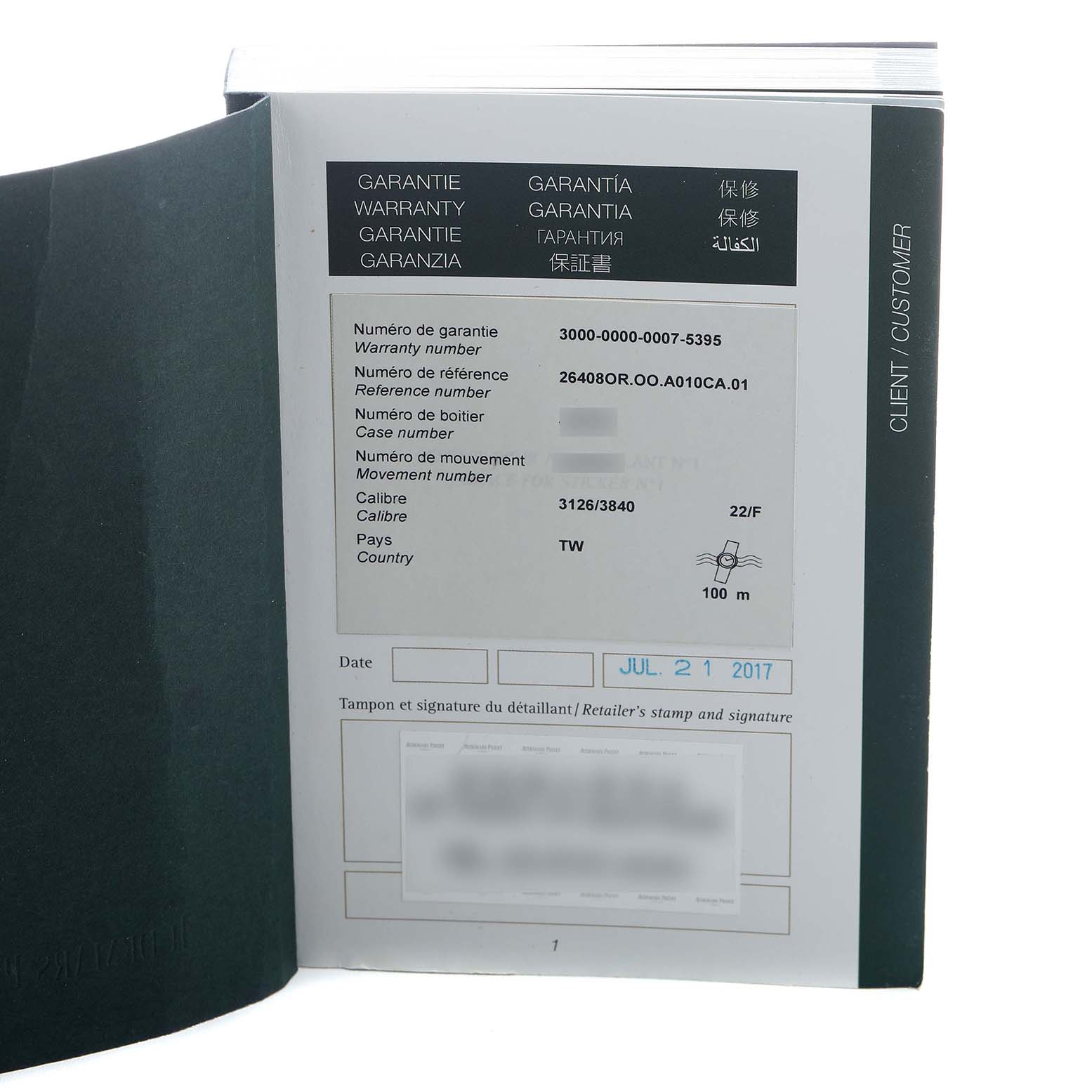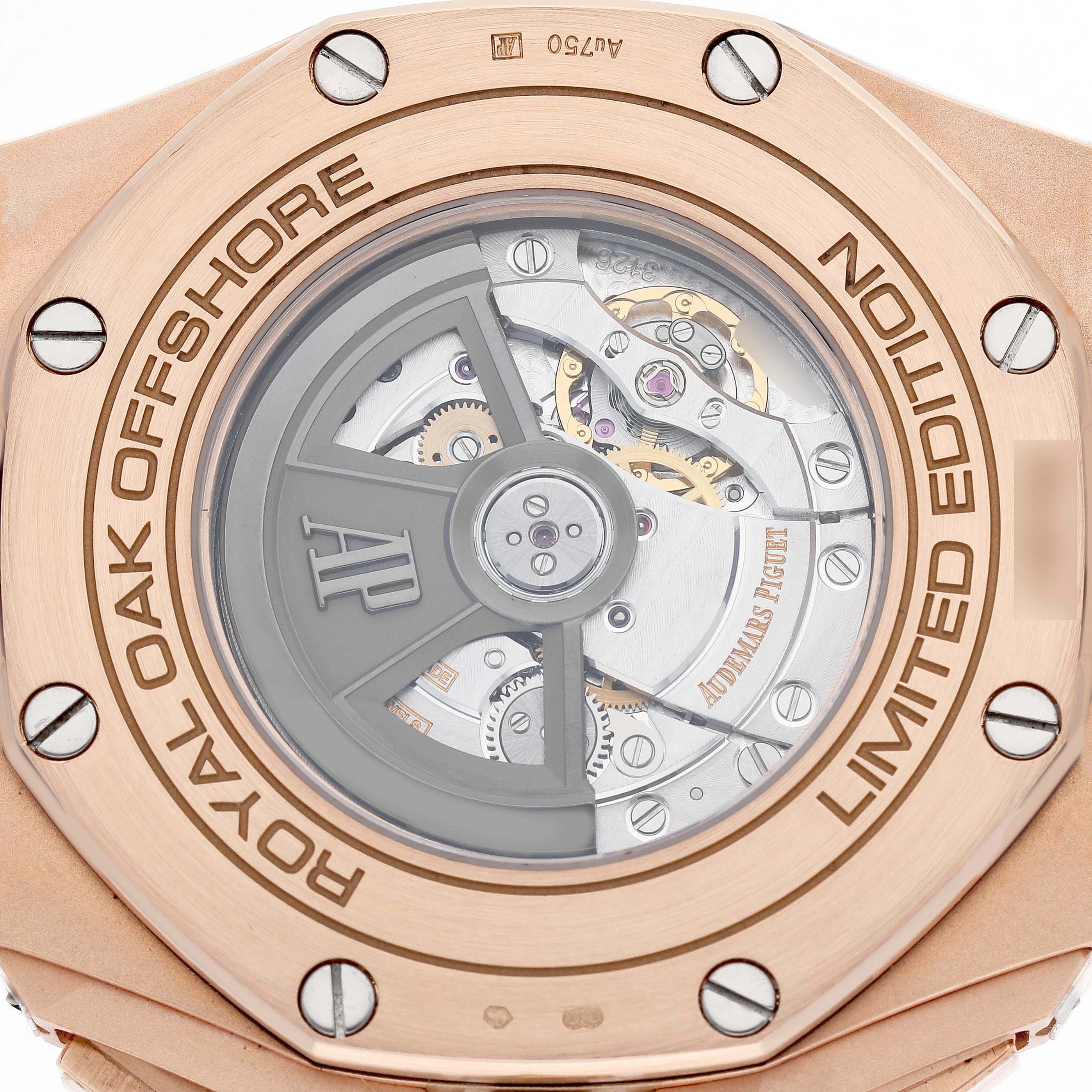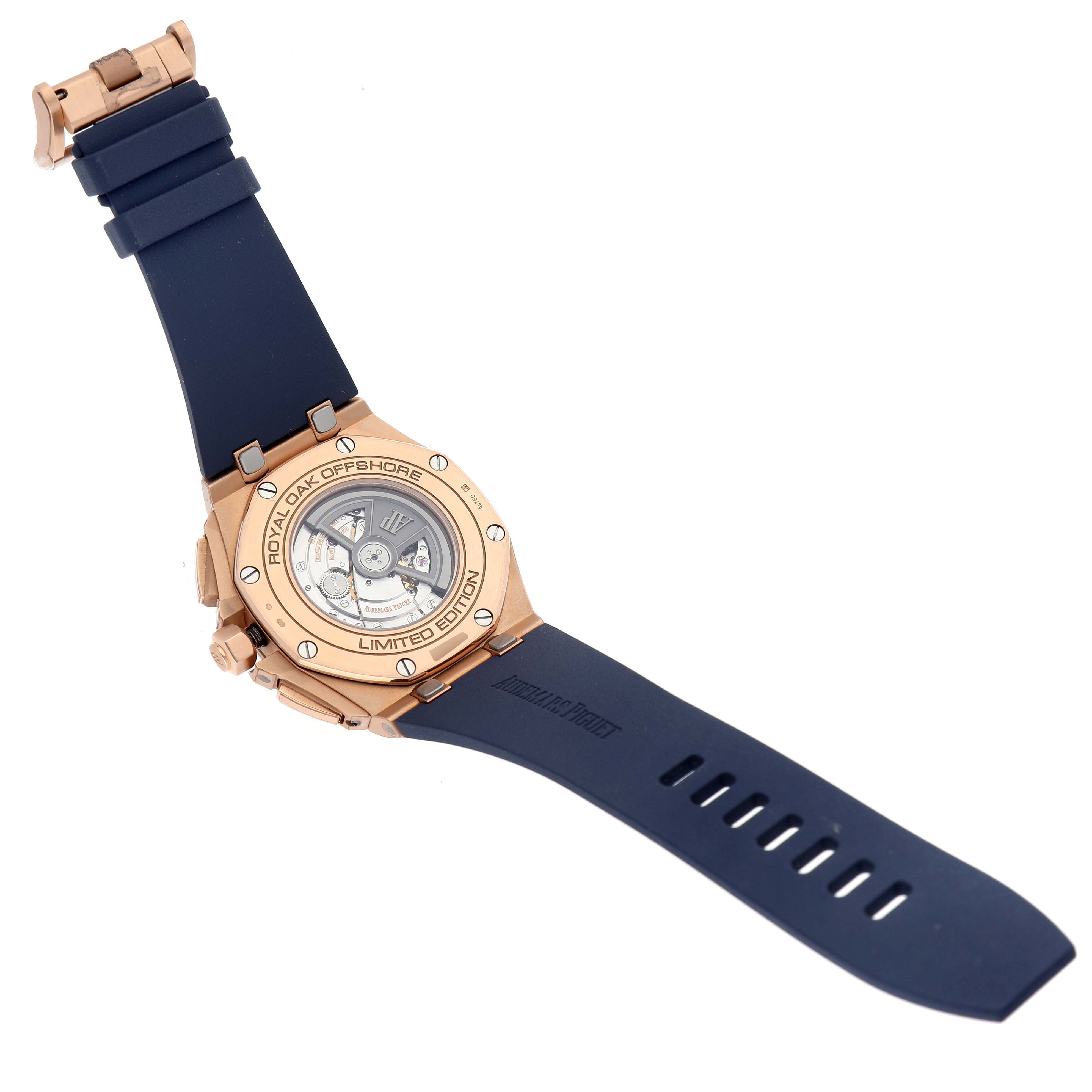 Audemars Piguet Royal Oak Offshore Rose Gold Mens Watch 26408OR Box Papers. Automatic self-winding chronograph movement. 18k rose gold octagonal case 44 mm in diameter. Exhibition sapphire crystal case back. Rose gold crown with a brushed rose gold center and engraved AP logo. Rose gold chronograph pushers. Limited edition. Fixed 18-carat rose gold bezel punctuated with 8 signature screws. Scratch resistant sapphire crystal. Silver-toned dial with Mega Tapisserie waffle pattern, baton hour markers and hands with luminous fill. Central Seconds hand. Date window at 3 o'clock aperture. Tachymeter scale around the inner bezel. Three chronograph sub-dials -- 60 second, 30 minute, and 12 hour. Blue rubber strap with an 18k rose gold tang buckle. Additional white rubber strap.