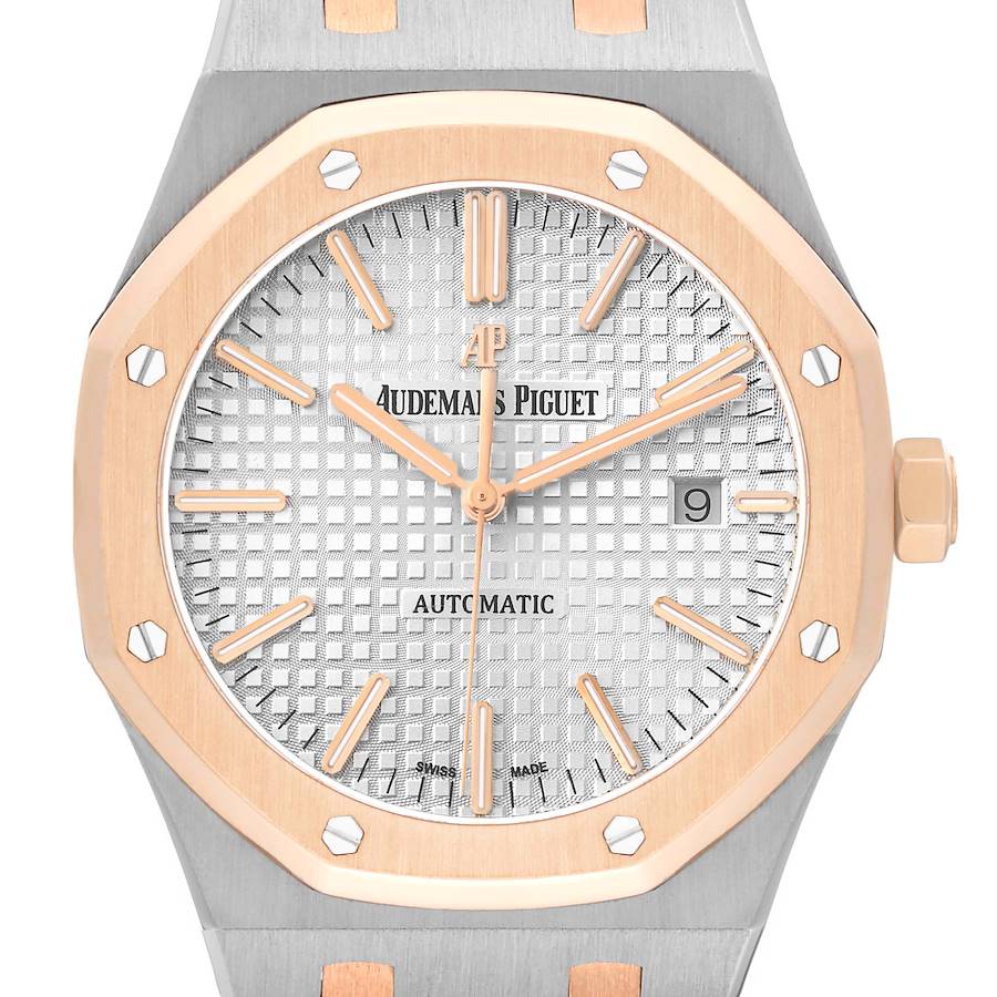 Audemars Piguet Royal Oak Steel Rose Gold Mens Watch 15400SR. Automatic self-winding movement. Stainless steel case 41.0 mm in diameter. AP logo on an 18k rose gold crown. Transparent exhibition sapphire crystal case back. 18k rose gold bezel punctuated with 8 signature screws. Scratch resistant sapphire crystal. Silver Grande Tapisserie dial with 18k rose gold luminous baton hour markers. Sweep second hand. Date window at 3 o'clock position. Stainless steel and 18k rose gold bracelet with AP folding clasp. Fits 7 3/4" wrist.