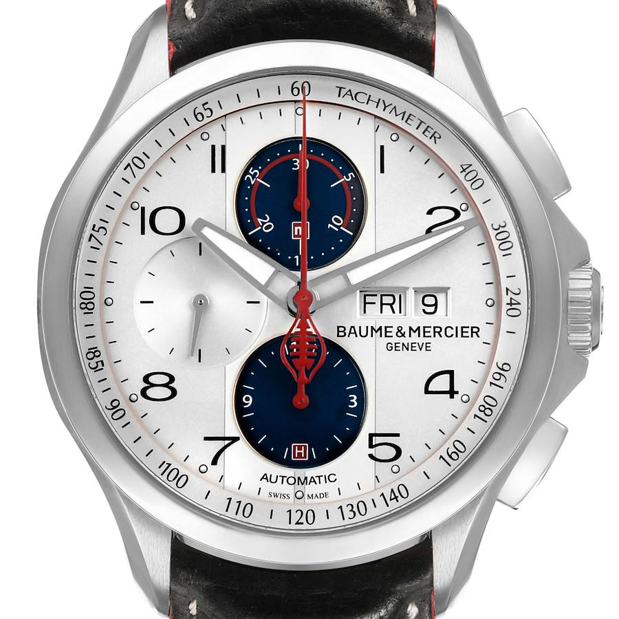 Baume Mercier Clifton Club Shelby Cobra 1964 LE Steel Mens Watch Watch 65822. Automatic self-winding chronograph movement. Shelby Cobra Daytona Coupe Wheel-style automatic rotor. Stainless steel case 44.0 mm in diameter. Exhibition sapphire crystal case back. Chronograph push buttons look like foot pedals. The red chronograph seconds hand has the Cobra logo. . Scratch resistant sapphire crystal. Silver dial with arabic numerals. Day of the week and date display at the 3 o'clock. Three chronograph sub-dials -- 60 second, 30 minute and 12 hour. Black leather strap with stainless steel double trigger deployant buckle.