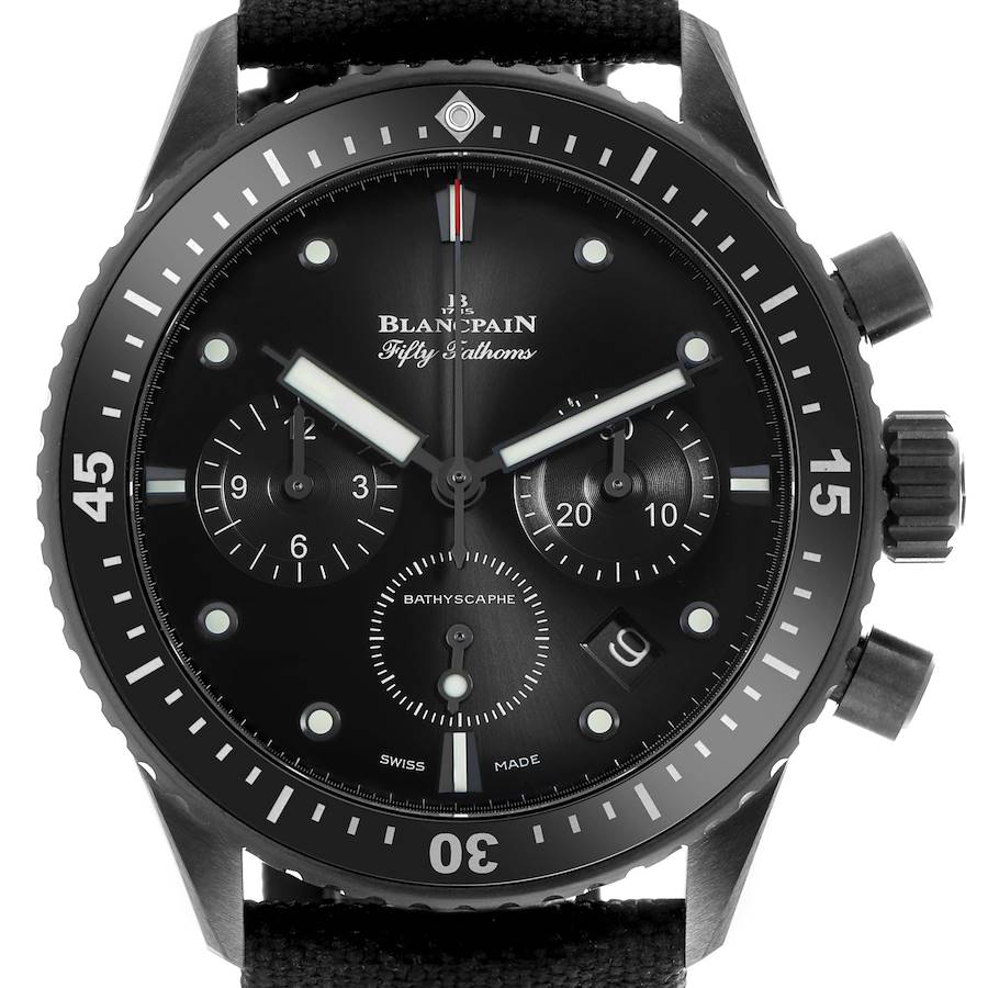 Blancpain Fifty Fathoms Bathyscaphe Black Dial Ceramic Mens Watch 5200 Box Card. Automatic self-winding chronograph movement. Black ceramic case 43.0 mm in diameter. Case thickness: 15.25mm. Transparent exhibition sapphire crystal case back. Black coin edge uni-directional turning ceramic bezel with with ceramic insert and Liquidmetal minute markers. Scratch resistant sapphire crystal. Black dial with luminous round and baton index hour markers. Luminescent sword shape hands. Date window between the 4 and 5 o'clock. Three chronograph sub-dials -- running 60 seconds, 30 minute and 12 hour. Red tipped center chronograph seconds hand. Black Sail canvas strap strap with ceramic tang buckle.