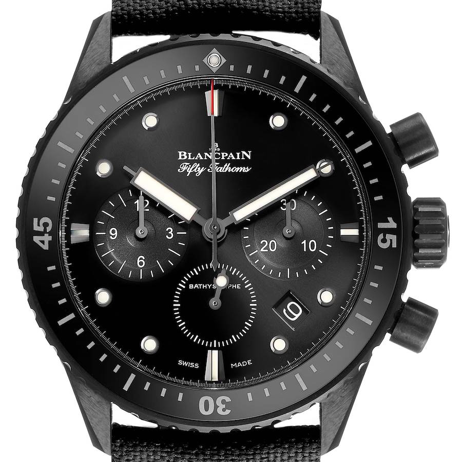 Blancpain Fifty Fathoms Bathyscaphe Black Dial Ceramic Mens Watch 5200 Box Card. Automatic self-winding chronograph movement. Black ceramic case 43.0 mm in diameter. Case thickness: 15.25mm. Transparent exhibition sapphire crystal case back. Black coin edge uni-directional turning ceramic bezel with with ceramic insert and Liquidmetal minute markers. Scratch resistant sapphire crystal. Black dial with luminous round and baton index hour markers. Luminescent sword shape hands. Date window between the 4 and 5 o'clock. Three chronograph sub-dials -- running 60 seconds, 30 minute and 12 hour. Red tipped center chronograph seconds hand. Black Sail canvas strap strap with ceramic tang buckle.