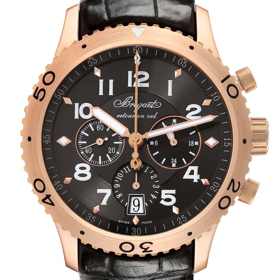 Breguet Type XXI Flyback 18K Rose Gold Chronograph Mens Watch 3810BR Box Papers. Automatic self-winding movement with a flyback chronograph function (allows instant restarting of the chronograph with a single push of the button instead of stop and reset the stop-watch). 18k rose gold round case 42.5 mm in diameter. Screw-down crown. Solid case back. Case thickness 15.4 mm. 18k rose gold bi-directional rotating bezel. Scratch resistant sapphire crystal. Grey ruthenium dial with luminous Arabic numerals and hands. Minute markers around the outer rim. Date window at the 6 o'clock. Three sub-dials -- 60 seconds, 60 minutes, 12 hours. Black leather strap with 18k rose gold deployant buckle.