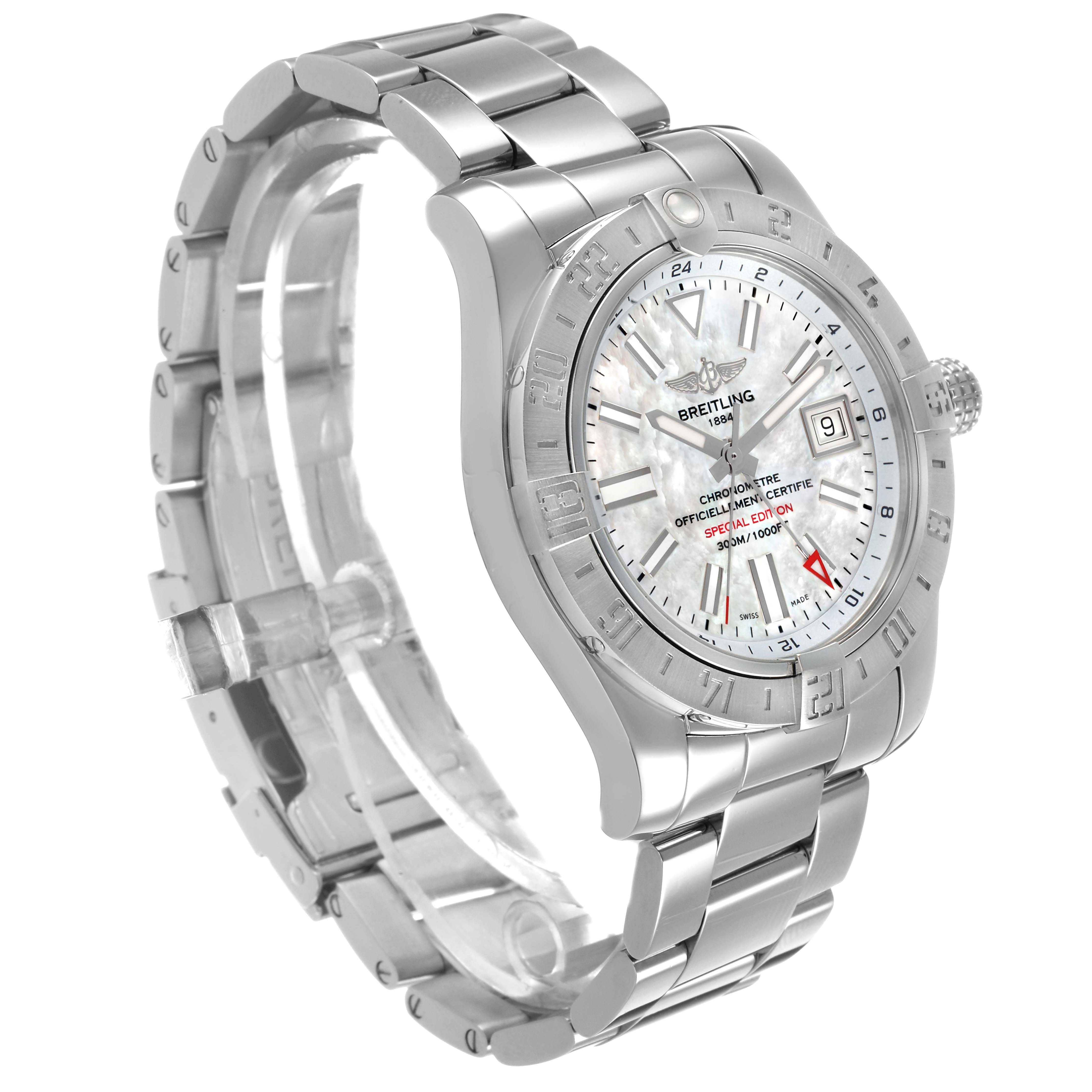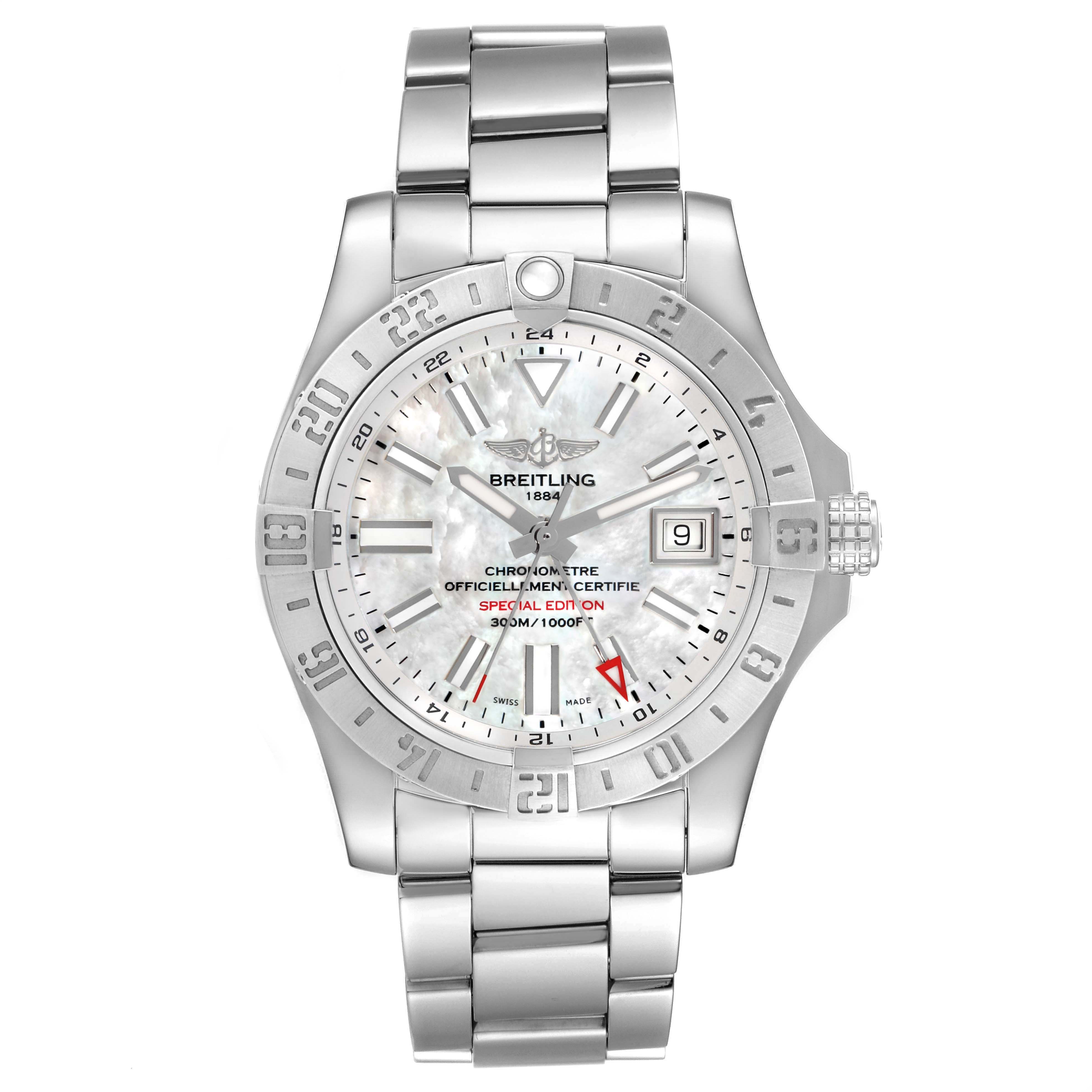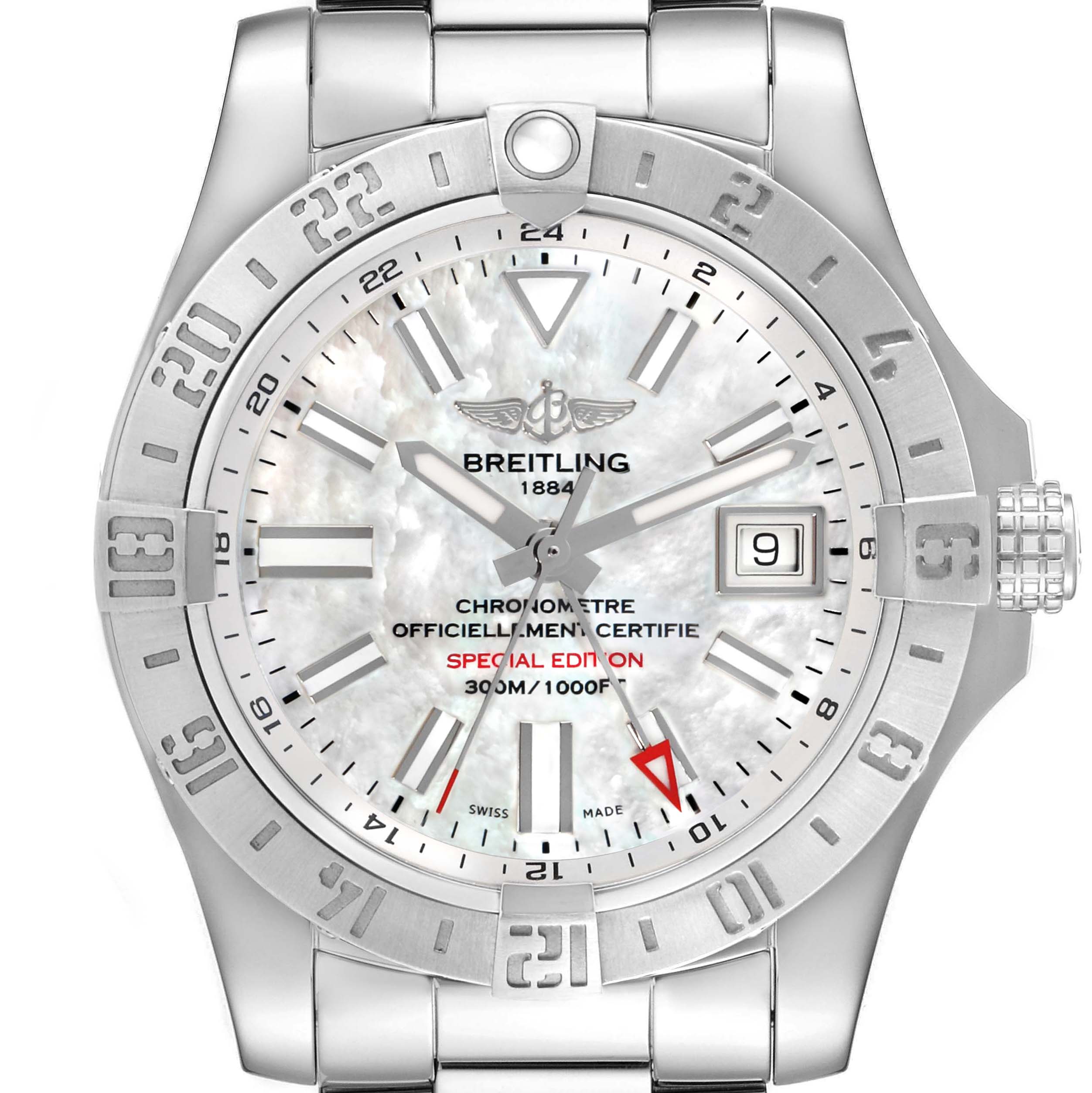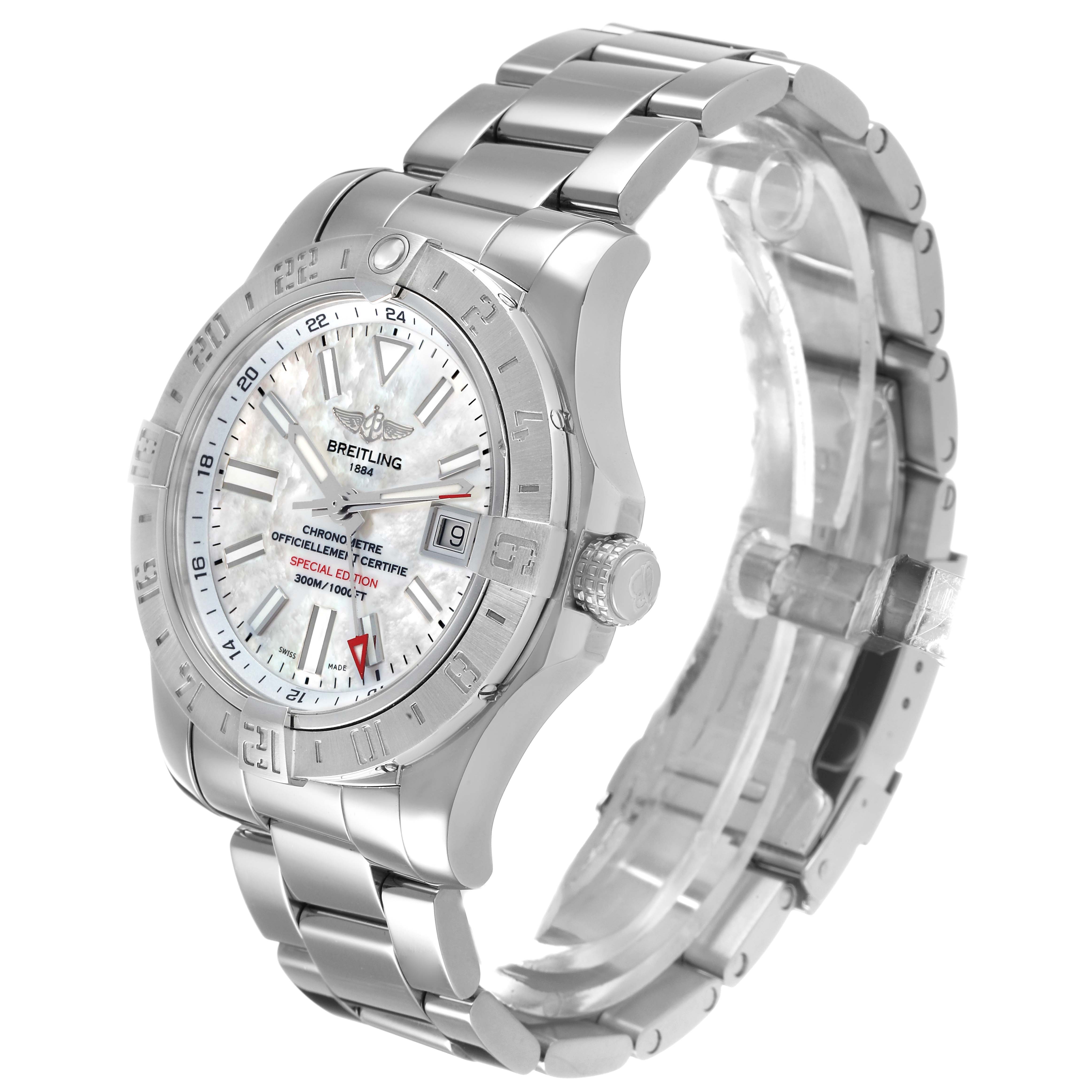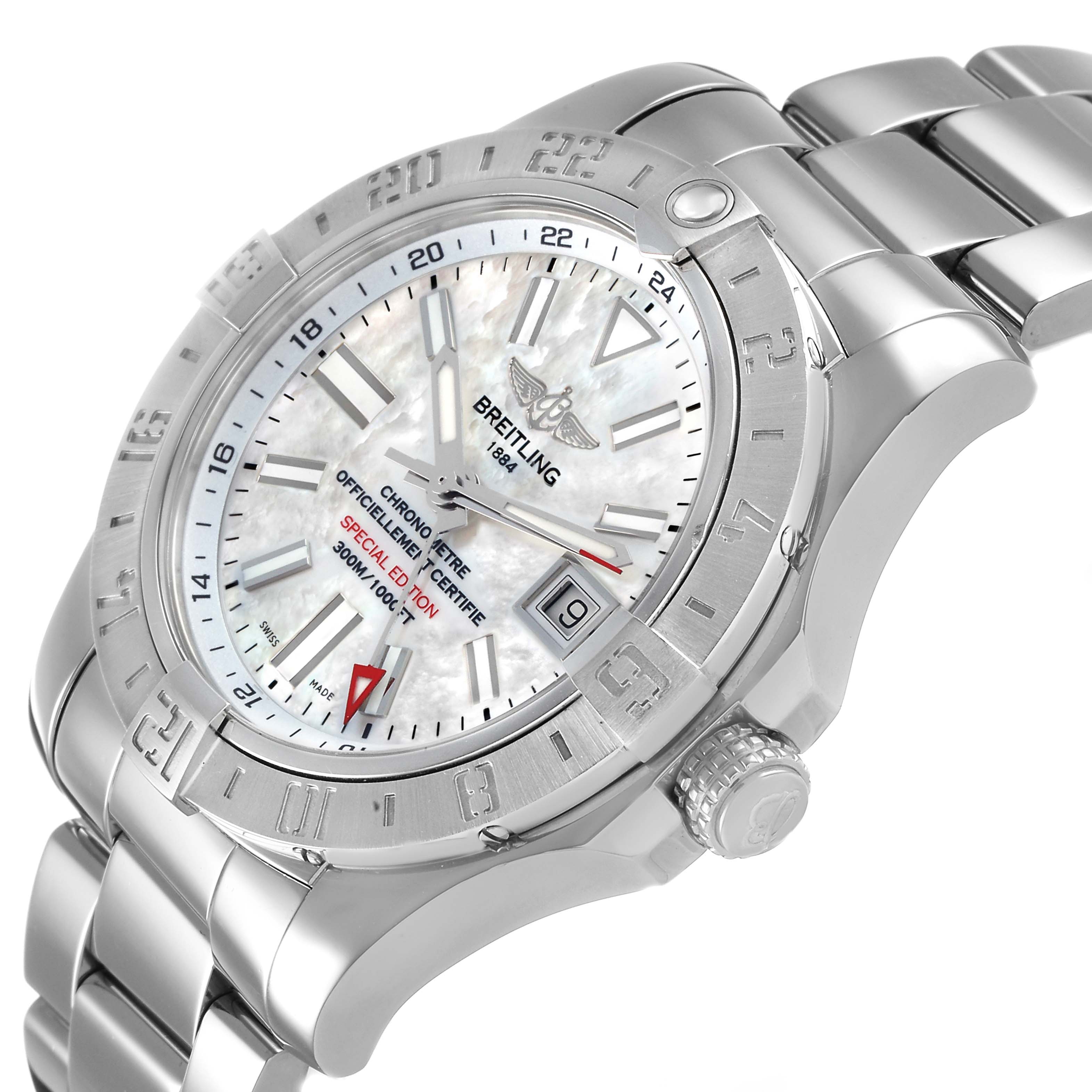 Breitling Aeromarine Avenger II GMT MOP Mens Watch A32390 Box Card. Officially certified automatic self-winding movement with GMT function. Stainless steel round case 43.0 mm in diameter. Breitling logo on a screw-down crown. Pointed crown guards. Stainless steel bidirectional rotating bezel. 0-60 elapsed-time. Four 15 minute markers. Scratch resistant sapphire crystal. Mother of pearl dial with luminescent sword-shaped hands and baton hour markers. Date aperture at 3 o’clock. Luminescent red arrow GMT hand. Outer GMT track. Stainless steel bracelet with a flip-lock clasp. Fits an 8 1/2" wrist.