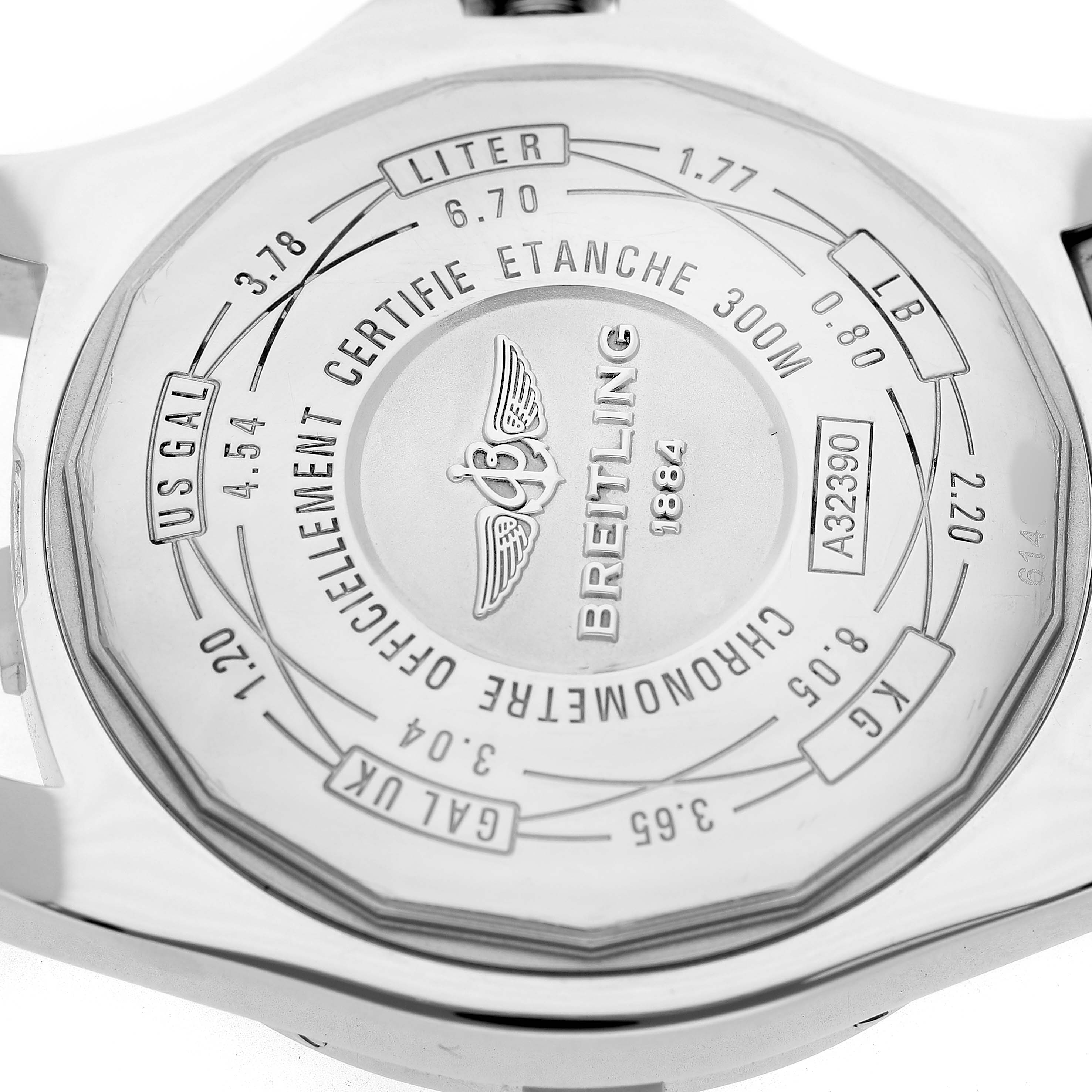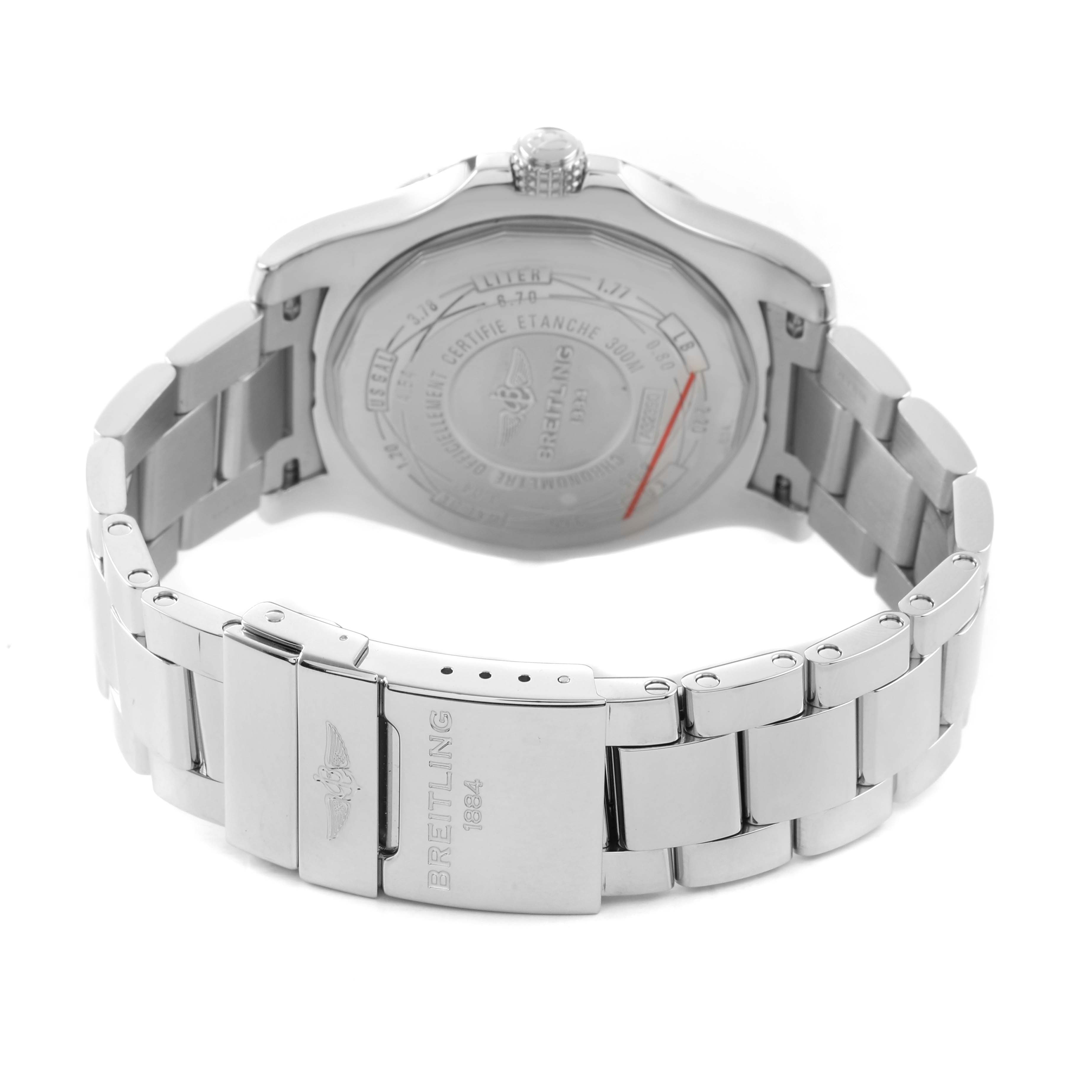 | Case: | Stainless steel round case 43.0 mm in diameter. Breitling logo on a screw-down crown. Pointed crown guards. |