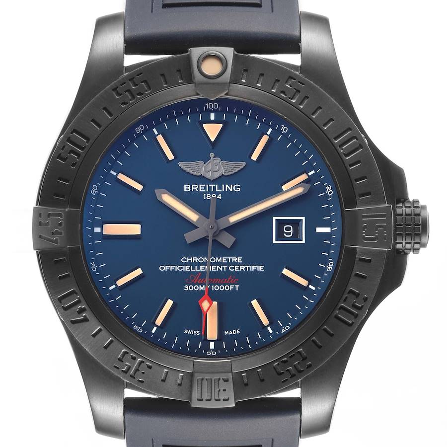 Breitling Avenger Blackbird 48 Blue Dial Titanium DLC Mens Watch V17310 Box Card. Officially certified automatic self-winding movement. Caliber B17. Titanium round case with carbon-based black DLC finish, 48.0 mm in diameter. Pointed crown guards. Breitling logo on the crown. Black unidirectional titanium bezel with engraved Arabic numerals and index markings for a 60-minute scale. Scratch resistant sapphire crystal. Blue matte dial with raised luminescent index hour markers and baton hands. Red arrow-tipped center seconds hand. Date aperture at 3 o’clock. White outer stick minute markers. Blue rubber strap with tang buckle.
