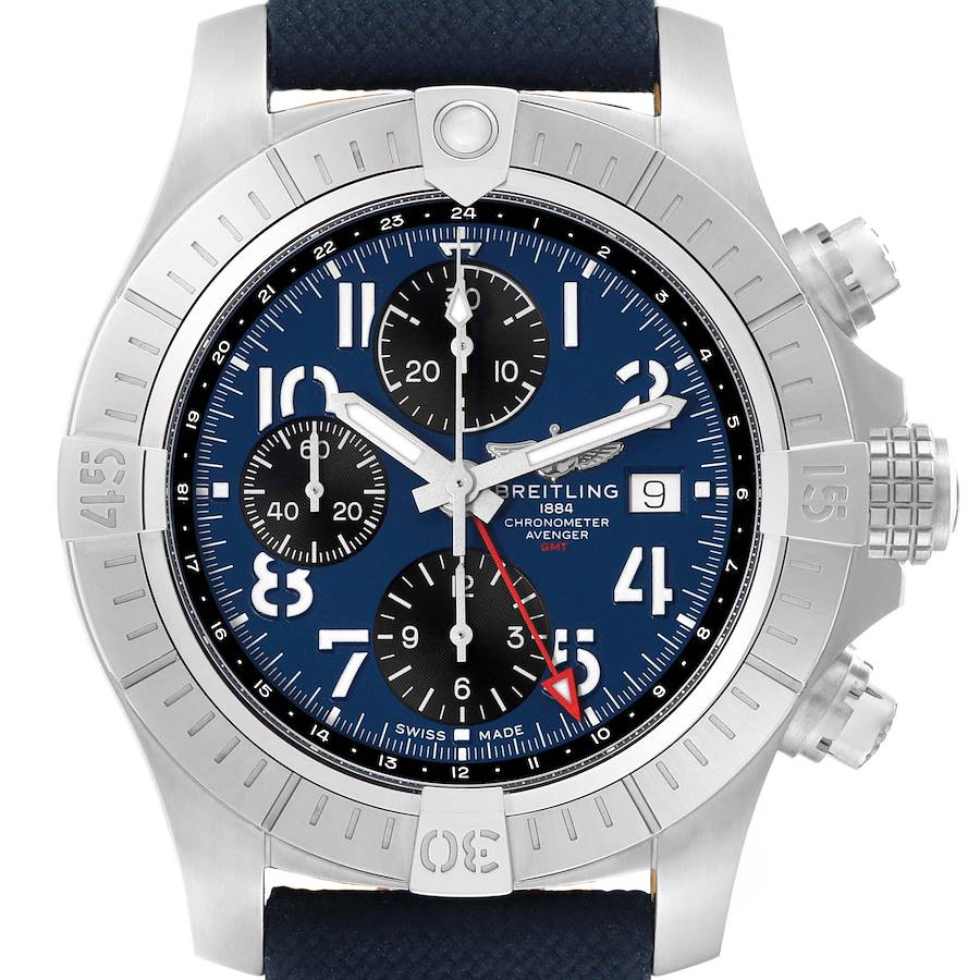 Breitling Avenger Chronograph GMT 45 Steel Mens Watch A24315. Automatic self-winding movement. Chronograph function. Stainless steel case 45 mm in diameter with screwed-down crown and pushers. Stainless steel unidirectional rotating bezel. 0-60 elapsed-time. Four 15 minute markers. Scratch resistant sapphire crystal. Blue dial with white Arabic numerals. Date aperture at 3 o’clock. Luminous baton hands. Large red-tipped central chronograph seconds hand. Three black chronograph subdials -- 30 minutes, 12 hours, and small seconds. Blue canvas and leather strap with stainless steel tang buckle.