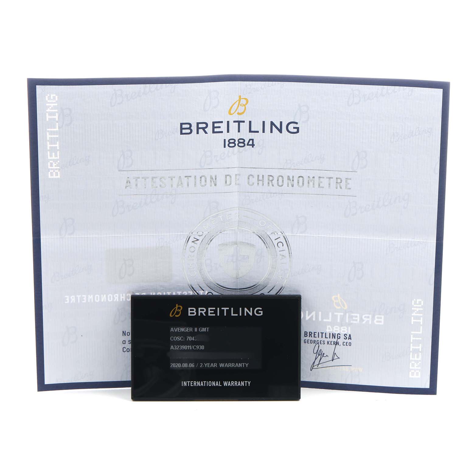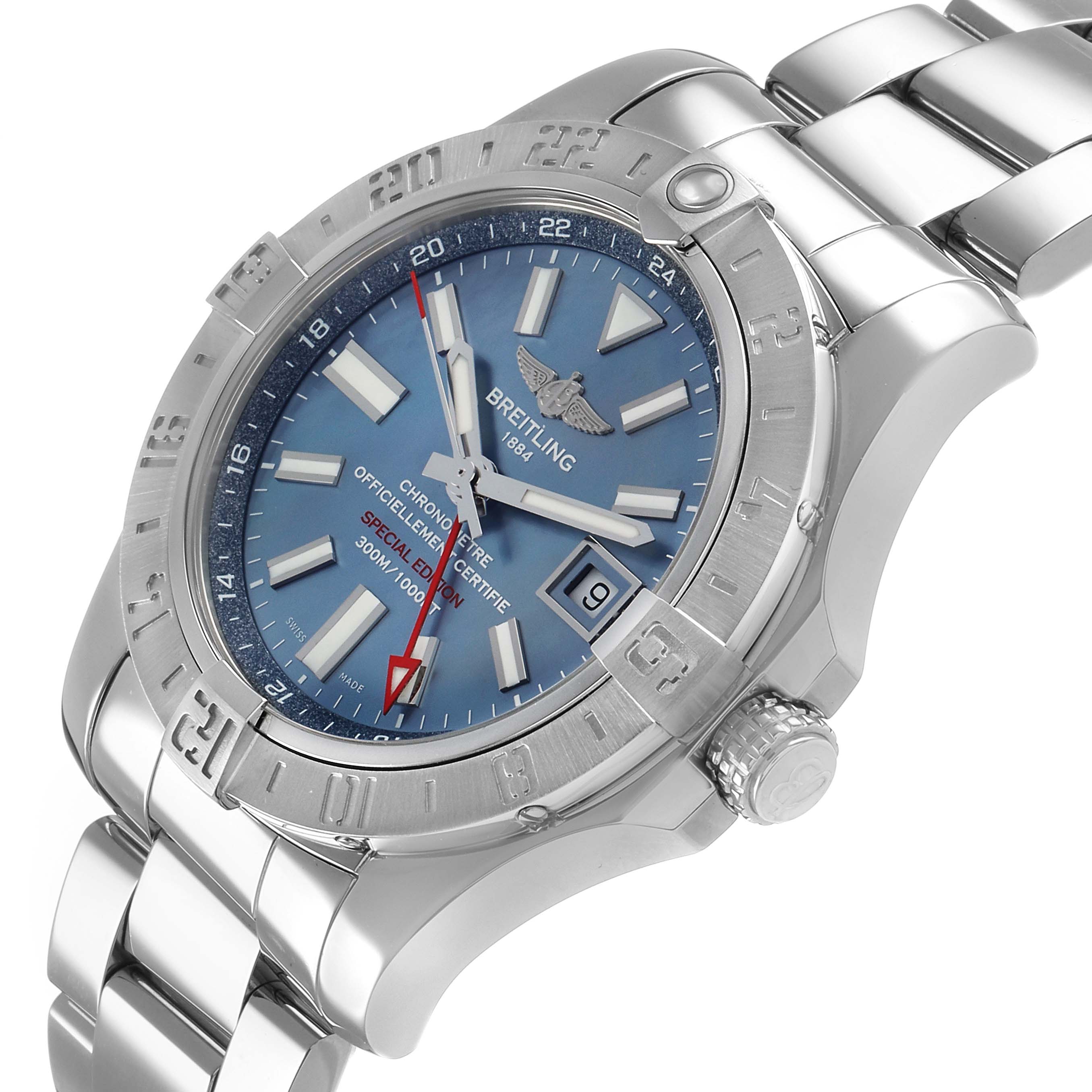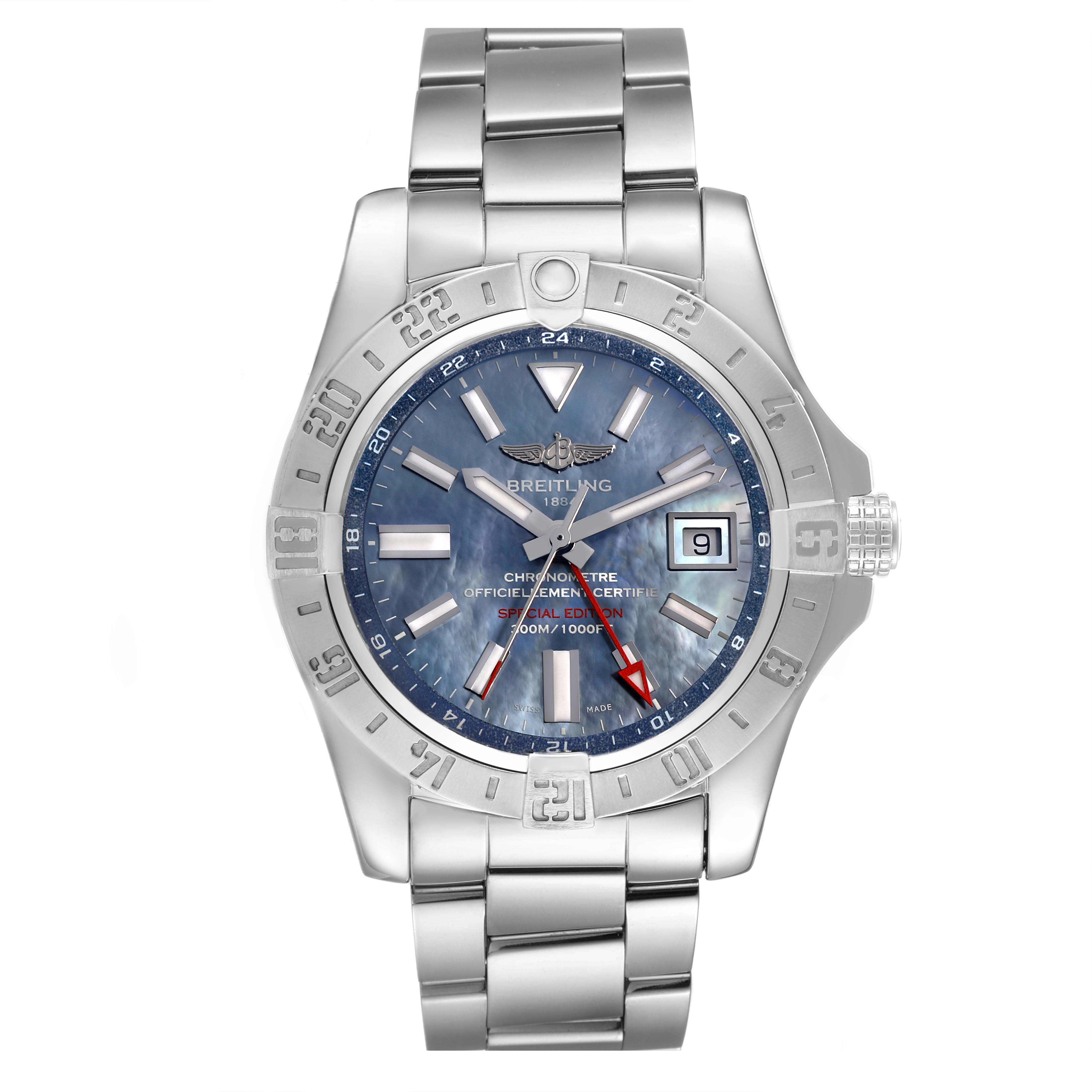 Breitling Avenger II GMT Steel Blue MOP Dial Mens Watch A32390 Box Card. Officially certified chronometer automatic self-winding movement with GMT function. Stainless steel round case 43.0 mm in diameter. Breitling logo on the screw-down crown. Pointed crown guards. Stainless steel bidirectional rotating bezel engraved with the 24-hour scale. Scratch resistant sapphire crystal. Blue mother-of-pearl dial with luminescent baton hour markers and sword-shaped hands. Date calendar at the 3 o'clock aperture. Luminescent red arrow GMT hand. Stainless steel bracelet with a flip-lock clasp. Fits an 8 3/4" wrist.