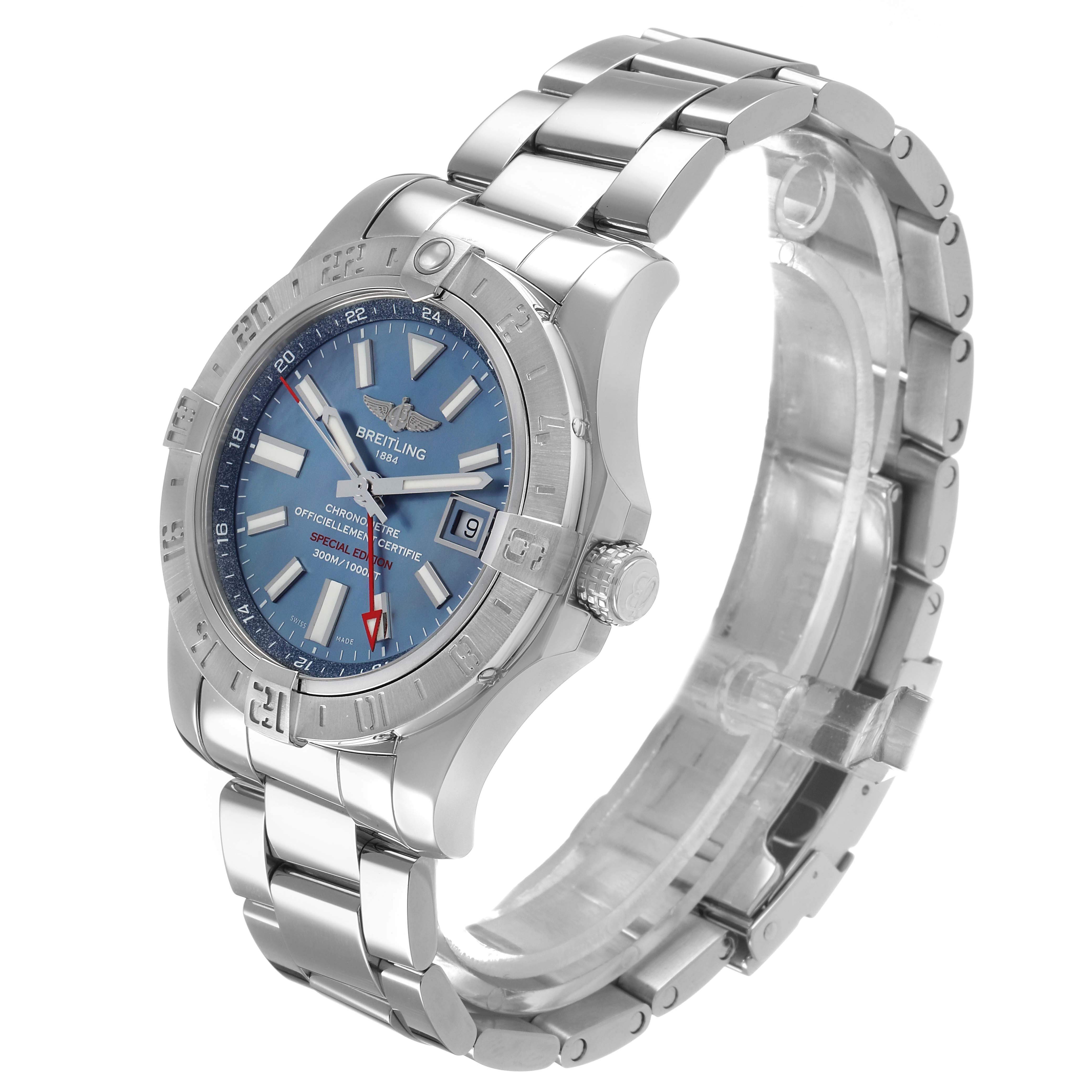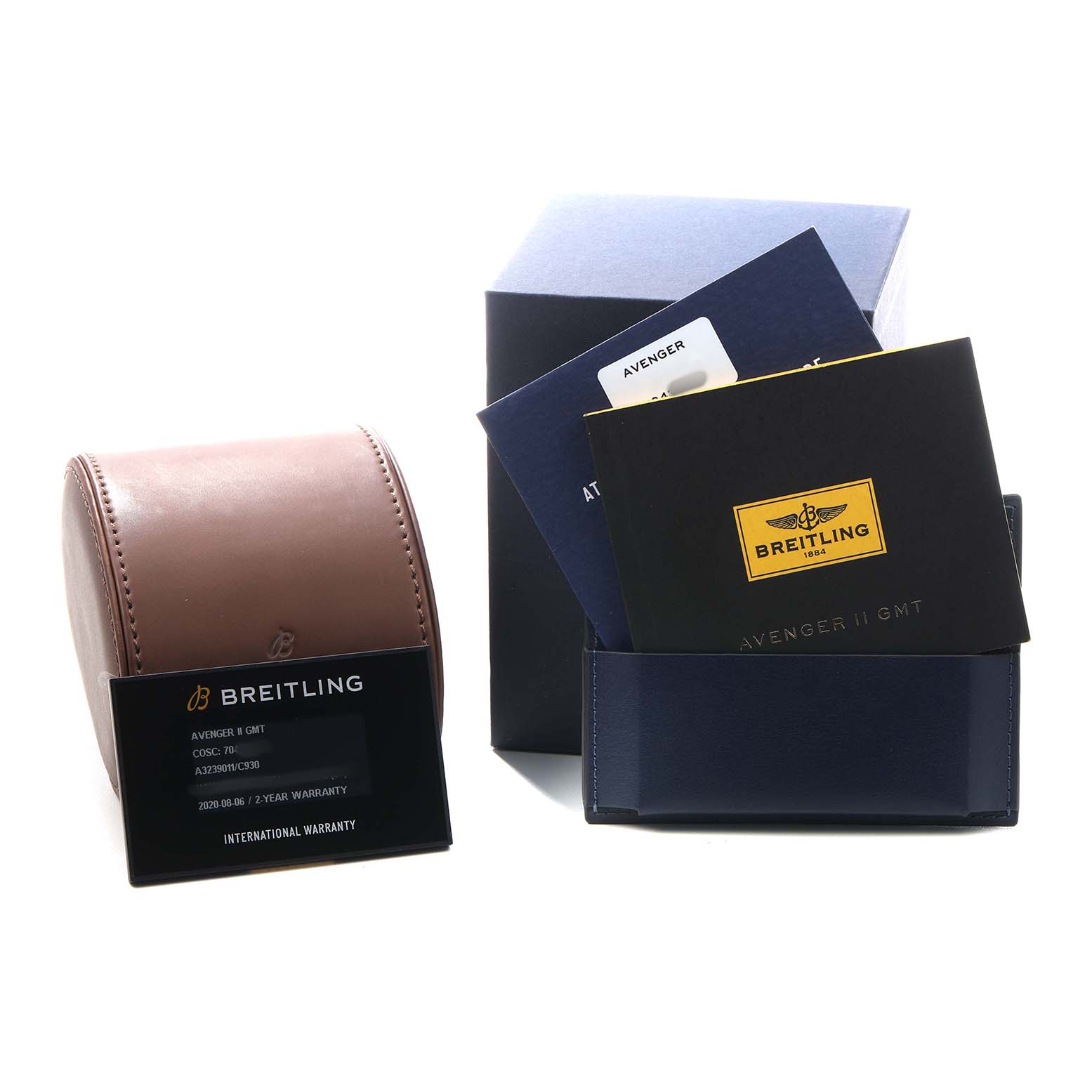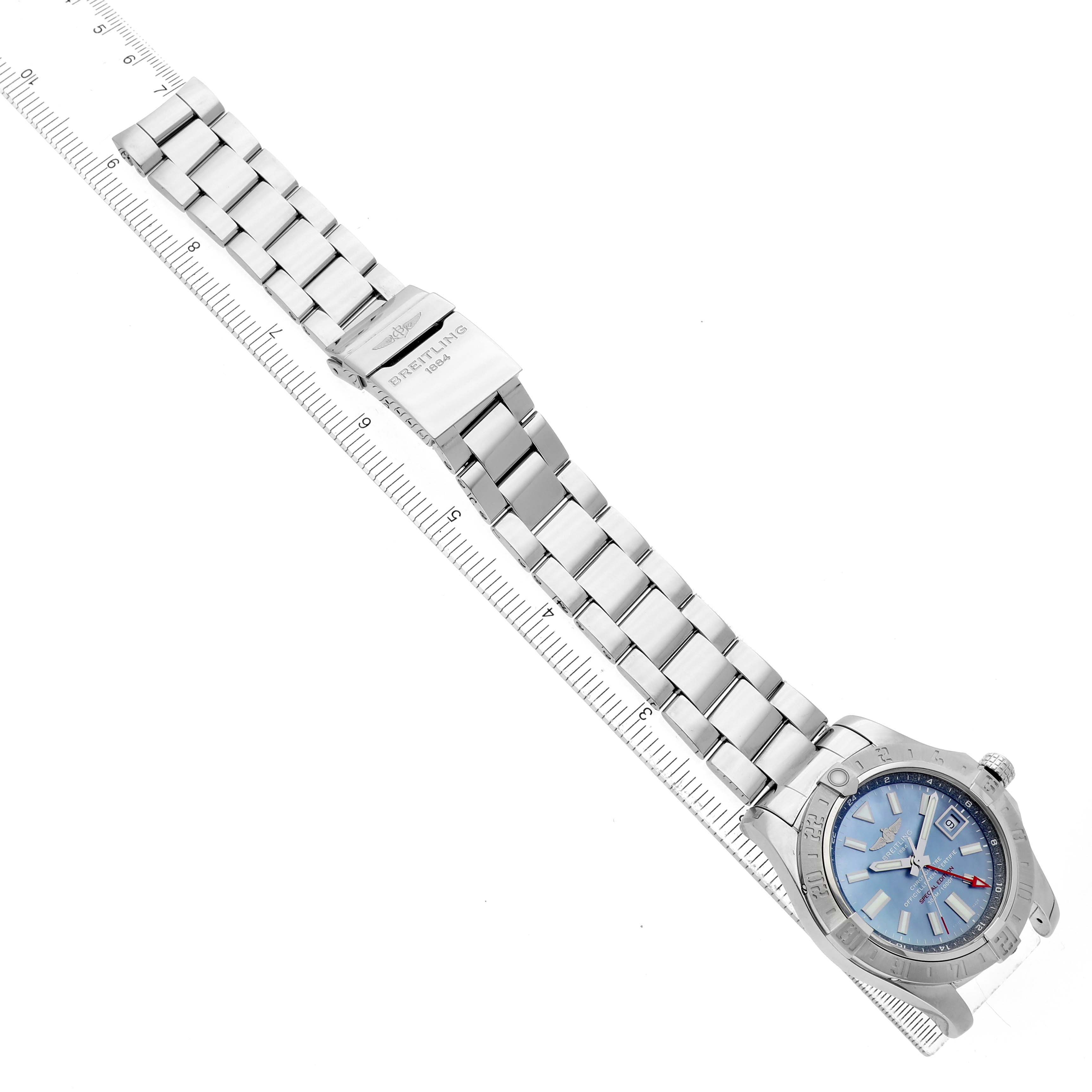 Breitling Avenger II GMT Steel Blue MOP Dial Mens Watch A32390 Box Card. Officially certified chronometer automatic self-winding movement with GMT function. Stainless steel round case 43.0 mm in diameter. Breitling logo on the screw-down crown. Pointed crown guards. Stainless steel bidirectional rotating bezel engraved with the 24-hour scale. Scratch resistant sapphire crystal. Blue mother-of-pearl dial with luminescent baton hour markers and sword-shaped hands. Date calendar at the 3 o'clock aperture. Luminescent red arrow GMT hand. Stainless steel bracelet with a flip-lock clasp. Fits an 8 3/4" wrist.