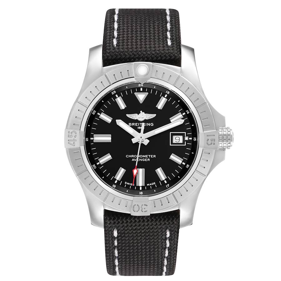 Breitling Avenger Steel Black Dial Mens Watch A17318. Automatic self-winding movement. Stainless steel round case 43.0 mm in diameter. Breitling logo on the screw-down crown. Stainless steel unidirectional rotating time-lapse bezel. Four 15-minute markers. Scratch resistant sapphire crystal. Black dial with luminescent index hour markers and sword-shaped hands. Date calendar at the 3 o’clock aperture. Luminescent arrow-tipped centre seconds hand. Black canvas strap with double push-button deployant clasp.