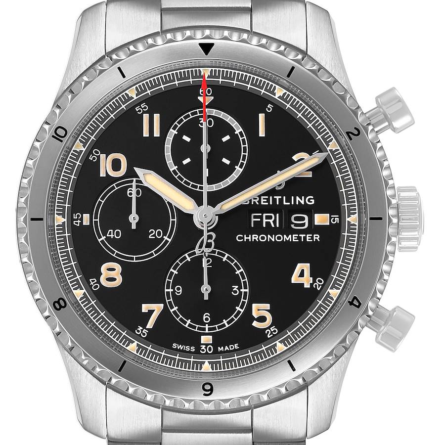 Breitling Aviator 8 Curtiss Warhawk Black Dial Steel Mens Watch A13316 Box Card. Self-winding automatic officially certified chronometer movement. Chronograph function. Stainless steel case 43.0 mm in diameter. Stainless steel bi-directional rotating dual-time bezel. Scratch resistant sapphire crystal. Black dial with luminous hands and Arabic numerals. 3 chronograph subdials -- 60 second, 30 minute, and 12 hour. Day and Date display at 3 o'clock. Stainless steel bracelet with flip-lock deployant clasp.
