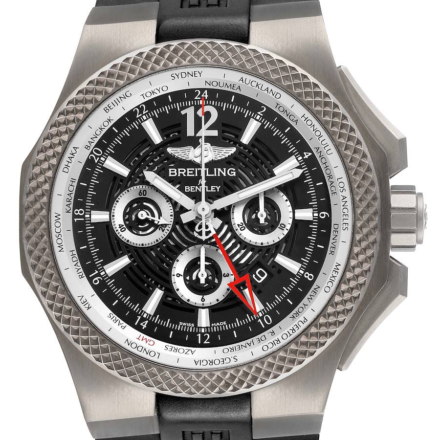 Breitling Bentley GMT Light Body B04 Titanium Mens Watch EB0432 Box Card. Self-winding automatic officially certified chronometer movement. Chronograph function. Titanium round case 45.0 mm in diameter. Breitling logo on the screwed-down crown. Two pushers operate the chronograph functions. Transparent exhibition sapphire crystal case back. Titanium crisscrossed bidirectional rotating bezel. Scratch resistant sapphire crystal. Skeletonized black dial. Luminescent baton hour markers and hands. Date calendar window between 4 and 5 o'clock. Three stepped-down subdials -- running seconds and the 30-minute and 12-hour chronograph registers. Large red tipped central chronograph seconds hand with the counterweight Breitling logo. Rotating pinion bezel with 24-timezone indication. Red skeletonized GMT hand. Black rubber strap with a titanium double push-button deployant clasp.