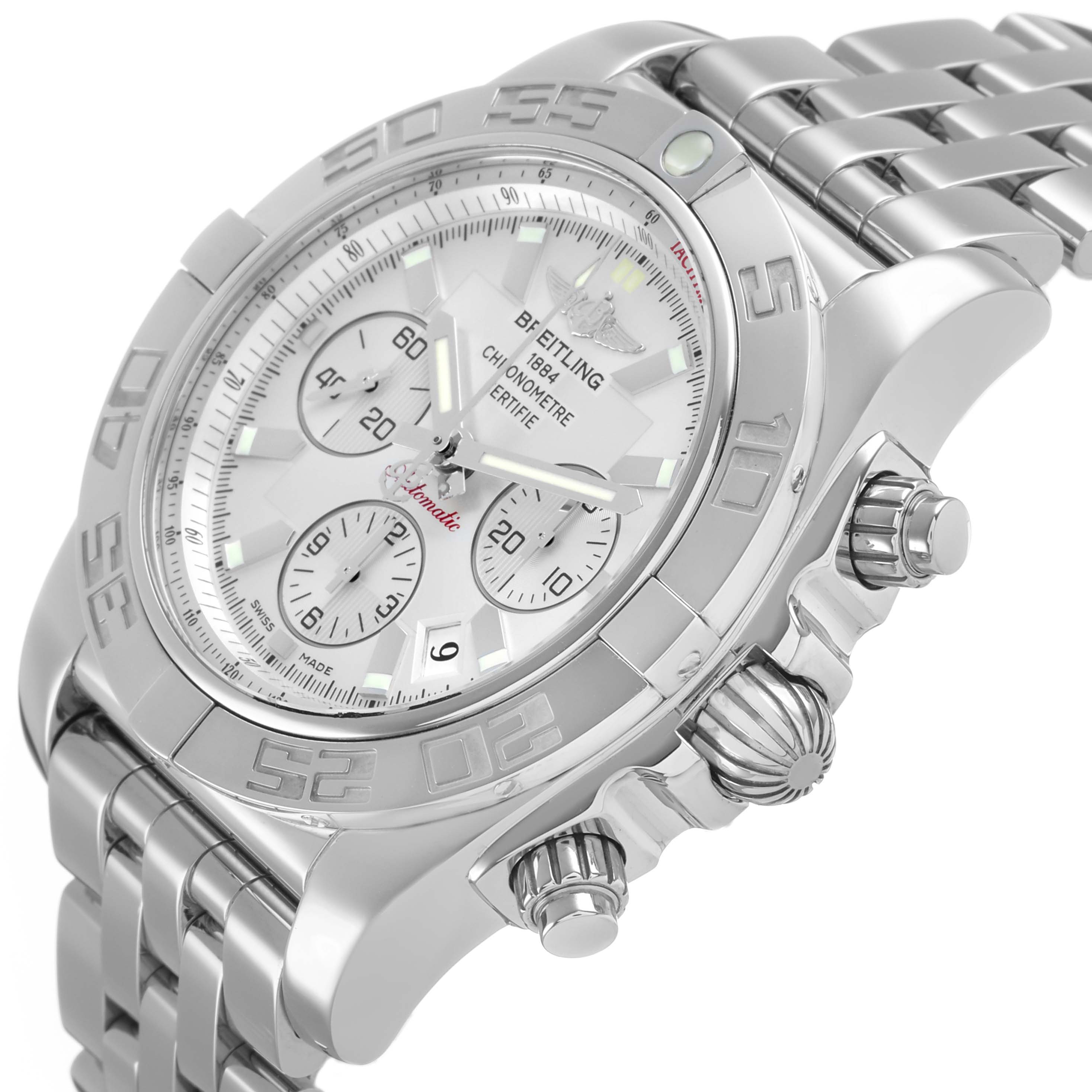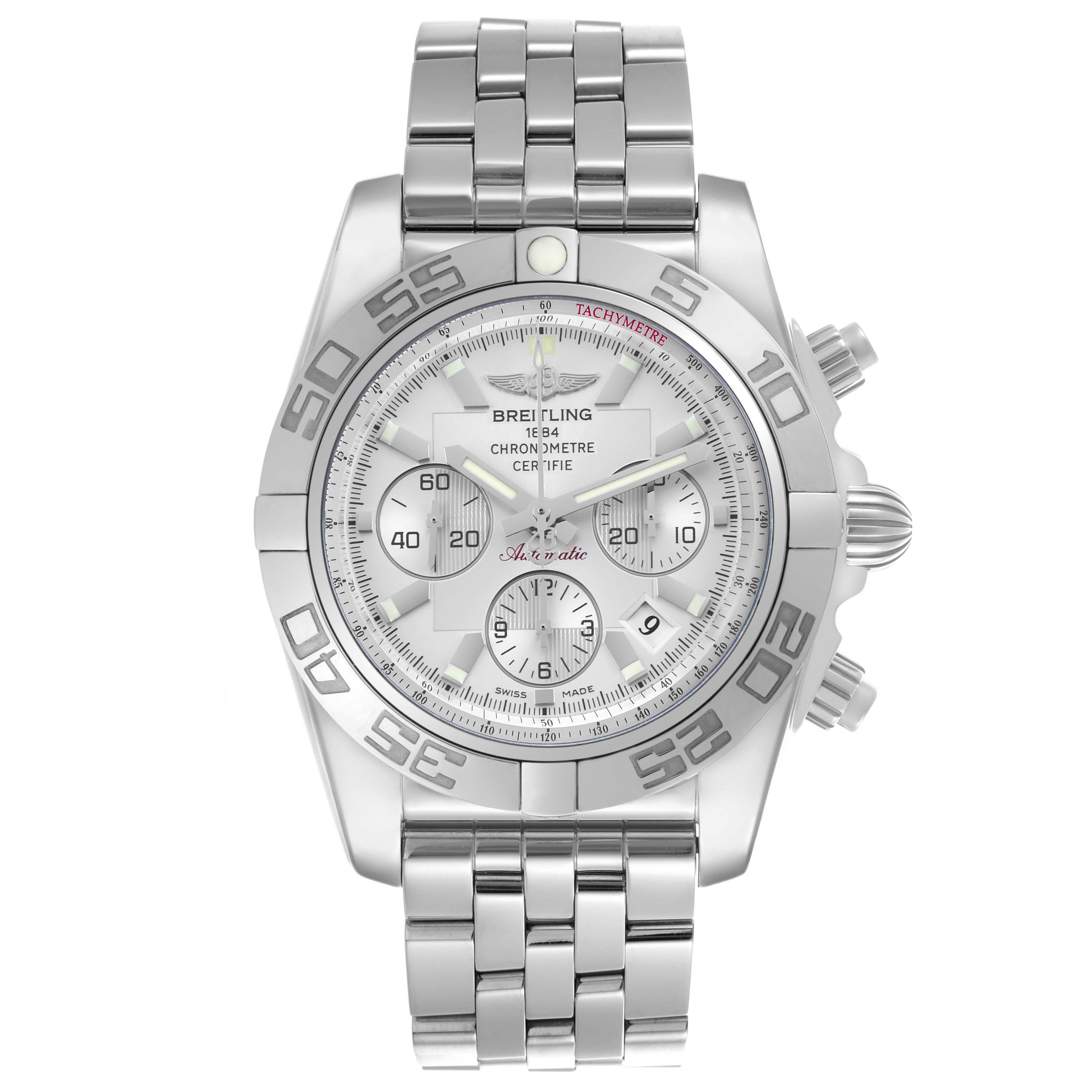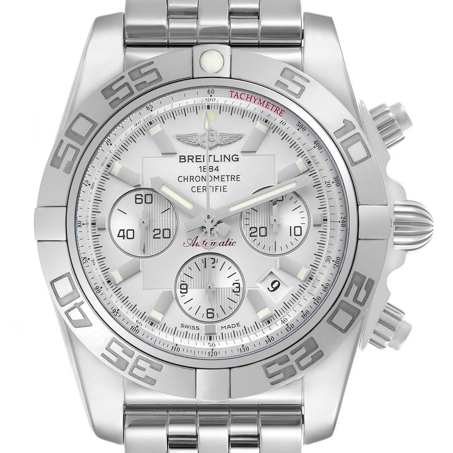 Breitling Chronomat 01 Steel Silver Dial Mens Watch AB0110. Self-winding automatic officially certified chronometer movement. Chronograph function. Stainless steel case 43.5 mm in diameter with screwed down crown and pushers. Stainless steel unidirectional rotating bezel. 0-60 elapsed-time. Four 15 minute markers. Scratch resistant sapphire crystal. Silver dial with raised baton hour markers. 3 chronograph subdials - 60 second, 30 minute and 12 hour. Luminous baton hands and hour markers. Tachymeter scale around the outer rim. Date display between the 4 and 5 o'clock. Stainless steel bracelet with deployent buckle. Fits 8.5" wrist.