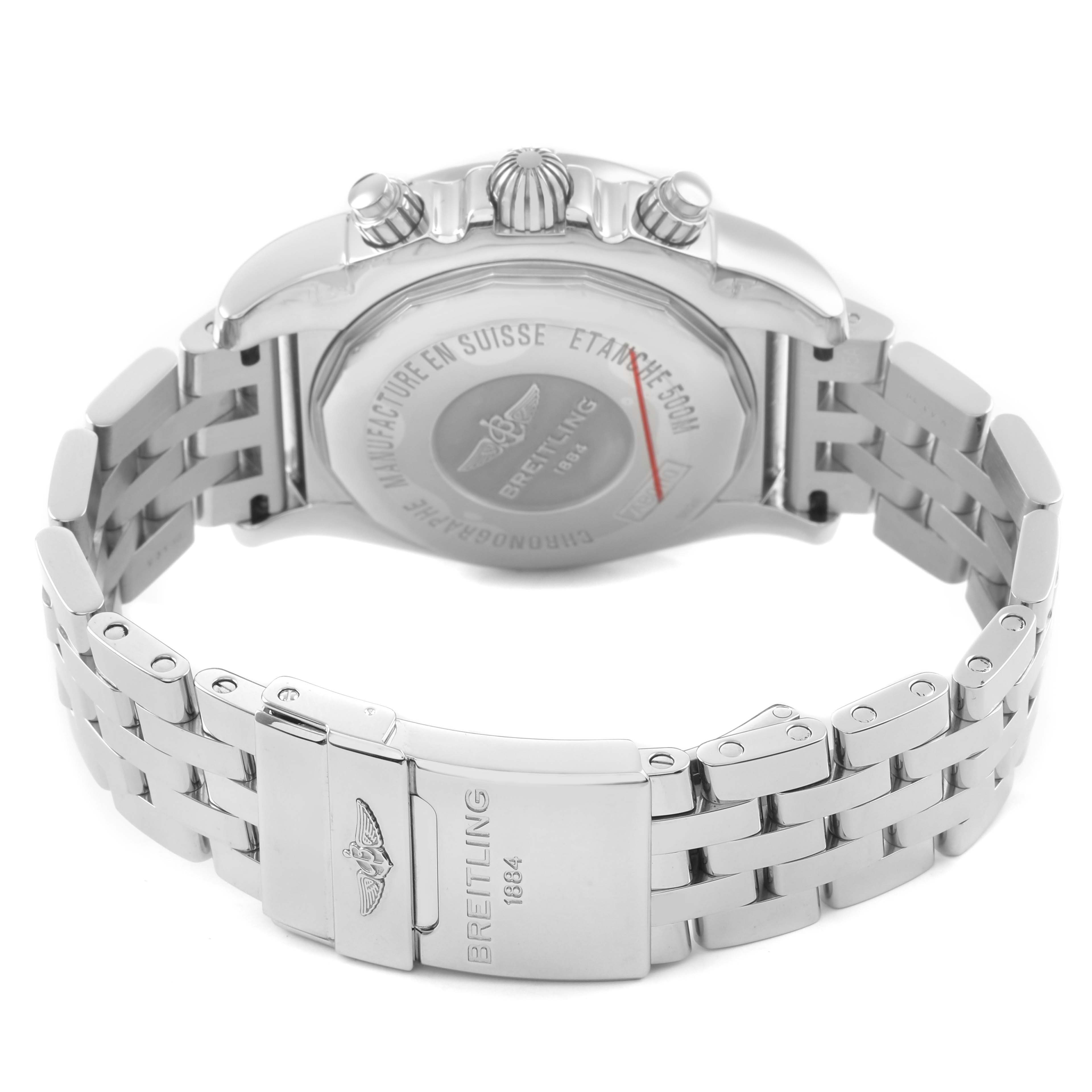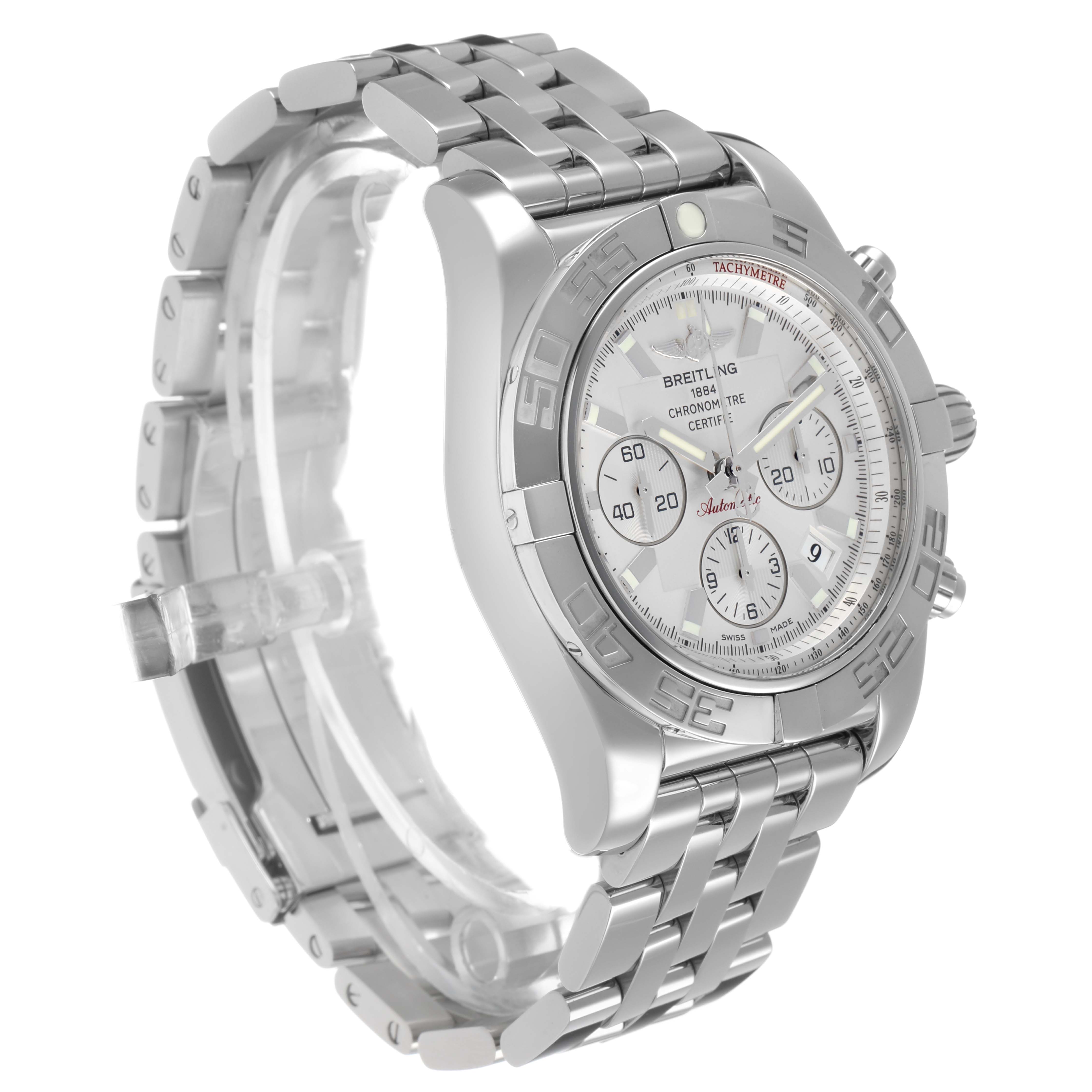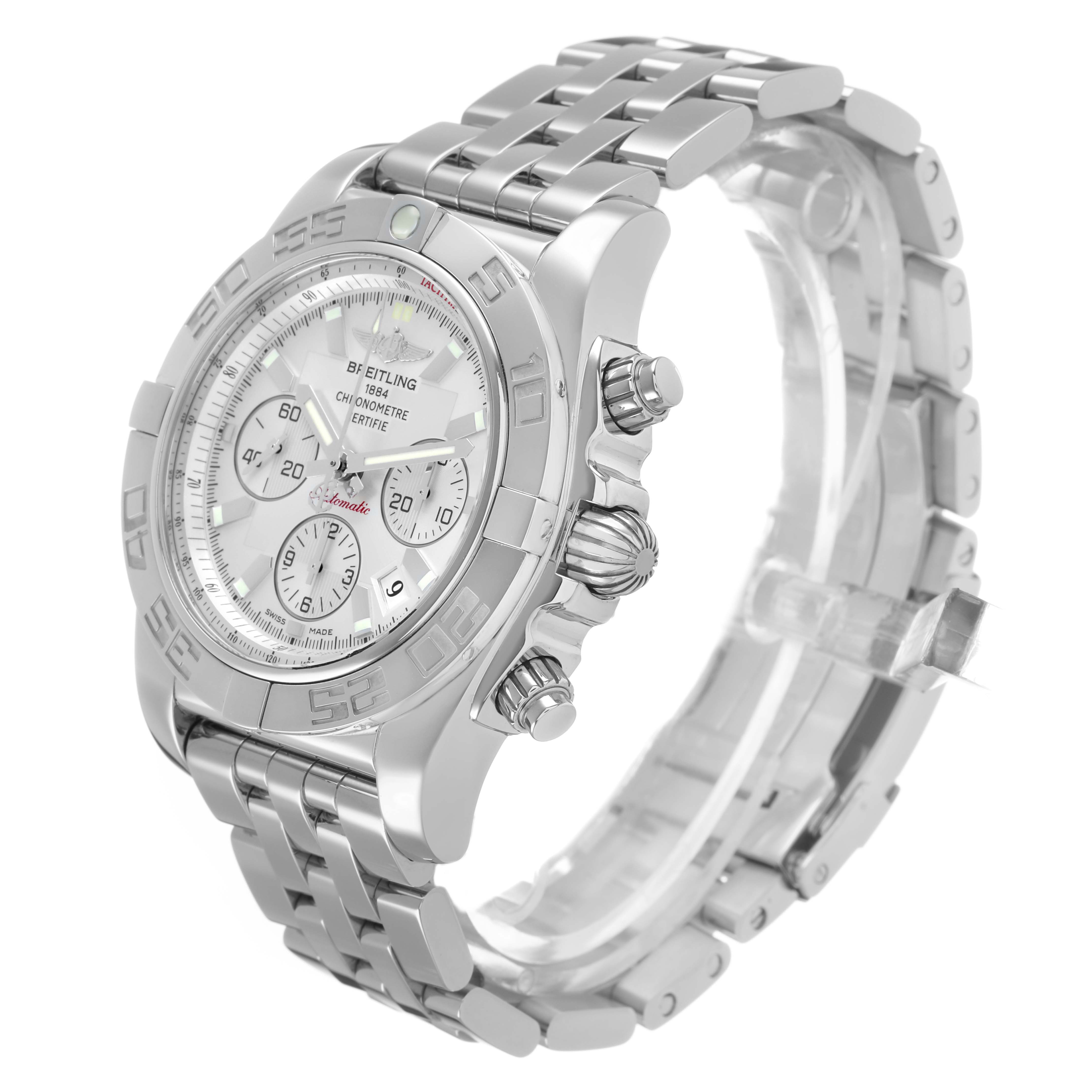 Breitling Chronomat 01 Steel Silver Dial Mens Watch AB0110. Self-winding automatic officially certified chronometer movement. Chronograph function. Stainless steel case 43.5 mm in diameter with screwed down crown and pushers. Stainless steel unidirectional rotating bezel. 0-60 elapsed-time. Four 15 minute markers. Scratch resistant sapphire crystal. Silver dial with raised baton hour markers. 3 chronograph subdials - 60 second, 30 minute and 12 hour. Luminous baton hands and hour markers. Tachymeter scale around the outer rim. Date display between the 4 and 5 o'clock. Stainless steel bracelet with deployent buckle. Fits 8.5" wrist.