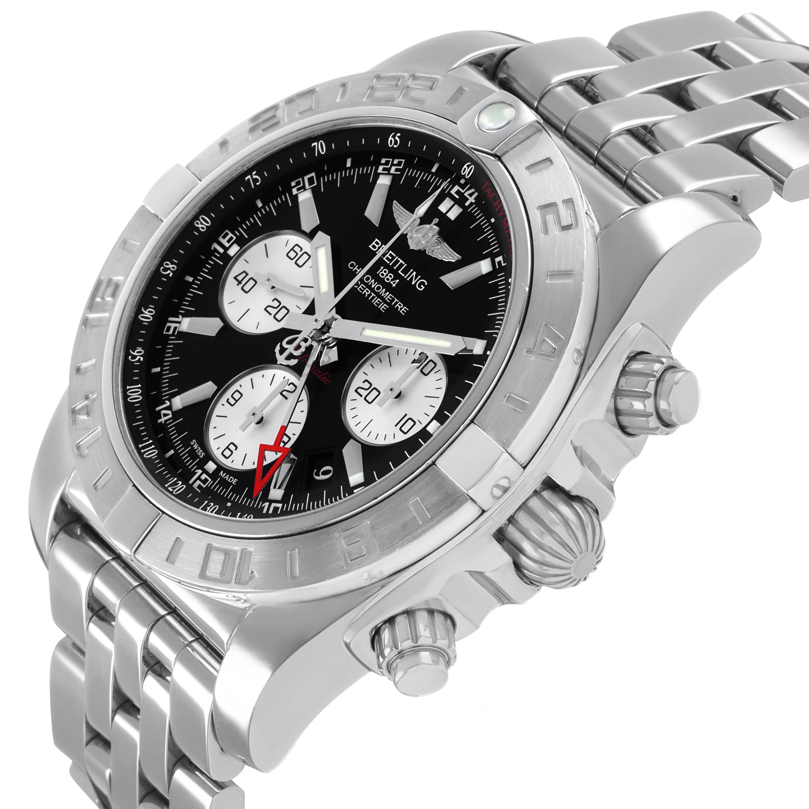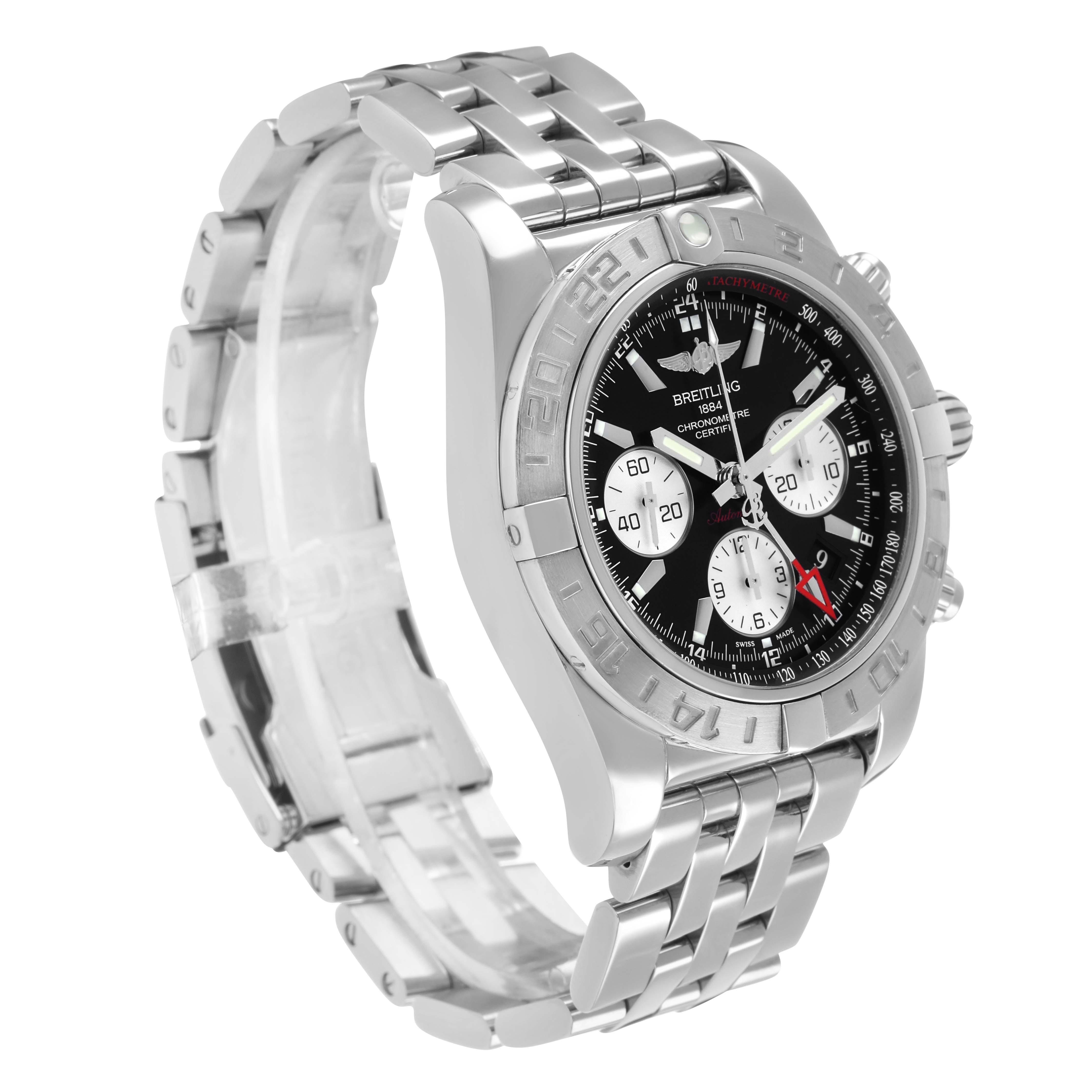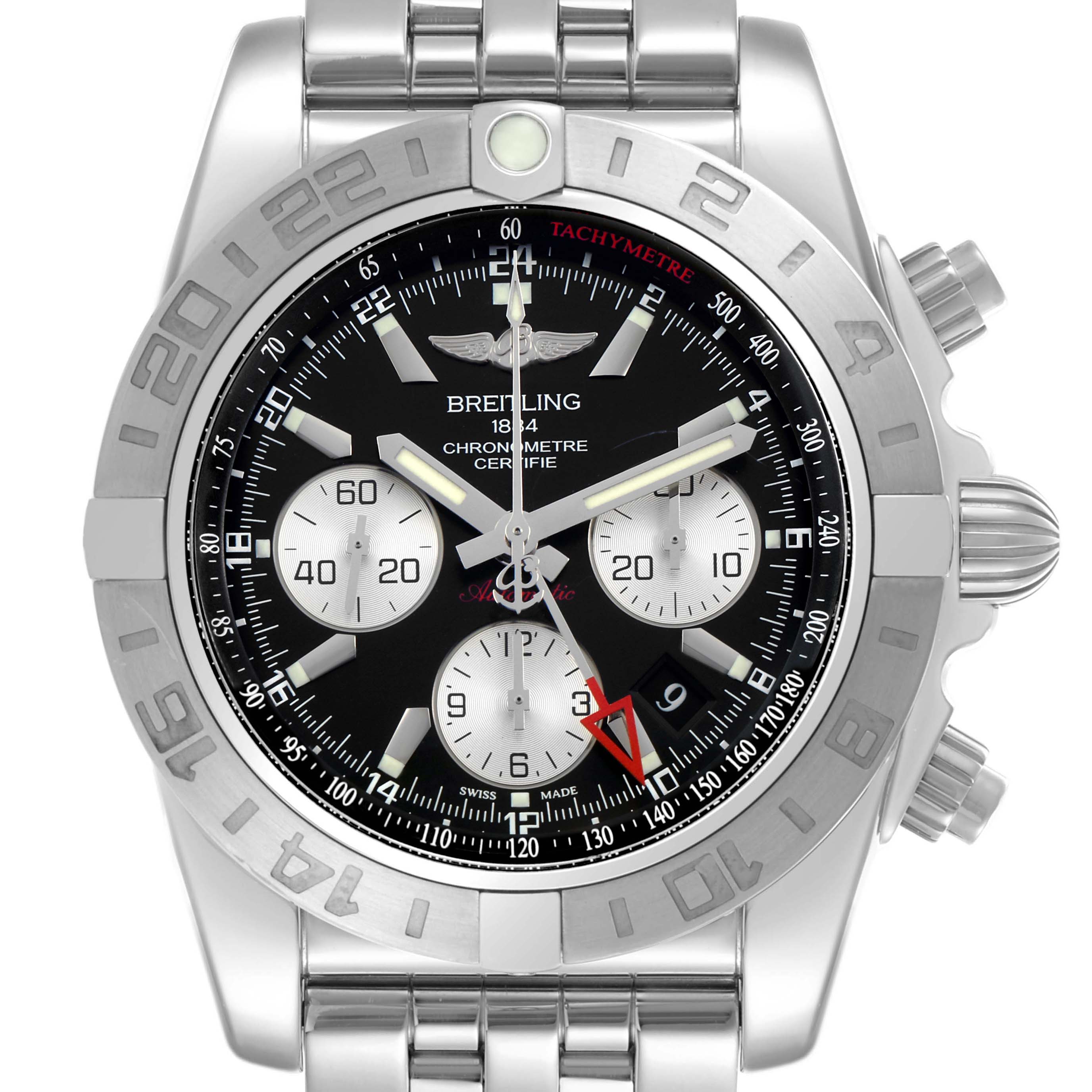 Breitling Chronomat Evolution 44 GMT Steel Mens Watch AB0420 Box Papers. Automatic self-winding officially certified chronometer movement. Chronograph function. Stainless steel round case 44.0 mm in diameter. Screwed-down crown and pushers. Lapidated lugs, screw-down case back. Breitling logo on the crown. Stainless steel bidirectional rotating bezel. 0-60 elapsed-time. Four 15 minute markers. Scratch resistant sapphire crystal. Black dial with luminescent baton hour markers and sword-shaped hands, date aperture between 4 and 5 o’clock. Baton luminous hands. Outer minute divisions, tachometer, Silver subsidiary dials for the seconds, the 12-hour and 30-minute registers. Stainless steel bracelet with a flip-lock clasp. Fits an 8" wrist.