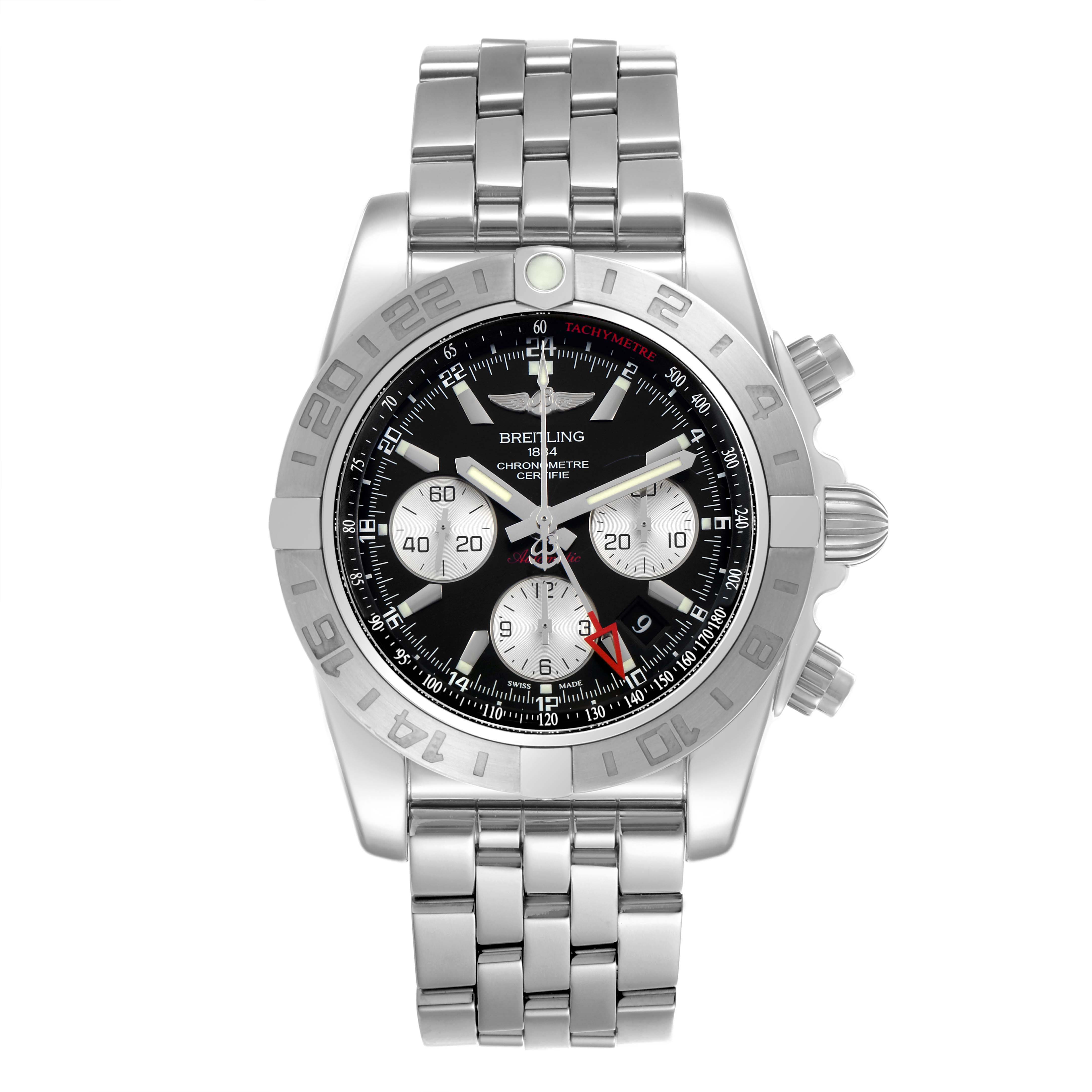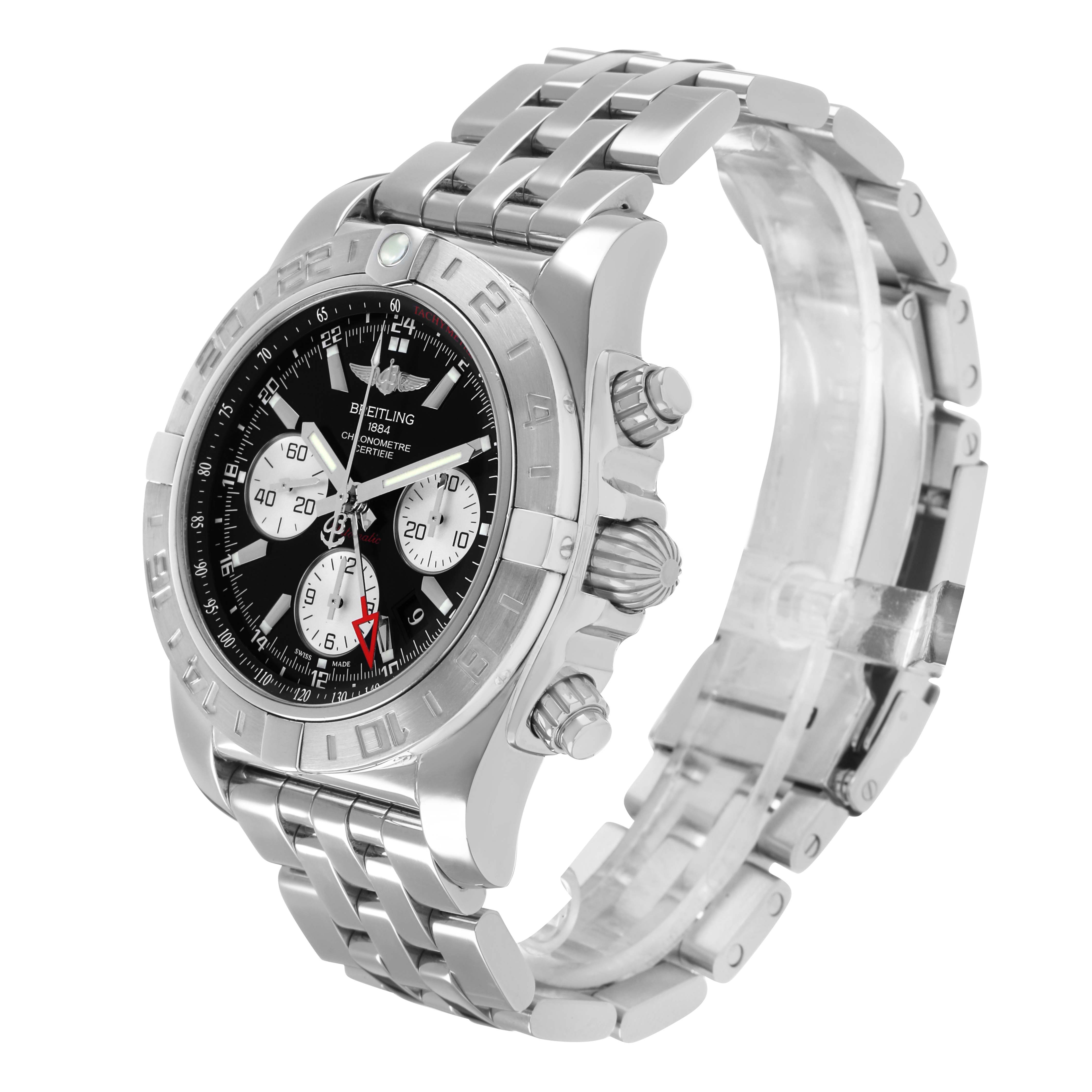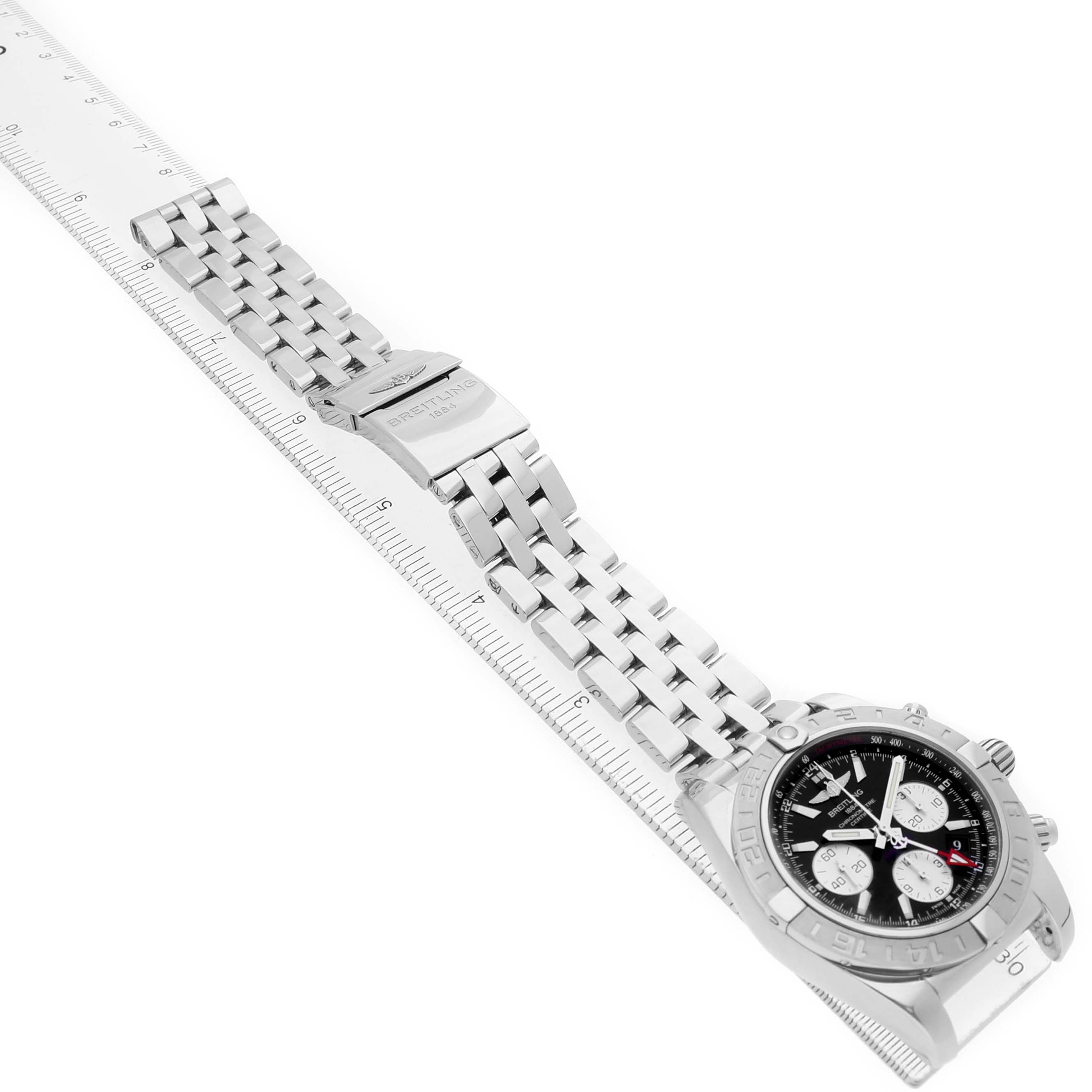 Breitling Chronomat Evolution 44 GMT Steel Mens Watch AB0420 Box Papers. Automatic self-winding officially certified chronometer movement. Chronograph function. Stainless steel round case 44.0 mm in diameter. Screwed-down crown and pushers. Lapidated lugs, screw-down case back. Breitling logo on the crown. Stainless steel bidirectional rotating bezel. 0-60 elapsed-time. Four 15 minute markers. Scratch resistant sapphire crystal. Black dial with luminescent baton hour markers and sword-shaped hands, date aperture between 4 and 5 o’clock. Baton luminous hands. Outer minute divisions, tachometer, Silver subsidiary dials for the seconds, the 12-hour and 30-minute registers. Stainless steel bracelet with a flip-lock clasp. Fits an 8" wrist.