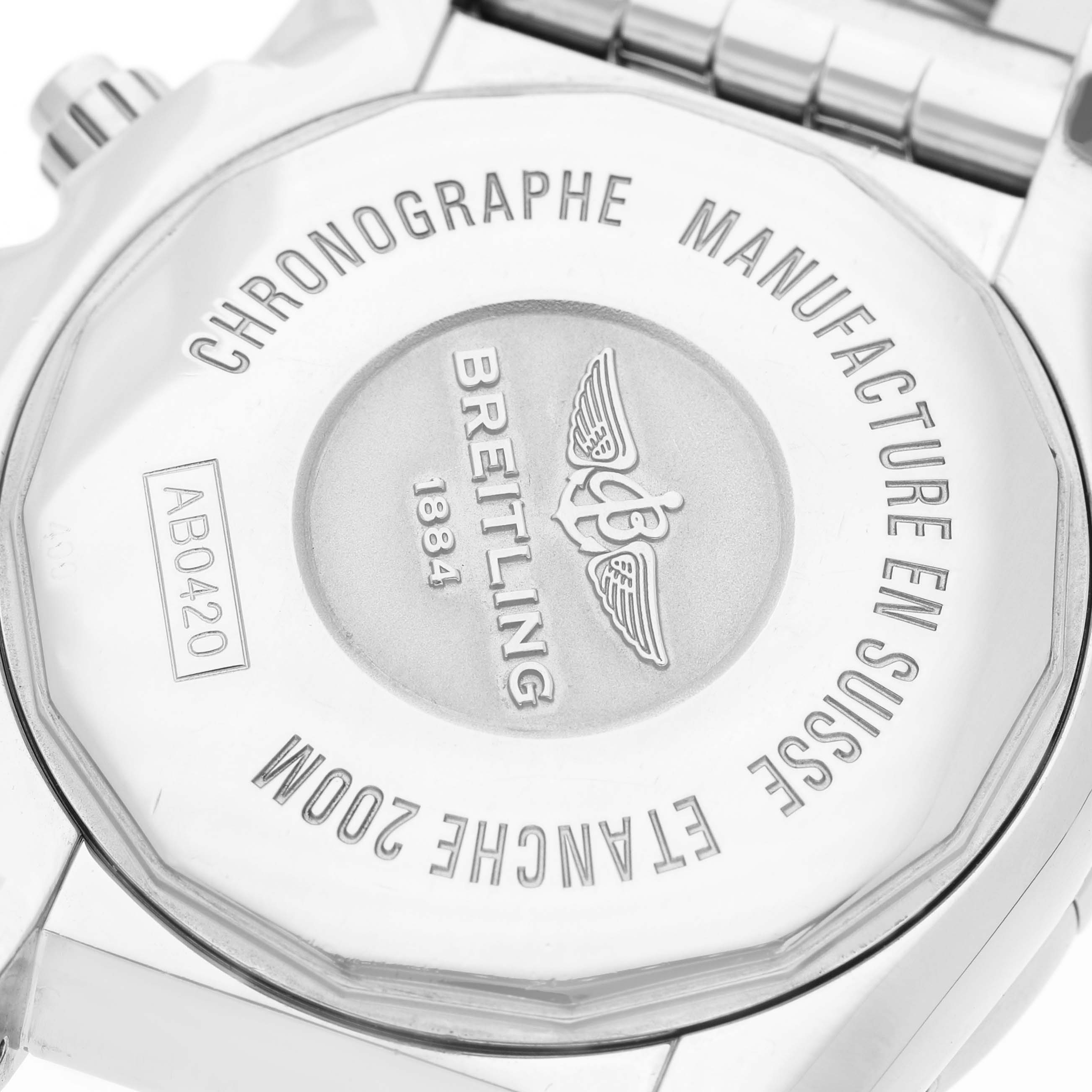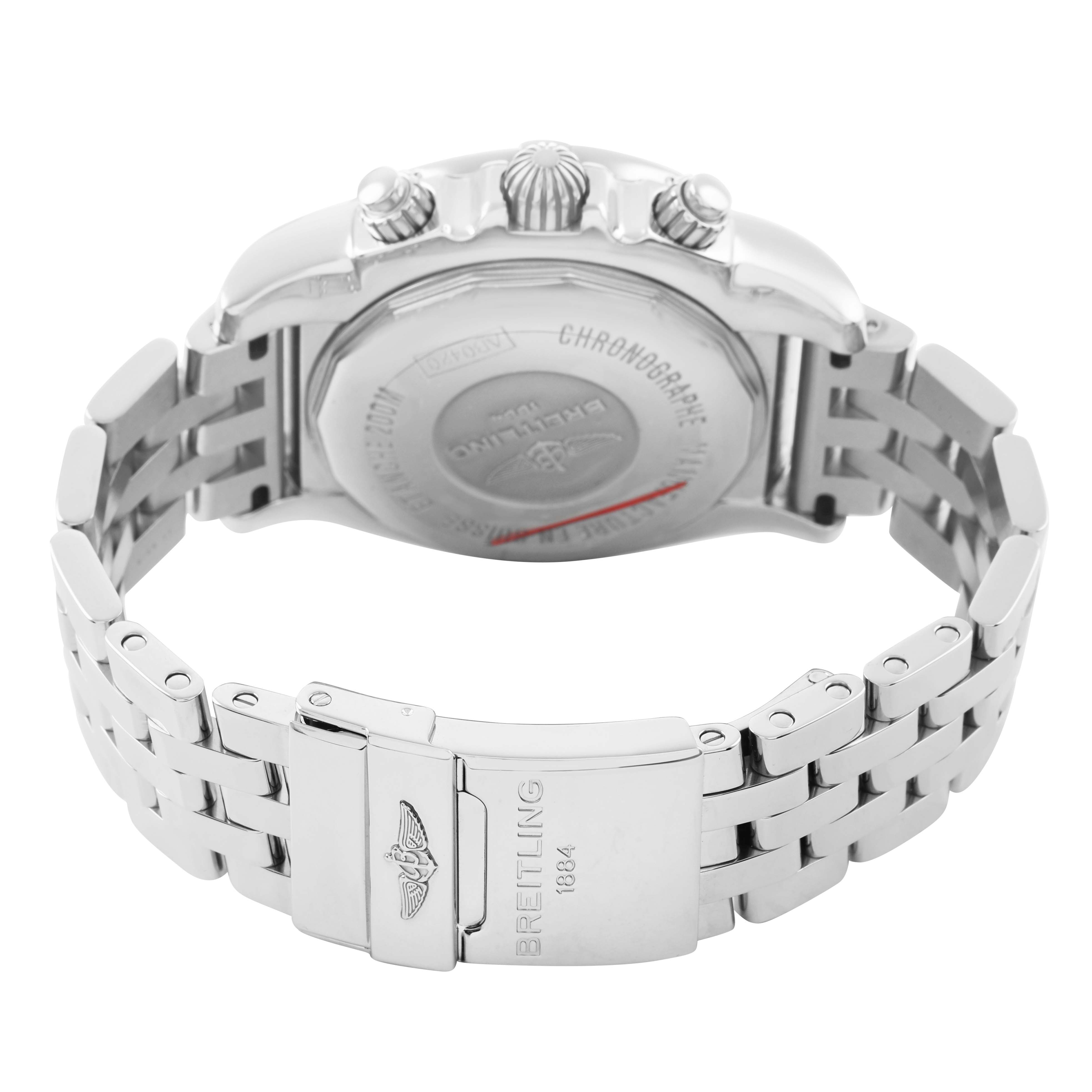 | Case: | Stainless steel round case 44.0 mm in diameter. Screwed-down crown and pushers. Lapidated lugs, screw-down case back. Breitling logo on the crown. |