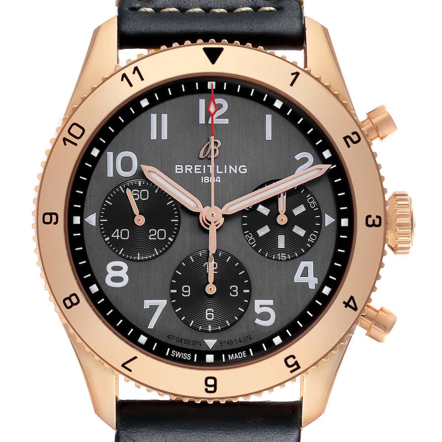 Breitling Classic AVI P-51 Mustang Rose Gold Mens Watch R23380 Box Card. Self-winding automatic officially certified chronometer movement. Chronograph function. 18k rose gold round case 42.0 mm in diameter. Two pushers operate the chronograph functions. Breitling logo on the crown. 18k rose gold bidirectional rotating knurled bezel engraved with a 12-hour scale. Scratch resistant cambered sapphire crystal, glareproofed on both sides. Grey dial with luminescent Arabic numeral hour markers and rose gold sword-shaped hands. Three black subdials - running small seconds and the 30-minute and 12-hour chronograph registers. Rose gold luminescent arrow-tipped central chronograph seconds hand. Red luminescent arrow-tipped GMT hand. Black leather strap with an 18k rose gold deployent clasp.