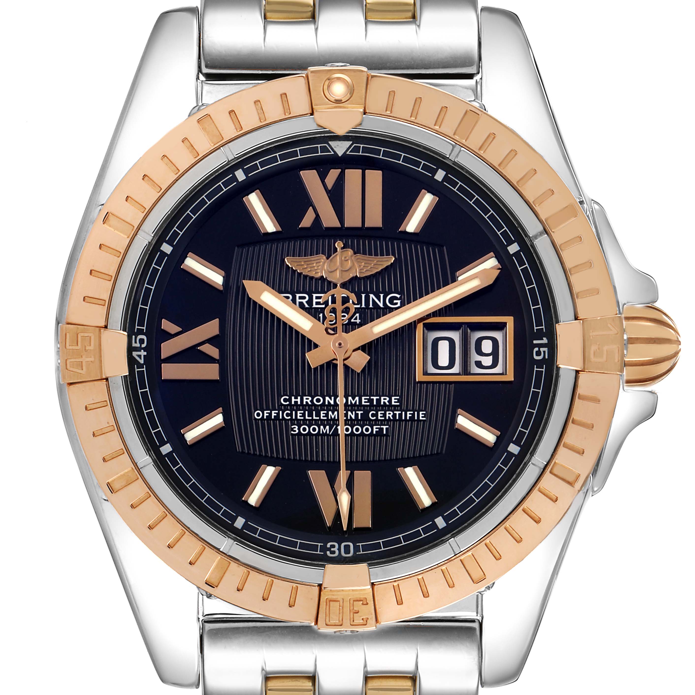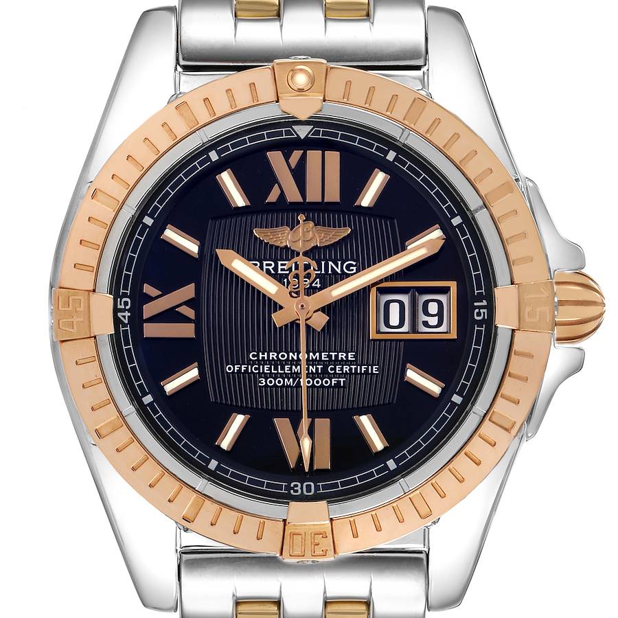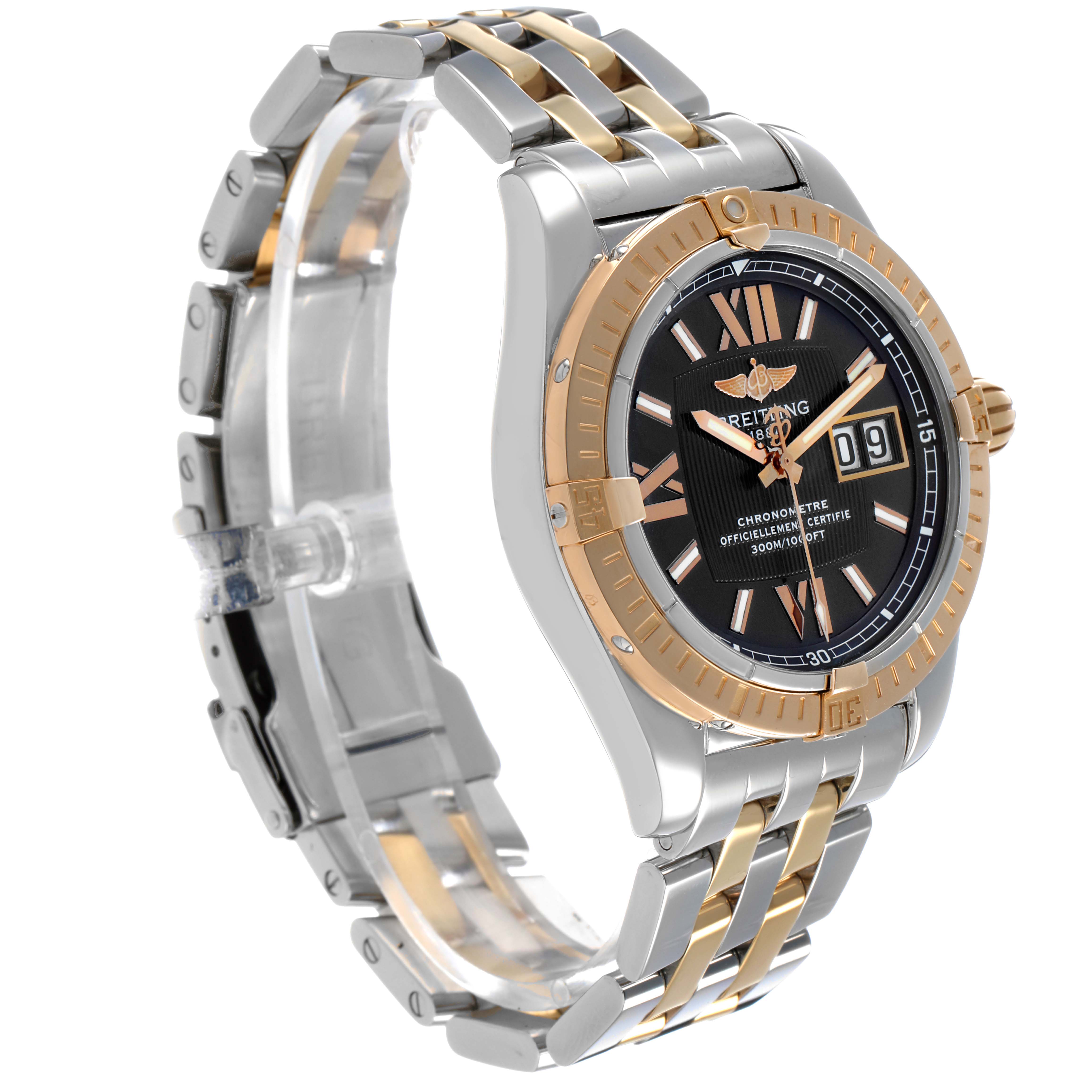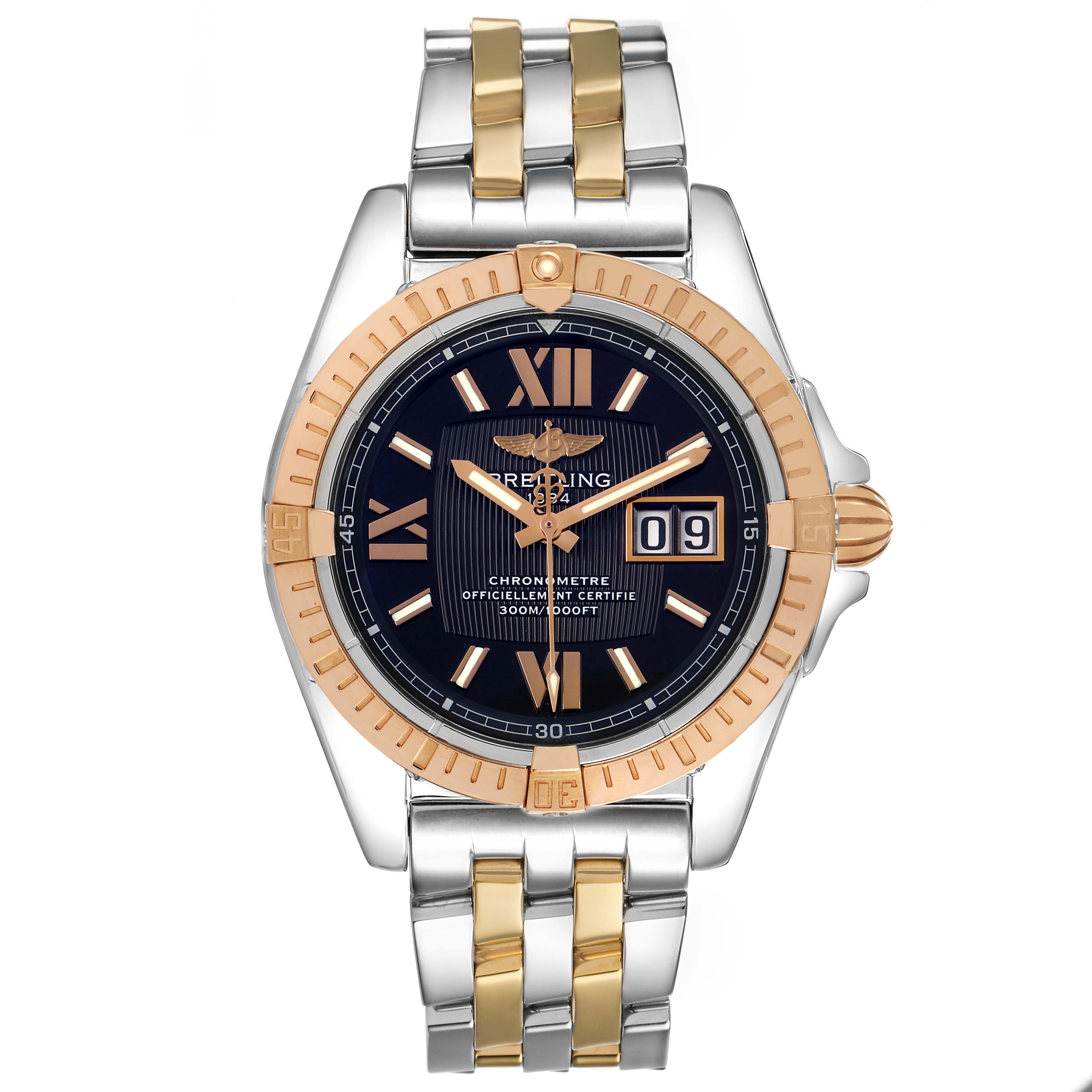 Breitling Cockpit Big Date Steel Yellow Rose Gold Steel Mens Watch C49350. Self-winding automatic officially certified chronometer movement. Stainless steel case 41.0 mm in diameter. 18K rose gold screwed-down crown. 18K rose gold unidirectional rotating bezel. 0-60 elapsed-time. Four 15 minute markers. Scratch resistant sapphire crystal. Black dial with raised baton hour markers, date aperture at 3 o’clock. Luminous hands. Stainless steel and 18K yellow gold bracelet with folder over deployant clasp. Fits 7 3/4" wrist.