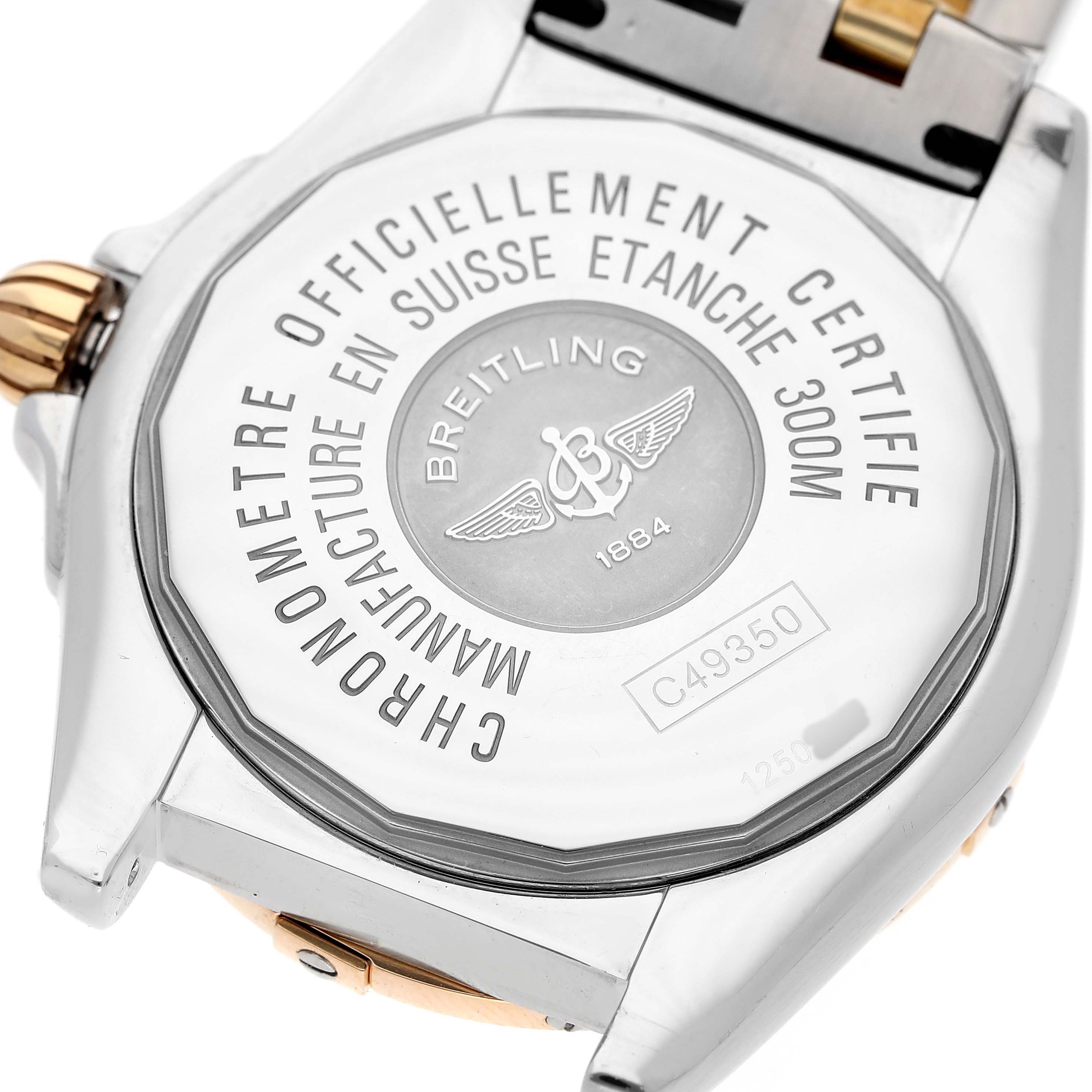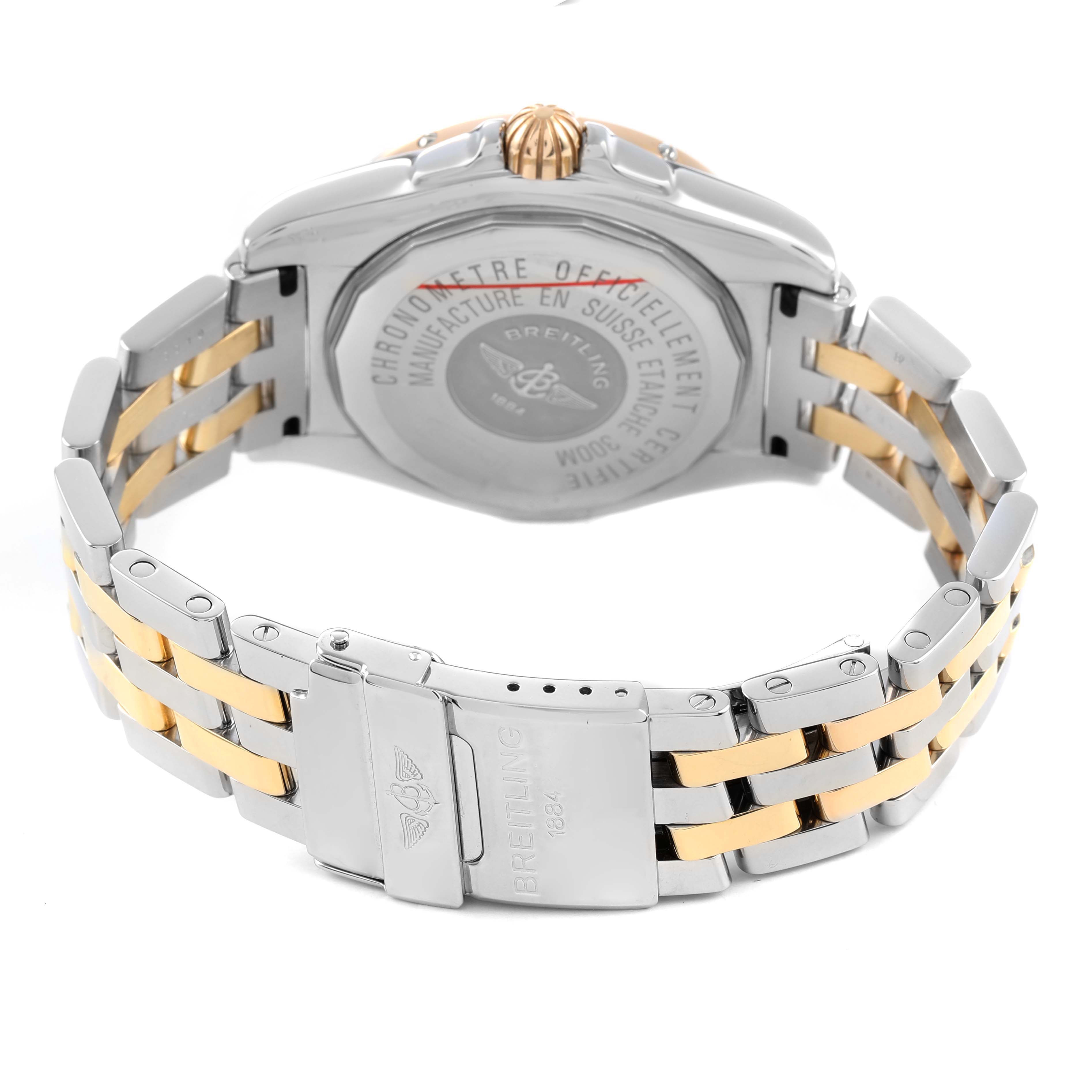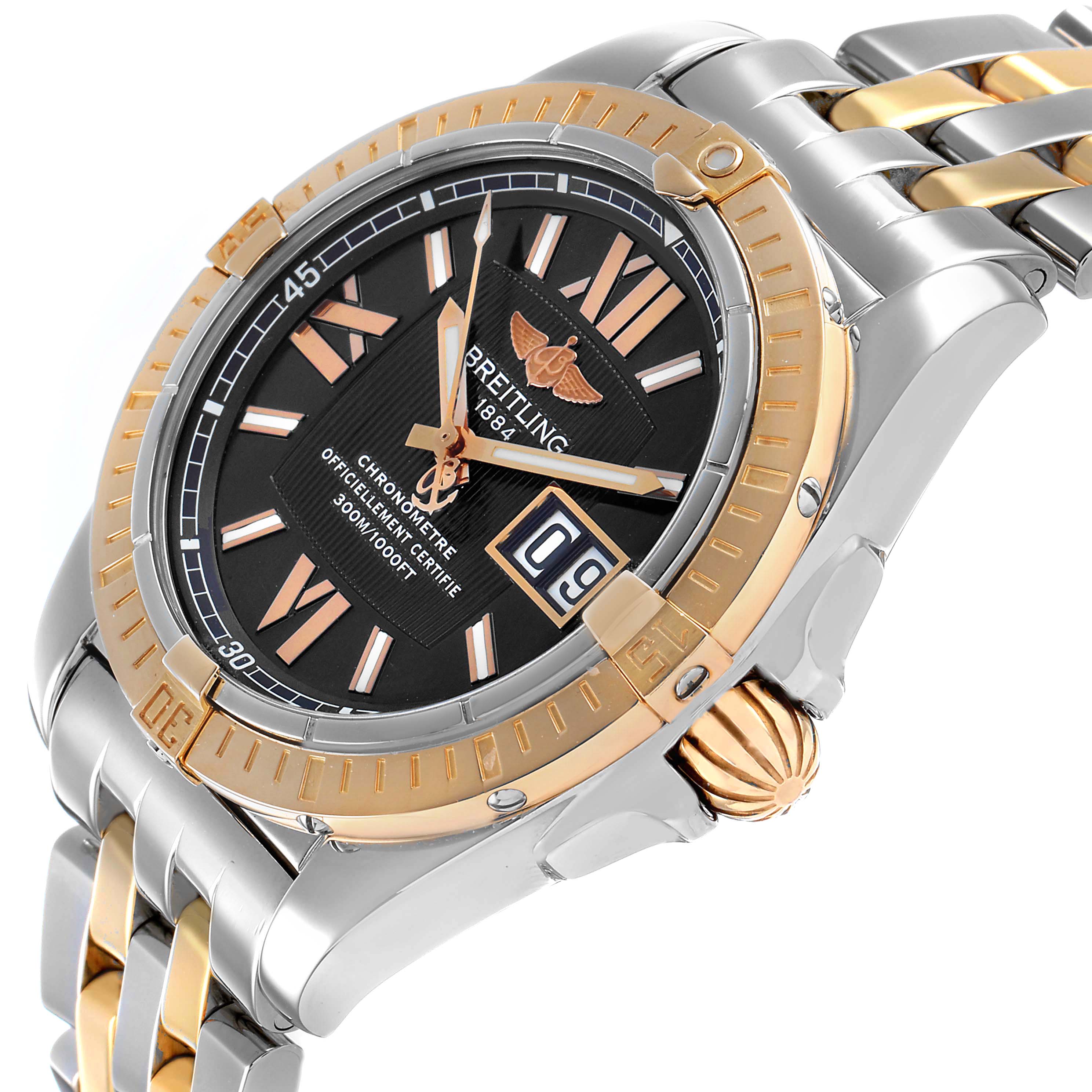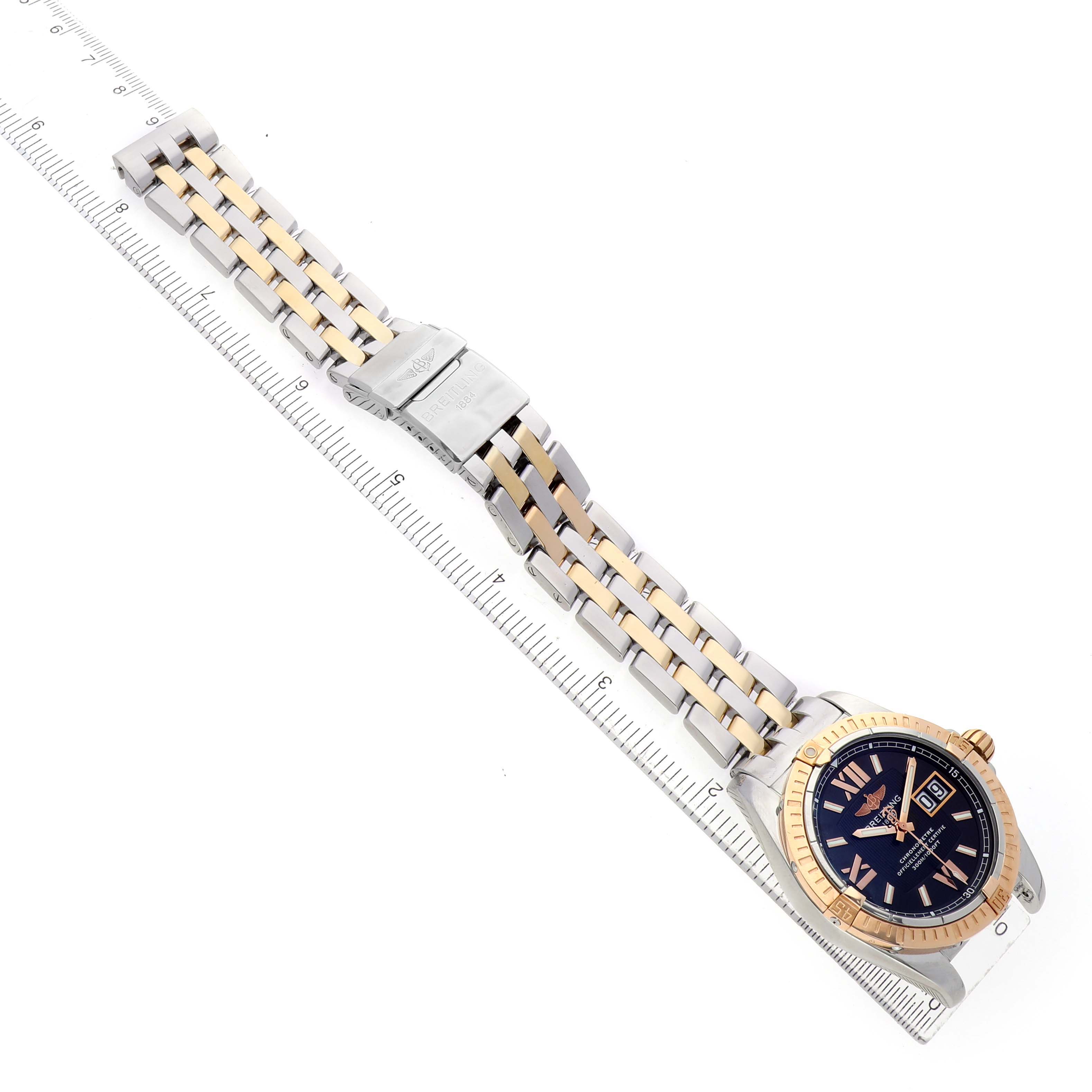 Breitling Cockpit Big Date Steel Yellow Rose Gold Steel Mens Watch C49350. Self-winding automatic officially certified chronometer movement. Stainless steel case 41.0 mm in diameter. 18K rose gold screwed-down crown. 18K rose gold unidirectional rotating bezel. 0-60 elapsed-time. Four 15 minute markers. Scratch resistant sapphire crystal. Black dial with raised baton hour markers, date aperture at 3 o’clock. Luminous hands. Stainless steel and 18K yellow gold bracelet with folder over deployant clasp. Fits 7 3/4" wrist.