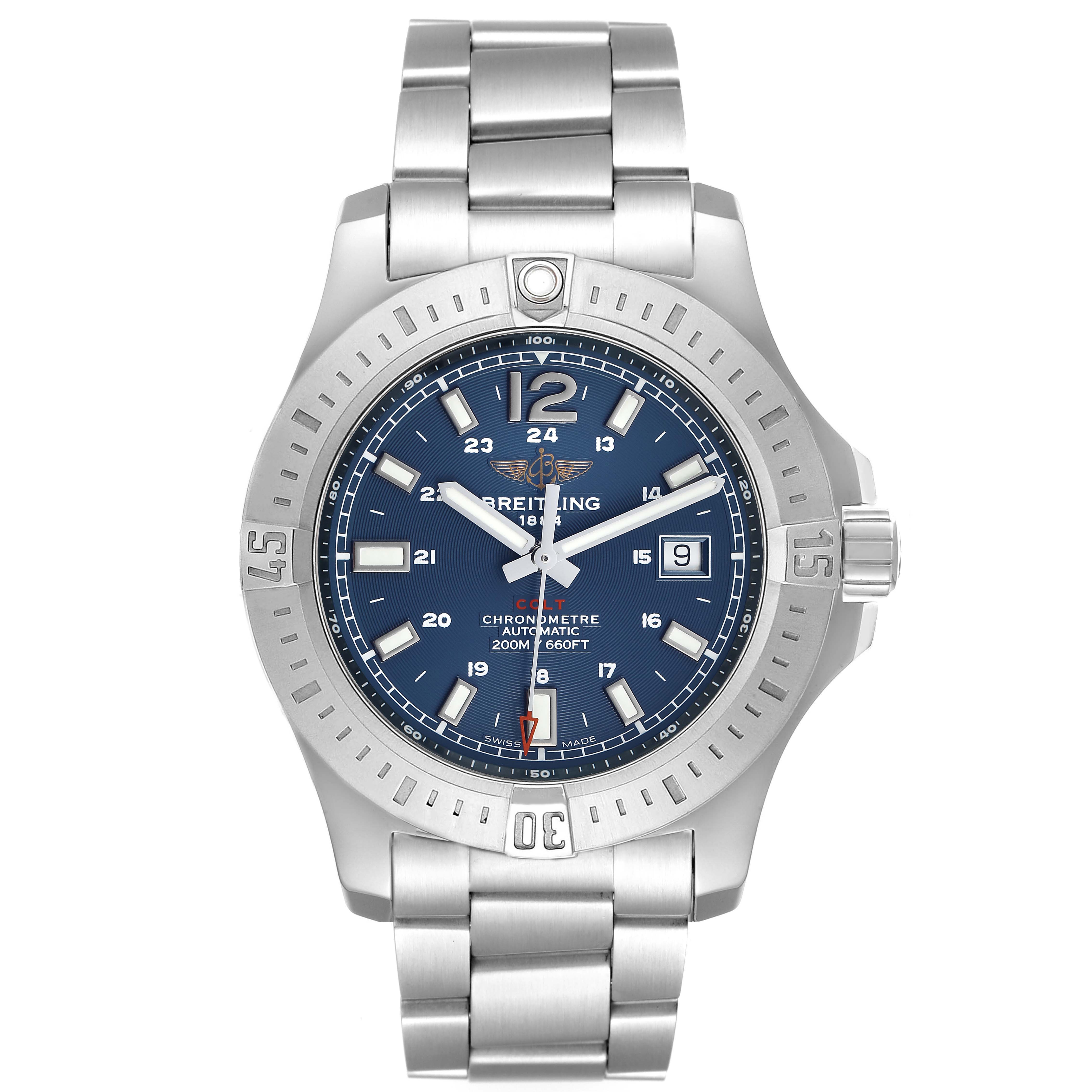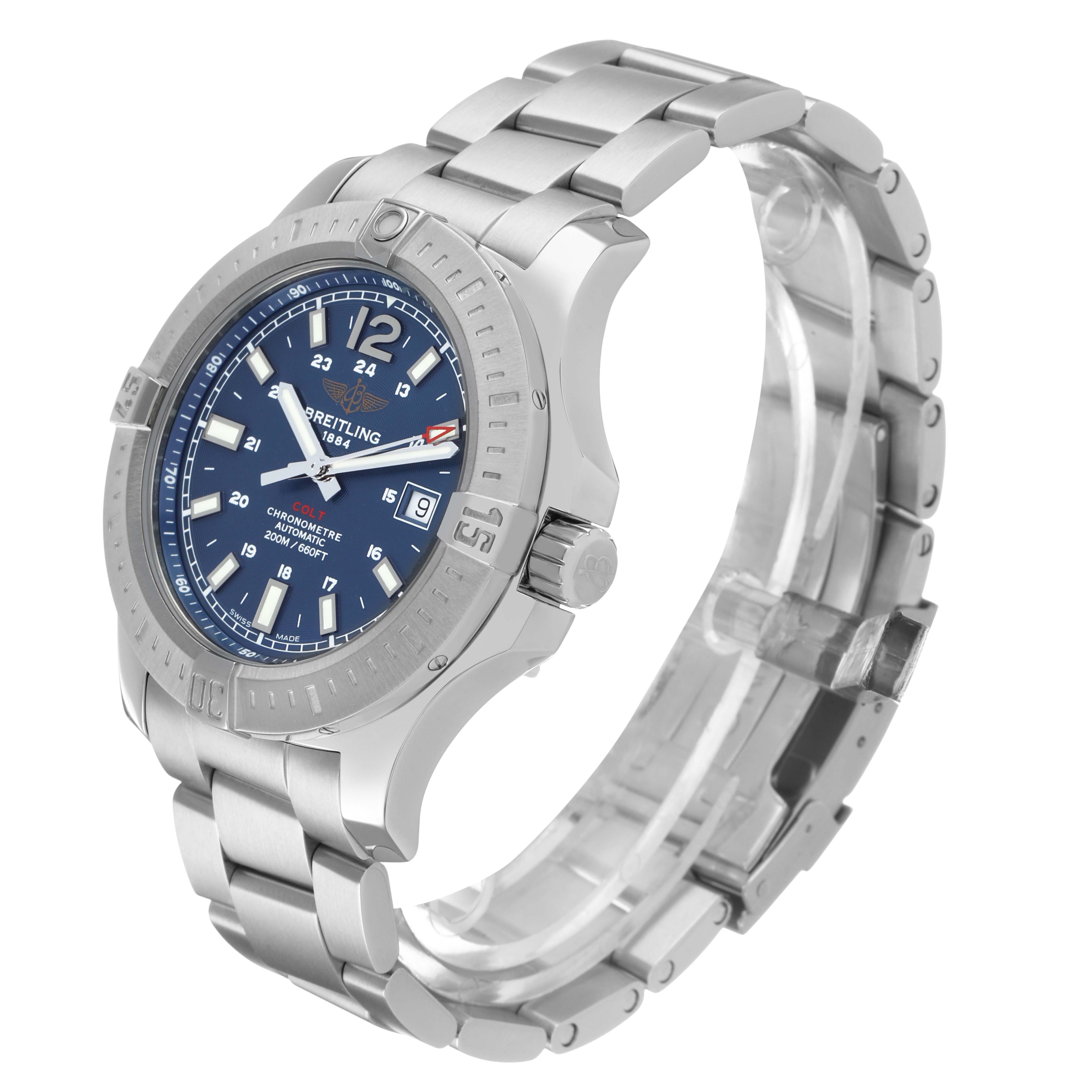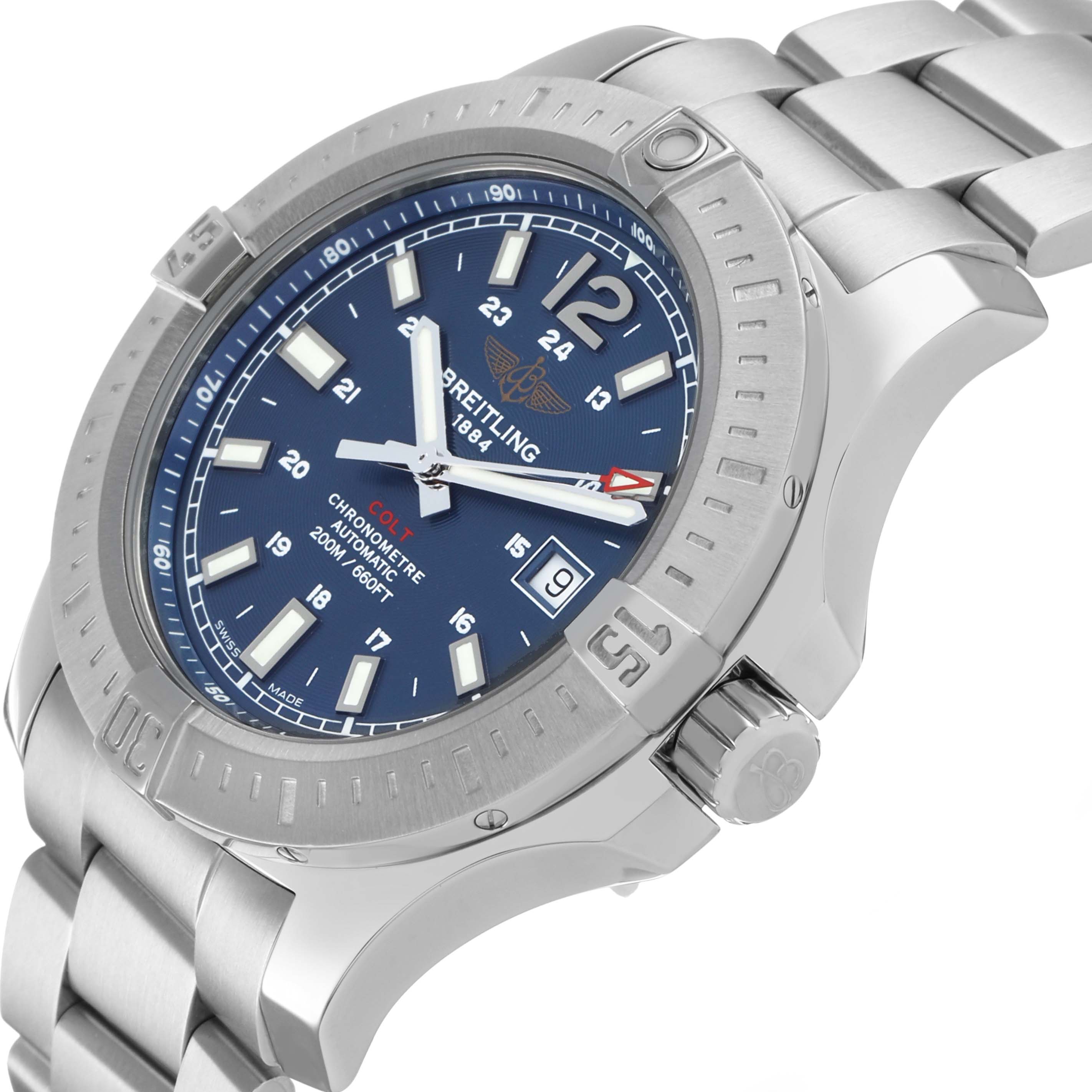 Breitling Colt Steel Blue Dial Mens Watch A17388 Box Card. Automatic self-winding chronometer movement. Stainless steel round case 44.0 mm in diameter. Breitling logo on the crown. Pointed crown guards. Case thickness: 11.25 mm. Stainless steel unidirectional rotating bezel. 0-60 elapsed-time. Four 15 minute markers. Scratch resistant sapphire crystal. Blue dial with a concentric circle pattern texture. Applied steel rimmed index hour markers with luminous fill. Steel baton hour & minute hands with luminous fill. Printed minute/seconds track. Raised flange on dial edge with a 1-100 scale. Sweeping steel seconds hand with a red skeleton arrow-head tip. Date window displayed at 3 o'clock. Stainless steel bracelet with a flip-lock clasp. Fits an 8 1/4" wrist.