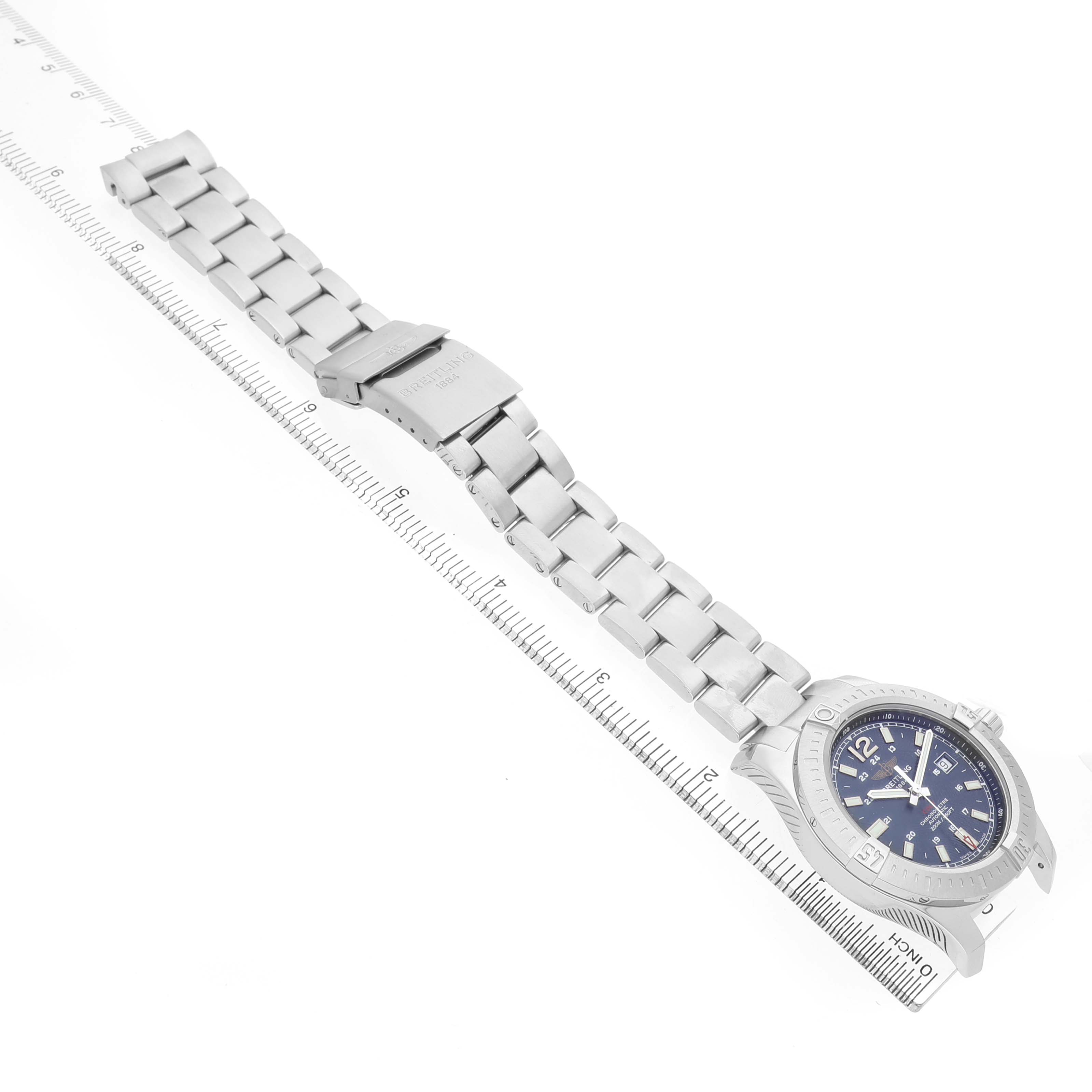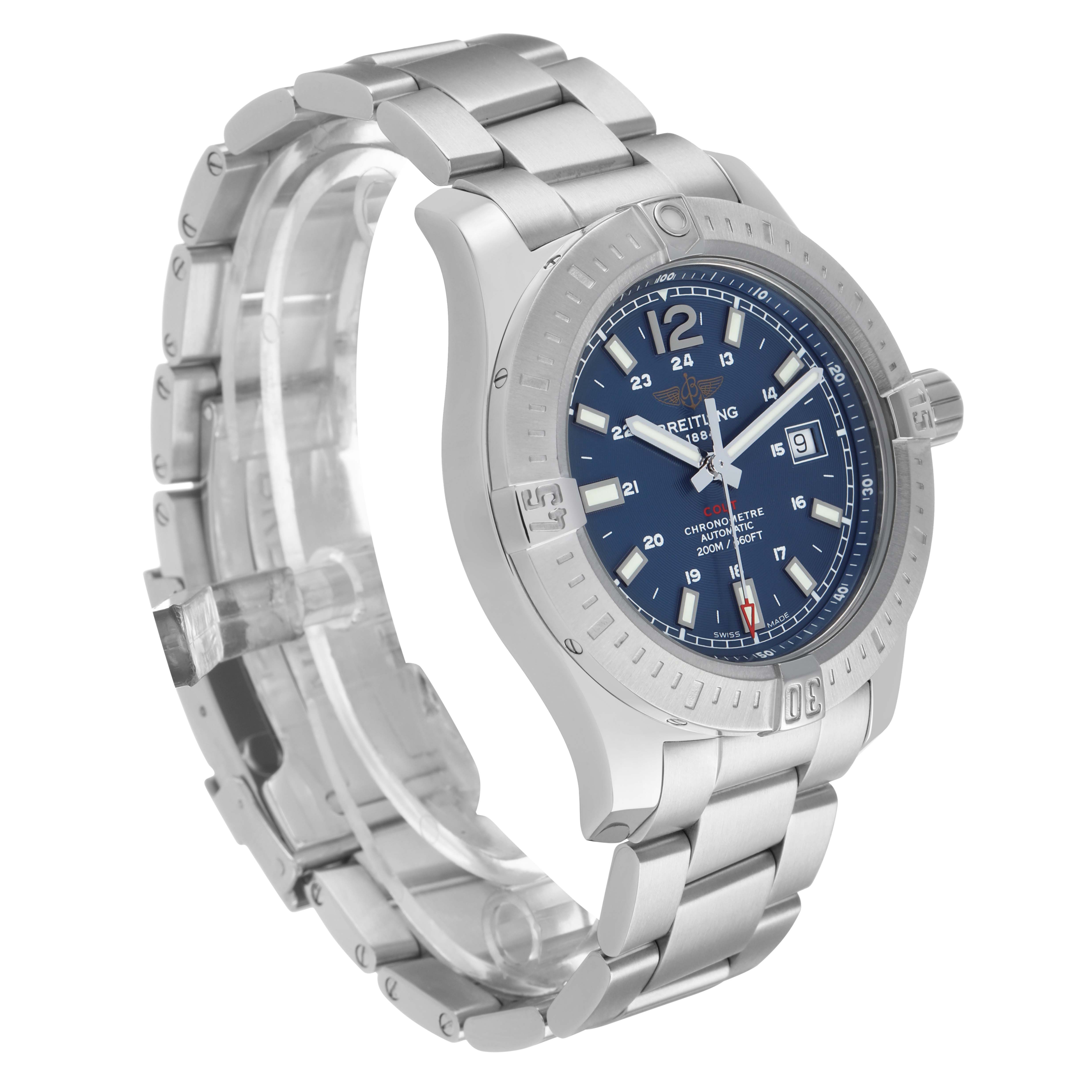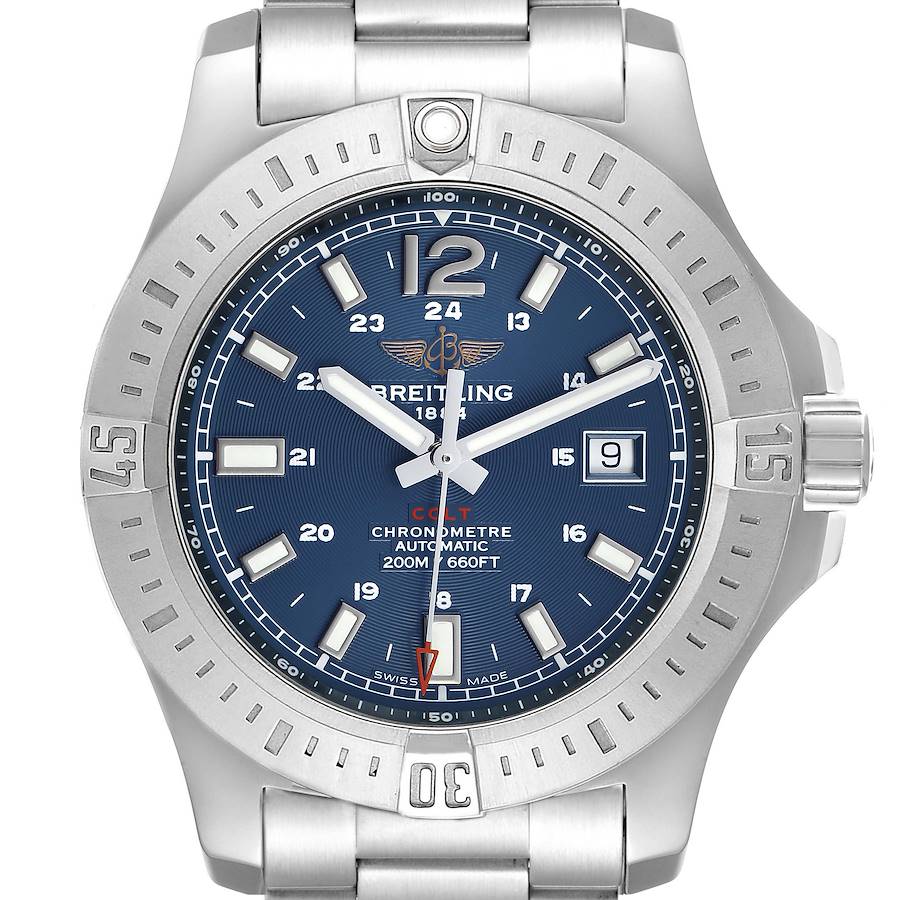 Breitling Colt Steel Blue Dial Mens Watch A17388 Box Card. Automatic self-winding chronometer movement. Stainless steel round case 44.0 mm in diameter. Breitling logo on the crown. Pointed crown guards. Case thickness: 11.25 mm. Stainless steel unidirectional rotating bezel. 0-60 elapsed-time. Four 15 minute markers. Scratch resistant sapphire crystal. Blue dial with a concentric circle pattern texture. Applied steel rimmed index hour markers with luminous fill. Steel baton hour & minute hands with luminous fill. Printed minute/seconds track. Raised flange on dial edge with a 1-100 scale. Sweeping steel seconds hand with a red skeleton arrow-head tip. Date window displayed at 3 o'clock. Stainless steel bracelet with a flip-lock clasp. Fits an 8 1/4" wrist.