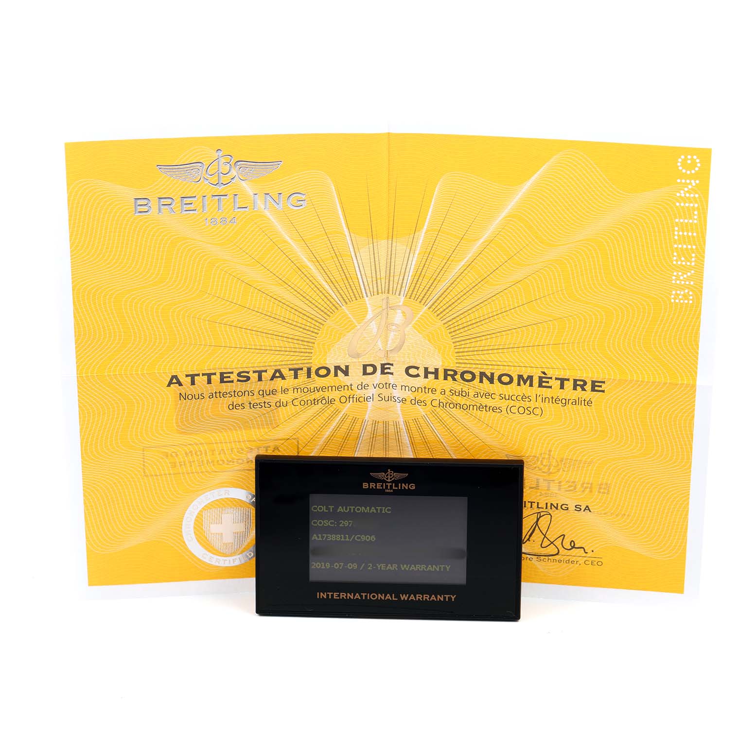 | Box & Papers: | Breitling box, papers, and card. Exclusive SwissWatchExpo Certificate of Authenticity. |