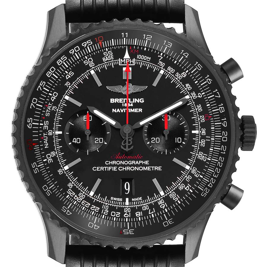 Breitling Navitimer 01 46 BlackSteel Mens Watch MB0128 Box Card. Self-winding automatic officially certified chronometer movement. Chronograph function. Stainless steel case with Breitling carbon-based "Blacksteel" treatment 46.0 mm in diameter. Transparent exhibition sapphire crystal caseback. Two buttons operate the chronograph functions. Breitling logo on the crown. Stainless steel bidirectional rotating slide-rule bezel. Scratch resistant sapphire crystal. Black dial with a tachymeter scale and luminescent baton hour markers. Luminescent stainless steel outlined hands. Large central red seconds counter. Date calendar at the 6 o'clock aperture. Two stepped-down subdials: 30 minute counter and small running seconds. Black rubber strap with Blacksteel double push-button deployant clasp.