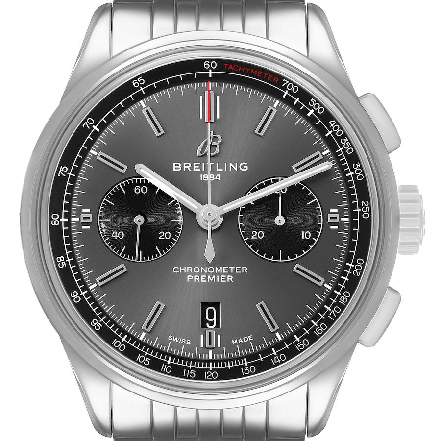 Breitling Premier B01 42mm Steel Grey Dial Mens Watch AB0118 Box Card. Automatic self-winding movement. Stainless steel round case 42.0 mm in diameter. Transparent exhibition sapphire crystal case back. Two pushers operate the chronograph functions. Breitling logo on the crown. Stainless steel smooth bezel. Scratch resistant sapphire crystal. Grey dial with luminescent stainless steel-outlined baton hands and hour markers. Tachymeter around the outer rim. Date calendar at the 6 o'clock aperture. Large central red-tipped chronograph seconds hand. Two gray subdials -- running seconds and the 30-minute chronograph register. Stainless steel bracelet with a flip-lock safety clasp. Fits a 8 1/4" wrist.