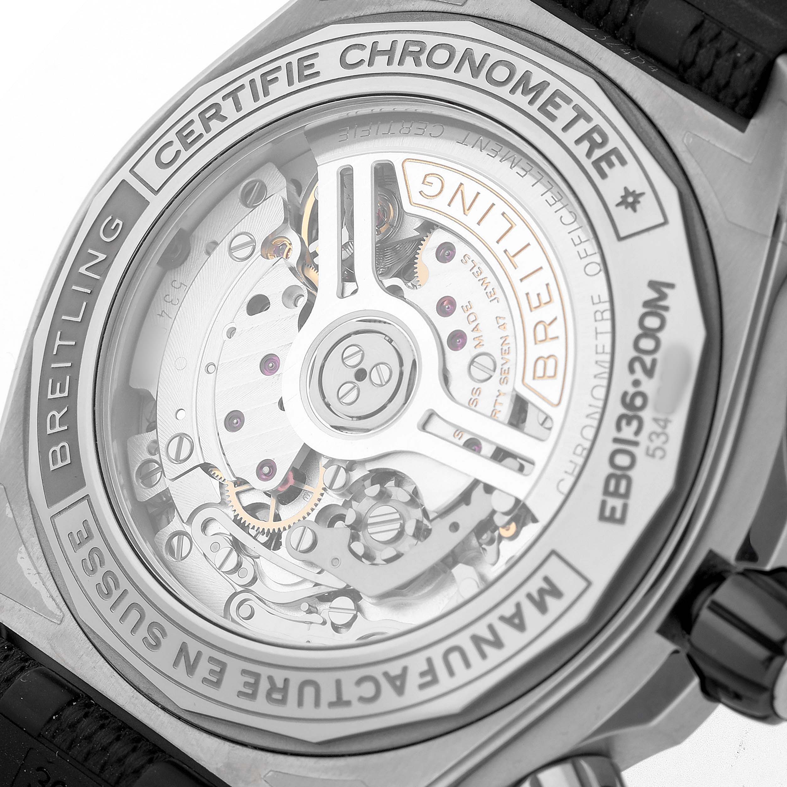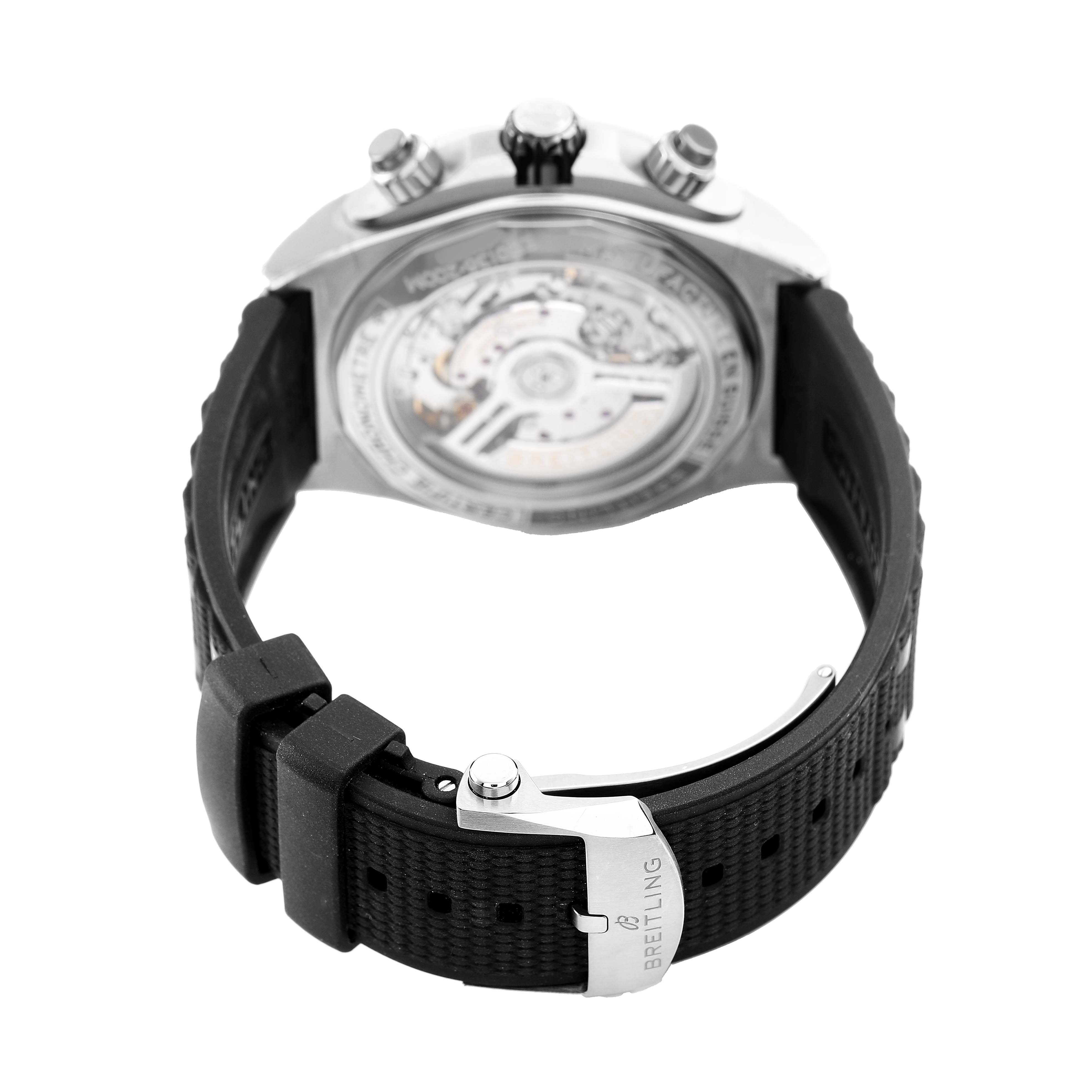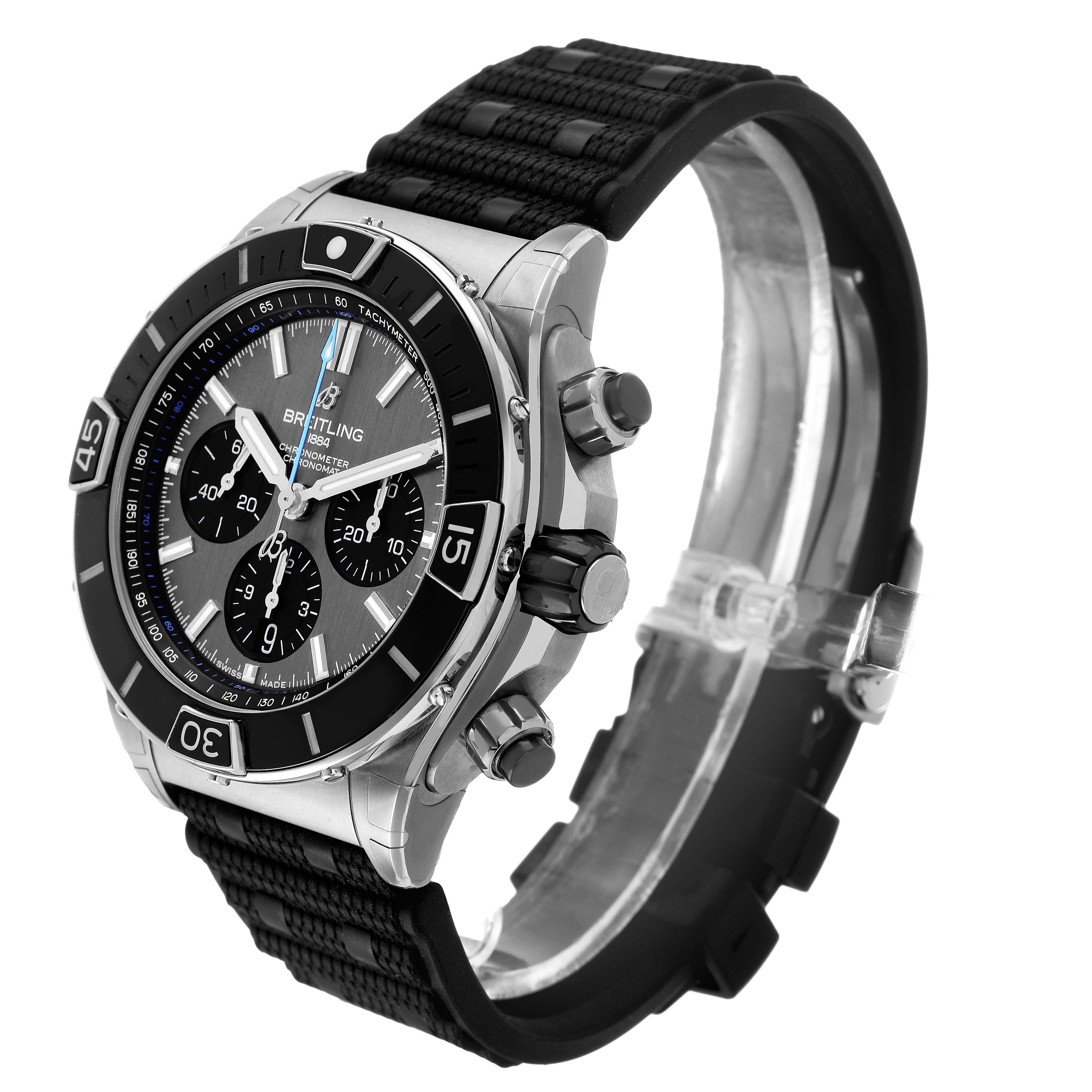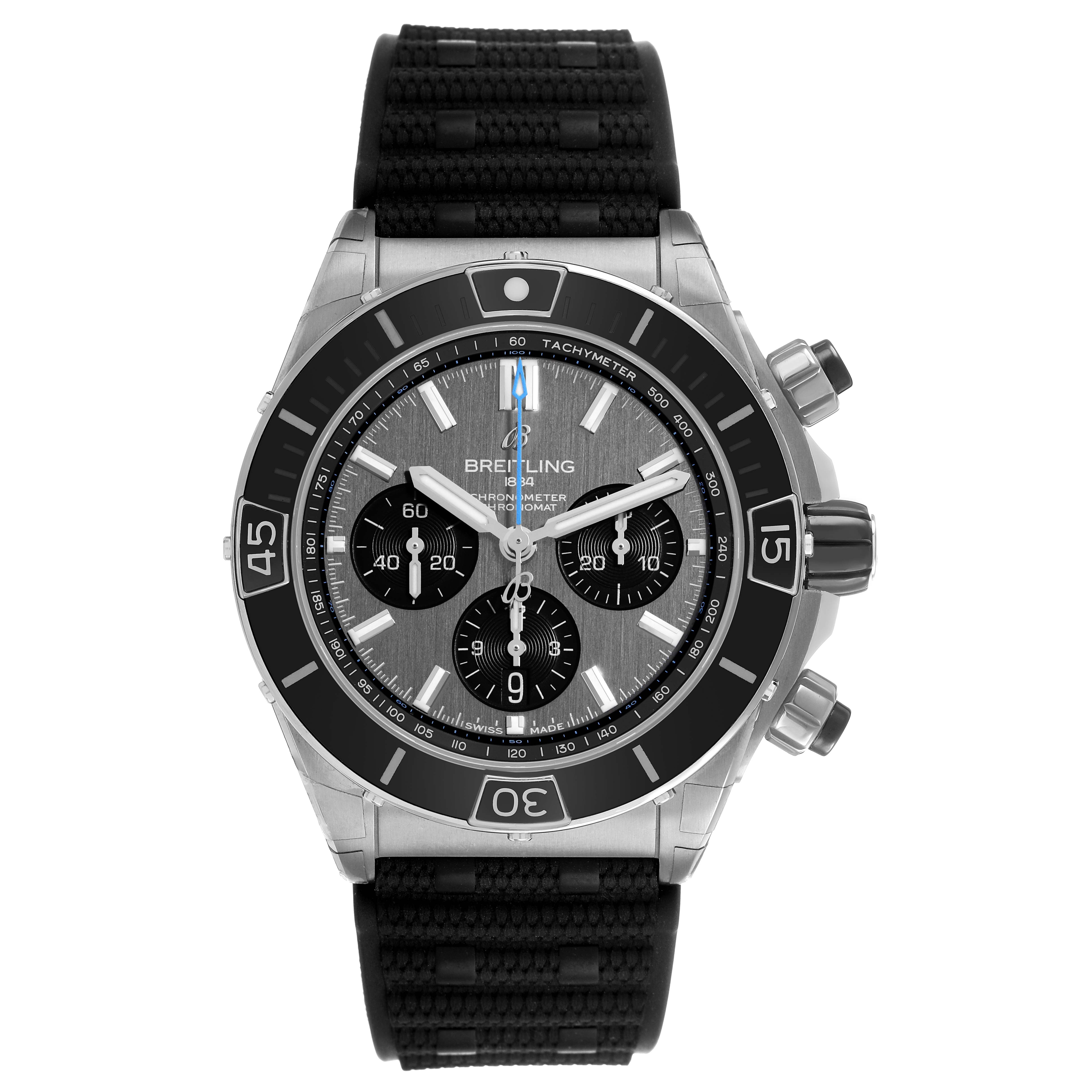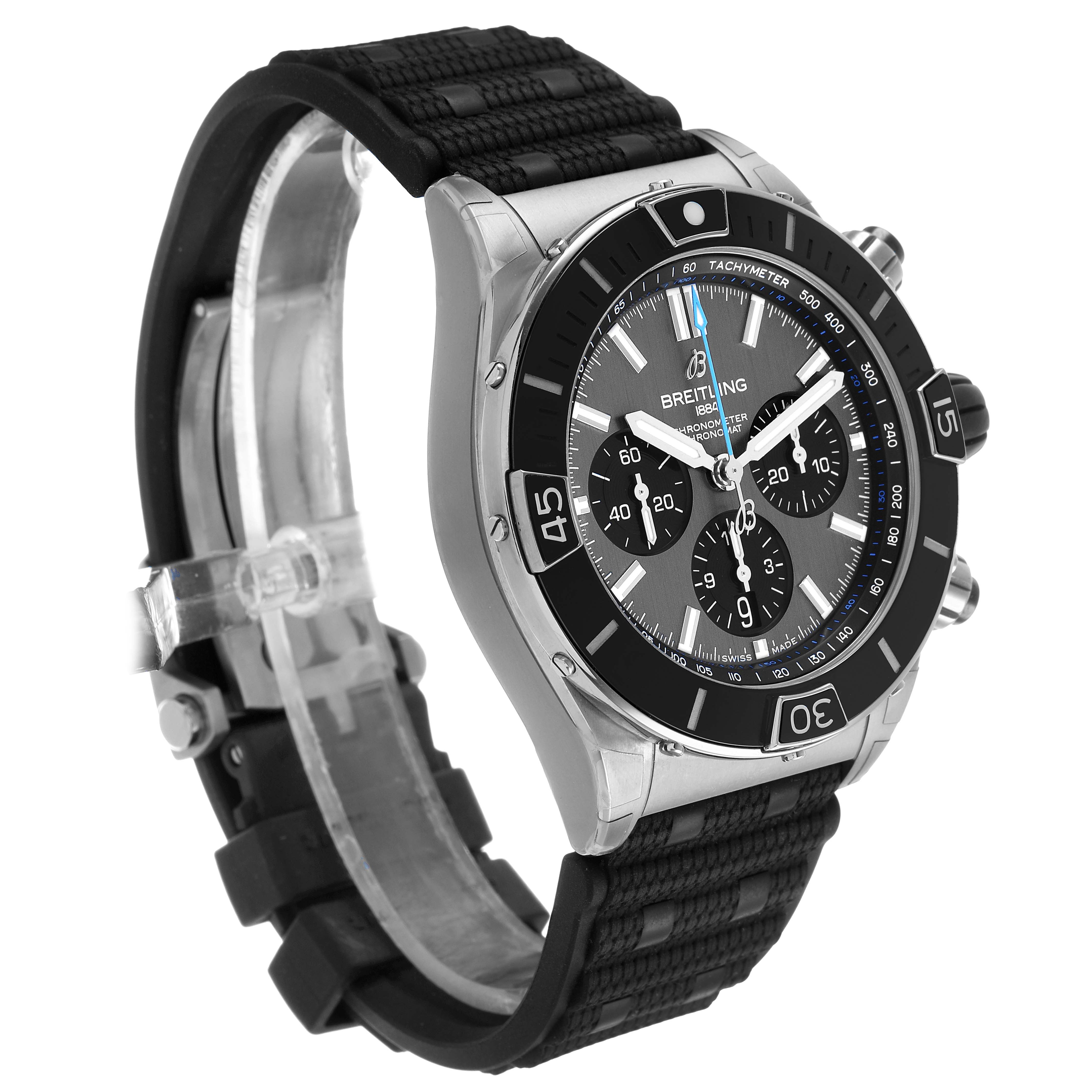 Breitling Super Chronomat B01 Grey Dial Titanium Mens Watch EB0136. Self-winding automatic officially certified chronometer movement. Chronograph function. Titanium case 44.0 mm in diameter with screwed down crown and pushers. Transparent exhibition sapphire crystal case back. Titanium unidirectional rotating bezel with black ceramic insert. 0-60 elapsed-time. Four 15 minute markers. Scratch resistant sapphire crystal. Grey dial with baton hour markers. 3 chronograph subdials - 60 second, 30 minute and 12 hour. Luminous baton hands and hour markers. Tachymeter scale around the outer rim. Date display at 6 o'clock. Grey rubber strap with a titanium double push button deployant clasp.