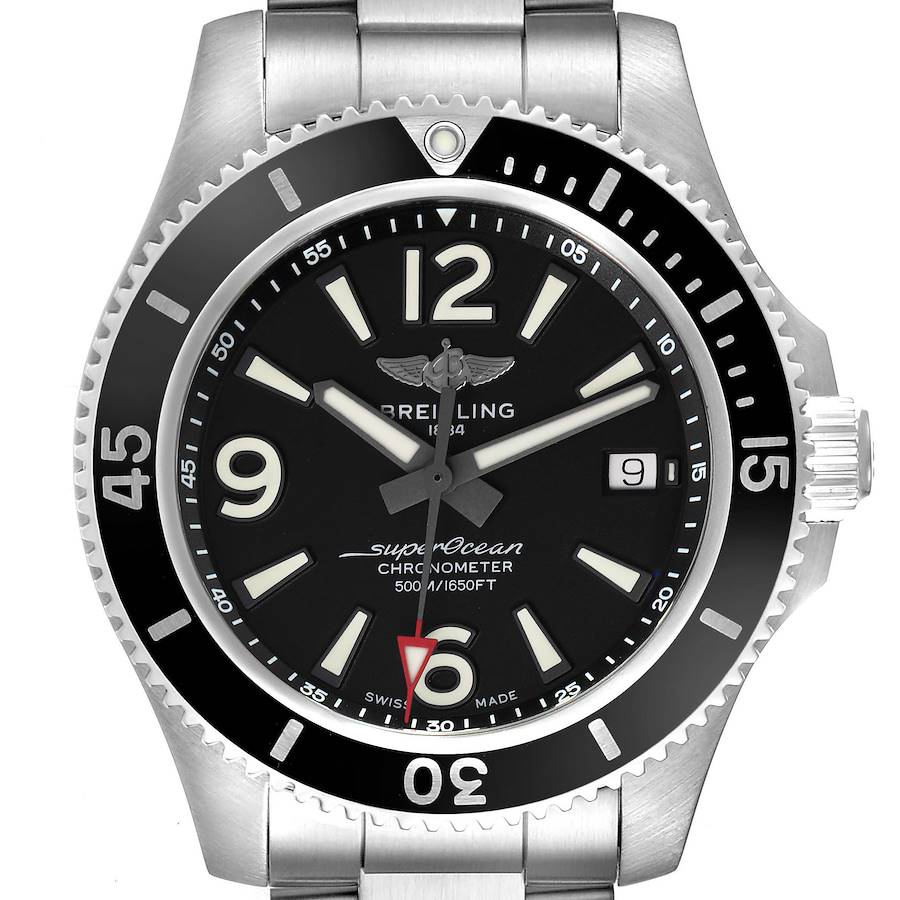 Breitling Superocean 42 Black Dial Steel Mens Watch A17366 Box Card. Automatic self-winding movement. Stainless steel case 42.0 mm in diameter. Breitling logo on the screwed-down crown. Black stainless steel unidirectional rotating bezel. 0-60 elapsed-time. Scratch resistant sapphire crystal. Black dial with luminescent-inlay stainless steel hands and index hour markers. Red-tipped seconds hand. Arabic numerals at 6, 9 and 12. Date calendar window at 3 o'clock. Minute markers around the outer rim. Stainless steel bracelet with a flip lock clasp. Fits an 8" wrist.