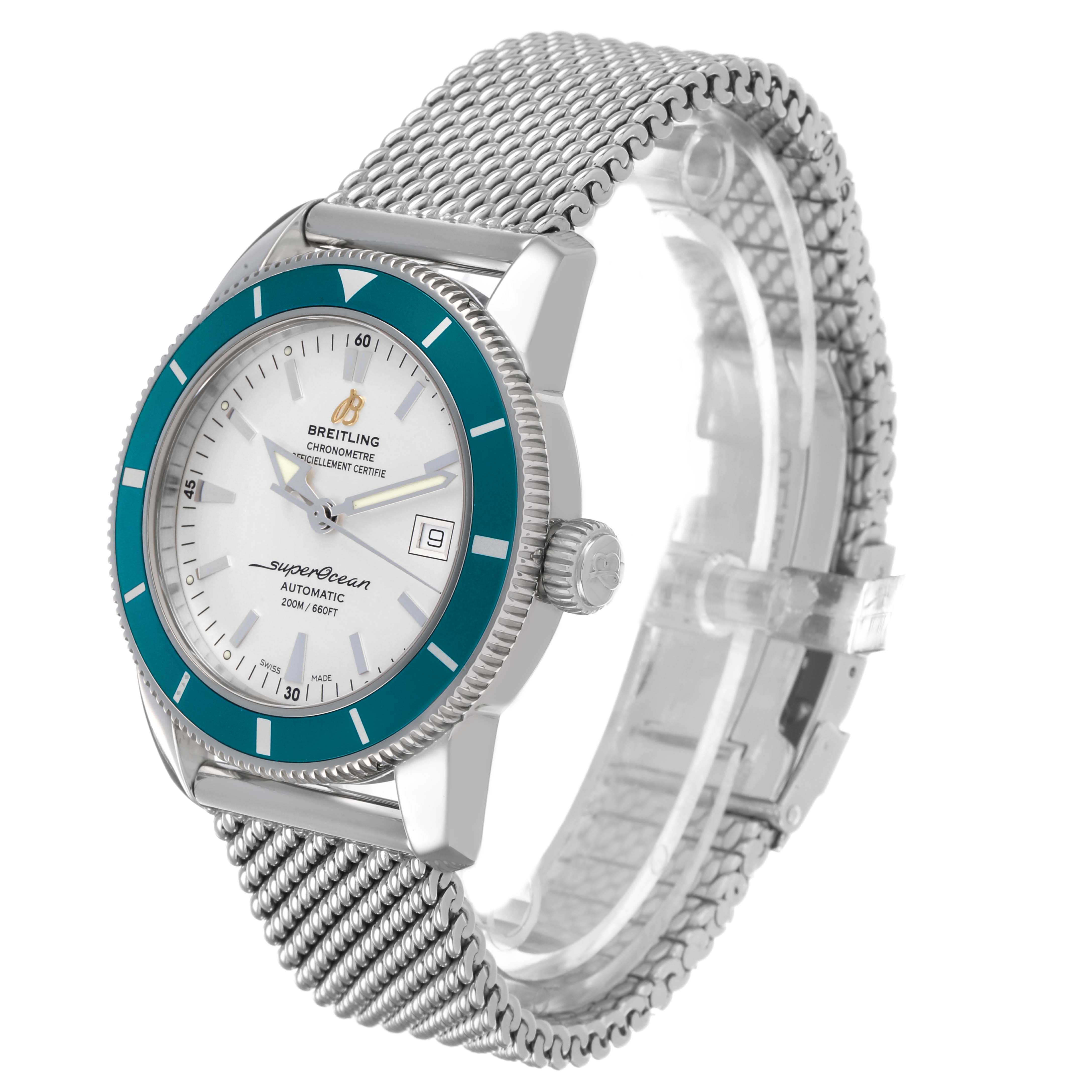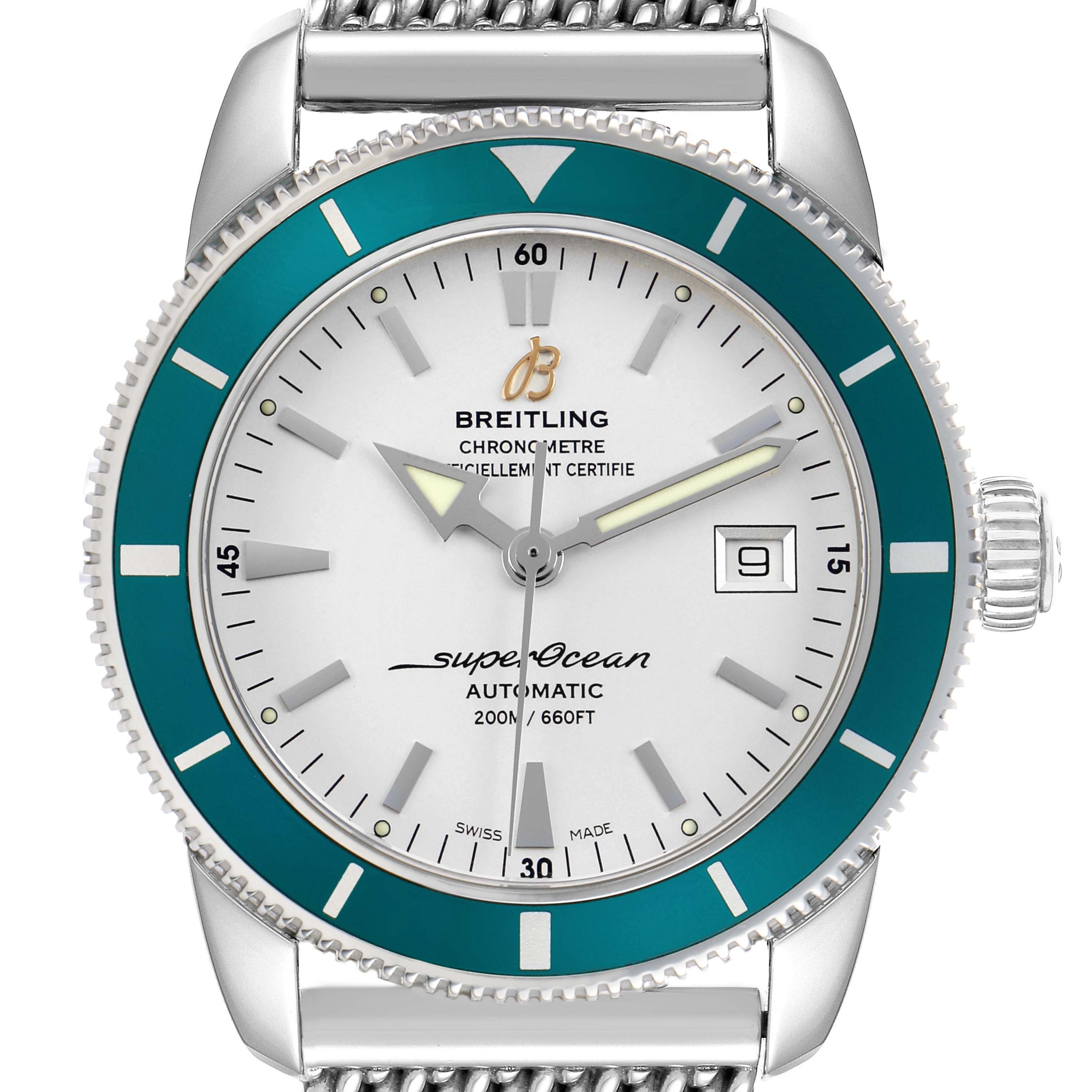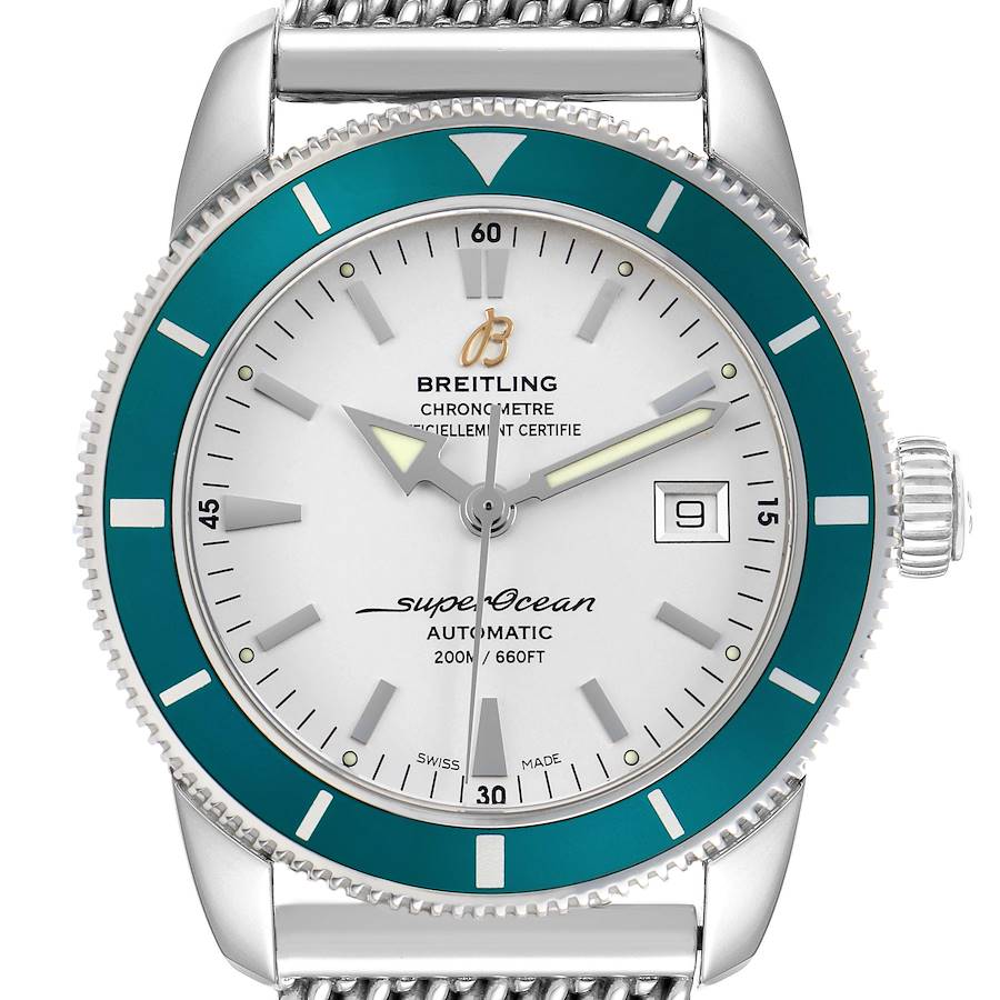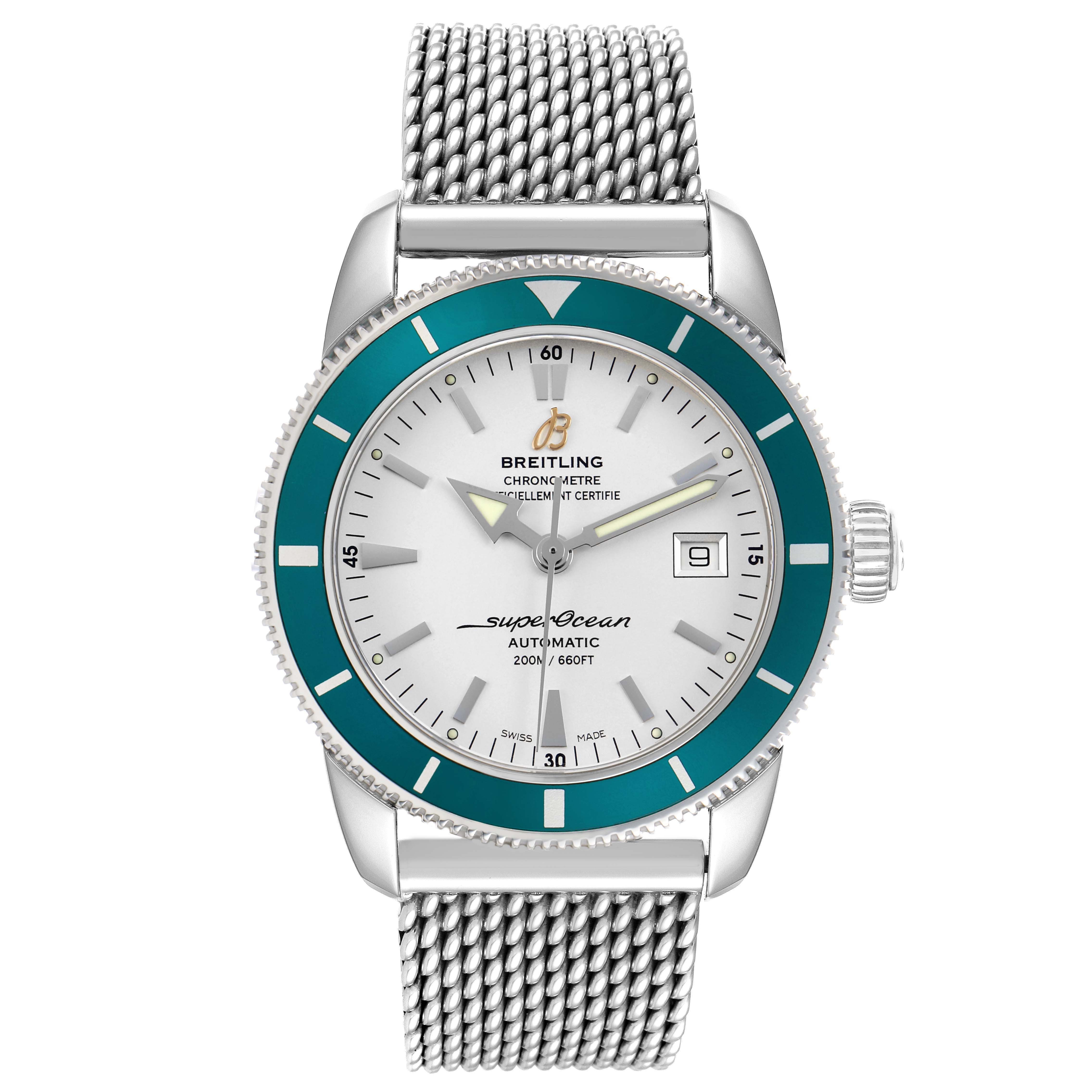 Breitling Superocean Heritage 42 Steel Green Bezel Mens Watch A17321. Automatic self-winding movement. Stainless steel case 42.0 mm in diameter. Stainless steel screwed-down crown. Green unidirectional revolving bezel. Scratch resistant sapphire crystal. White dial with luminescent stainless steel outlined hands and hour markers. Calendar window at 3. Stainless steel mesh bracelet with deployant clasp. Fits an 8 3/4" wrist.