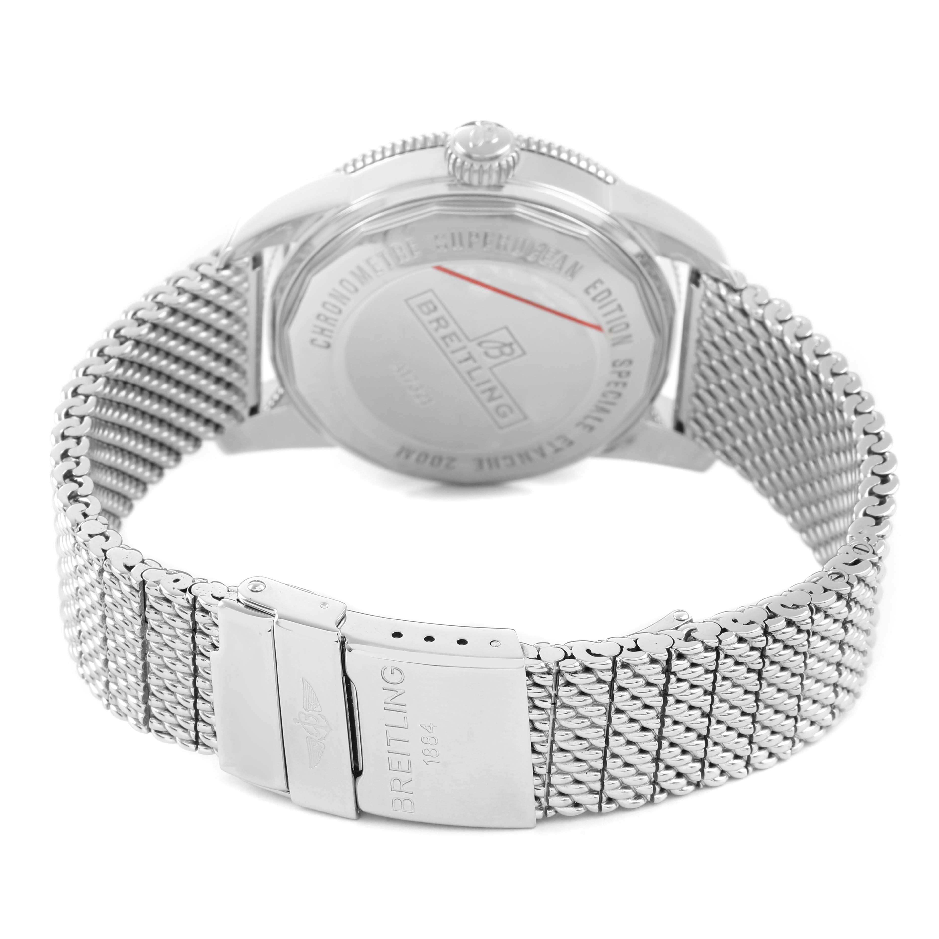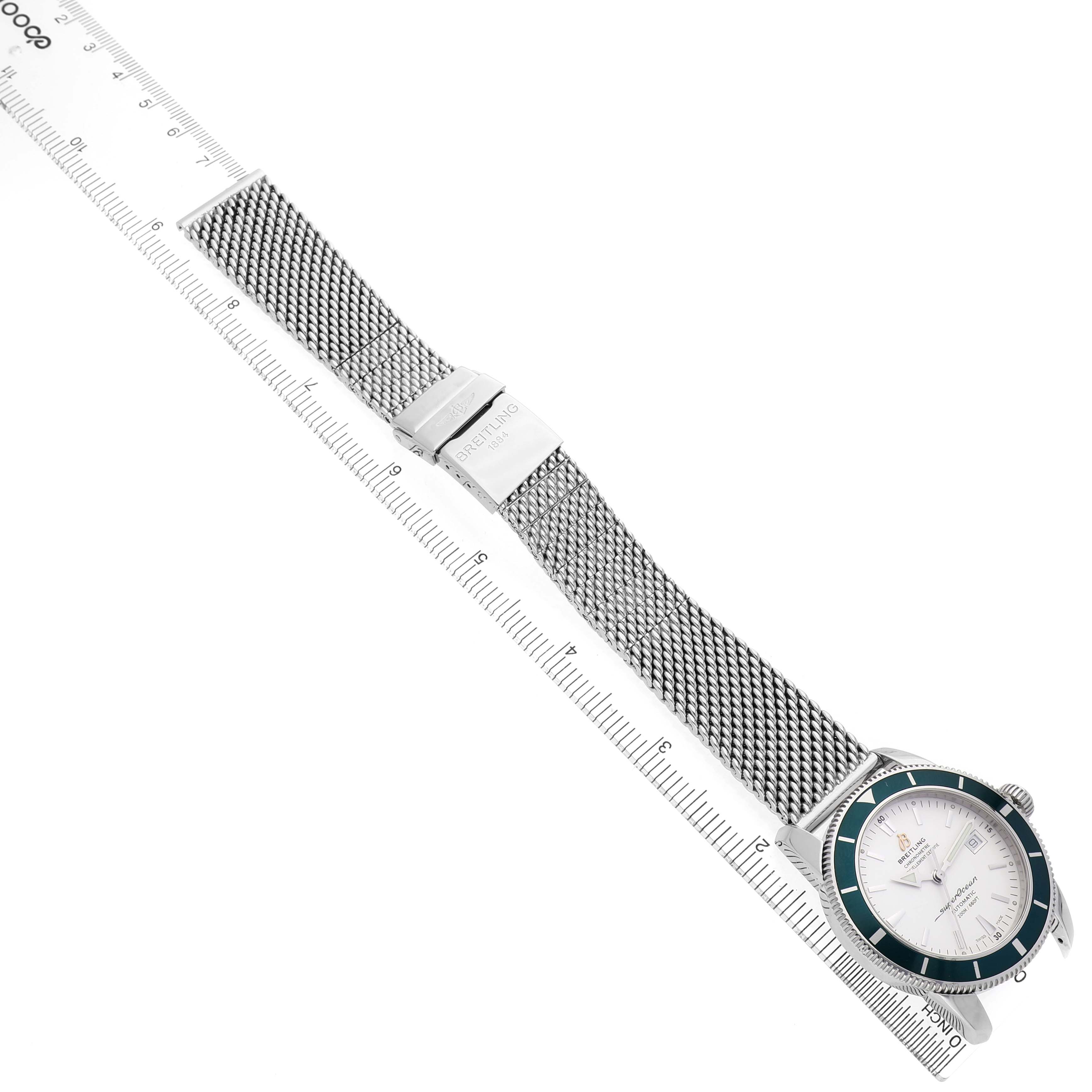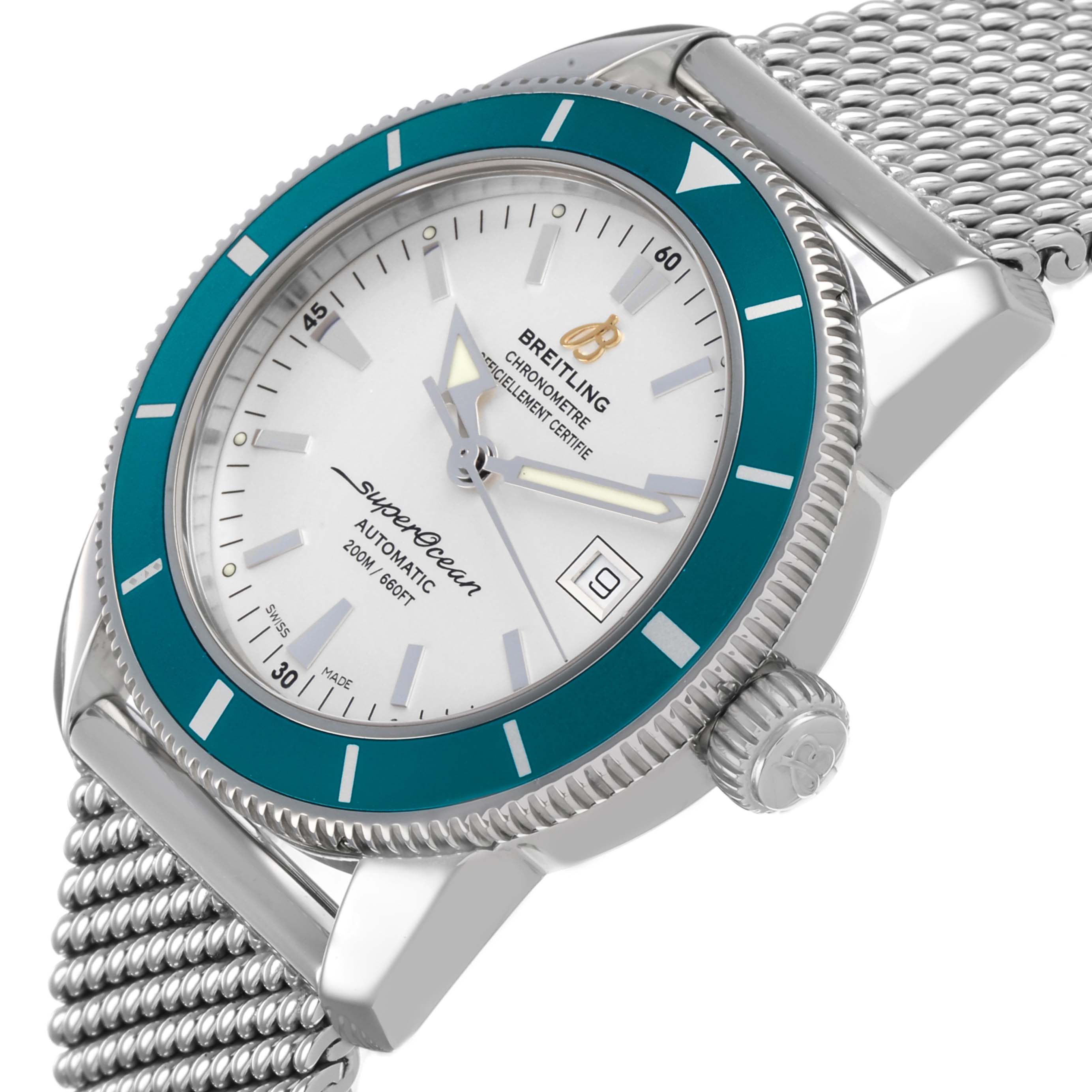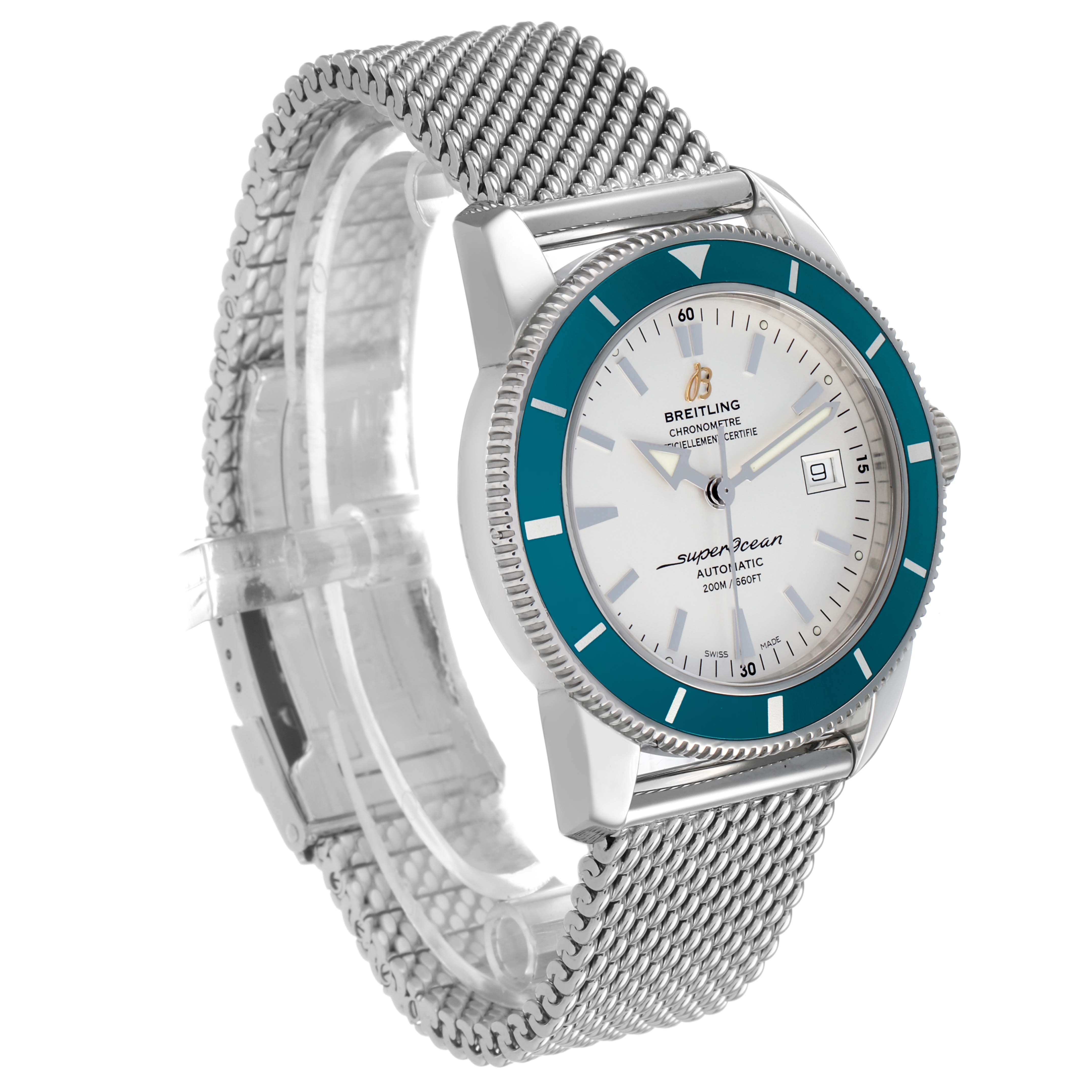 Breitling Superocean Heritage 42 Steel Green Bezel Mens Watch A17321. Automatic self-winding movement. Stainless steel case 42.0 mm in diameter. Stainless steel screwed-down crown. Green unidirectional revolving bezel. Scratch resistant sapphire crystal. White dial with luminescent stainless steel outlined hands and hour markers. Calendar window at 3. Stainless steel mesh bracelet with deployant clasp. Fits an 8 3/4" wrist.