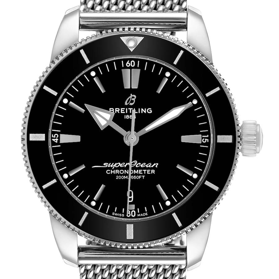 Breitling Superocean Heritage B20 44 Black Dial Mens Watch AB2030 Box Card. Automatic self-winding movement. Stainless steel case 44 mm in diameter. Breitling logo on the stainless steel screw-down crown. Black unidirectional revolving bezel. Scratch resistant sapphire crystal. Black dial with luminescent stainless steel outlined arrow-shaped hands and index hour markers. Date calendar window at the 6 o'clock aperature. Outer minute marker track. Stainless steel mesh bracelet and deployant clasp. Fits 7 3/4" wrist.