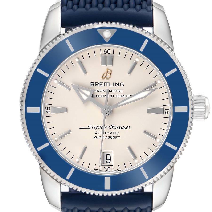 Breitling SuperOcean Heritage II 42 Silver Dial Steel Mens Watch AB2010 Card. Automatic self-winding B20 movement. Stainless steel case 42.0 mm in diameter. Stainless steel screwed-down crown. Blue ceramic unidirectional rotating bezel. Scratch resistant sapphire crystal. Silver dial with luminescent stainless steel outlined hands and hour markers. Outer minute track. Date calendar window at 6. Blue rubber strap with stainless steel push-button deployant buckle.