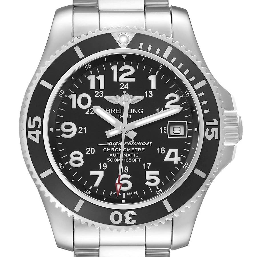 Breitling Superocean II Steel Black Dial Mens Watch A17365 Box Papers. Automatic self-winding movement. Stainless steel round case 42.0 mm in diameter. Two pushers operate the chronograph functions. Breitling logo on the crown. Black unidirectional rotating bezel. 0-60 elapsed-time. Scratch resistant sapphire crystal. Black dial with luminescent baton hands and Arabic numeral hour markers. Date calendar at the 3 o'clock aperture. Stainless steel bracelet with a flip-lock clasp. Fits an 8" wrist.