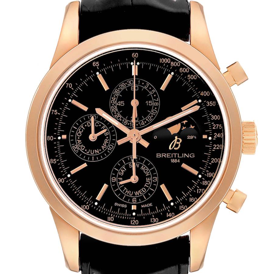 Breitling Transocean Chronograph 1461 Rose Gold Mens Watch R19310 Box Card. Automatic self-winding chronograph movement. 18K rose gold case 43 mm in diameter. Transparent exhibition sapphire crystal case back. 18k rose gold bezel. Scratch resistant sapphire crystal. Black dial. Luminescent rose gold outlined hands and baton hour markers. Tachymeter around the outer rim. Date and small seconds sub-dial at 12 o'clock, day of the week and chronograph hours at 6 and month and chronograph minutes sub-dial at 9 o'clock. Moonphase indicator at 3 o'clock. Black leather strap with white stitches. 18K rose gold tang buckle.