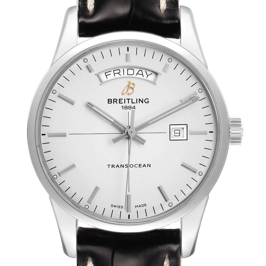Breitling Transocean Silver Dial Steel Mens Watch A45310. Automatic self-winding officially certified chronometer movement. Stainless steel case 43.0 mm in diameter. Two stylized plane symbols on the case back. Breitling logo on the crown. Stainless steel smooth bezel. Scratch resistant sapphire crystal. Silver dial with index hour markers and luminescent inlay stainless steel hands. Date calendar window at 3 o'clock. Day of the week indicator at 12 o'clock. Black leather strap with stainless steel deployant clasp.