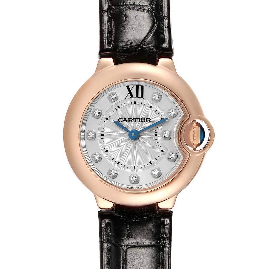 Cartier Ballon Bleu 28 Rose Gold Silver Diamond Dial Ladies Watch WE902050. Quartz movement. 18k rose gold round case 28.0 mm in diameter. Fluted crown set with the blue spinel cabochon. 18k rose gold smooth bezel. Scratch resistant sapphire crystal. Silver opaline dial with original Cartier diamond hour markers and an inner minute track. Blue sword-shaped hands. Black leather strap with an 18k rose gold tang buckle.