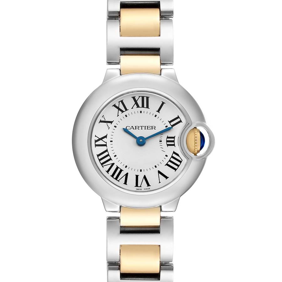 Cartier Ballon Bleu 28 Steel Yellow Gold Ladies Watch W69007Z3. Quartz movement. Stainless steel round case 28.0 mm in diameter. Fluted 18k yellow gold crown set with a blue spinel cabochon. Stainless steel smooth bezel. Domed, scratch resistant sapphire crystal. Silvered opaline dial with black radial Roman numeral hour markers and blued steel sword-shaped hands. An inner minute track. Secret Cartier signature at X. Stainless steel and 18K yellow gold bracelet with a hidden double deployant clasp. Fits a 6 3/4" wrist.