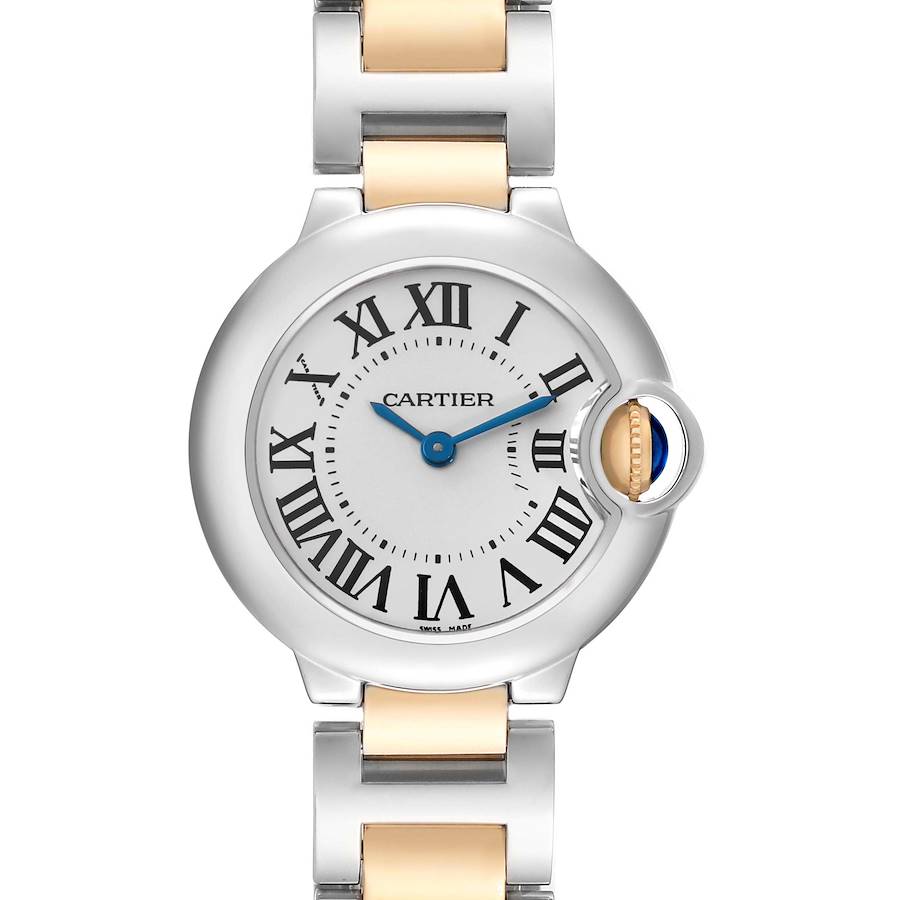 Cartier Ballon Bleu 28 Steel Yellow Gold Ladies Watch W69007Z3. Quartz movement. Stainless steel round case 28.0 mm in diameter. Fluted 18k yellow gold crown set with a blue spinel cabochon. Stainless steel smooth bezel. Domed, scratch resistant sapphire crystal. Silvered opaline dial with black radial Roman numeral hour markers and blued steel sword-shaped hands. An inner minute track. Secret Cartier signature at X. Stainless steel and 18K yellow gold bracelet with a hidden double deployant clasp. Fits a 6 3/4" wrist.