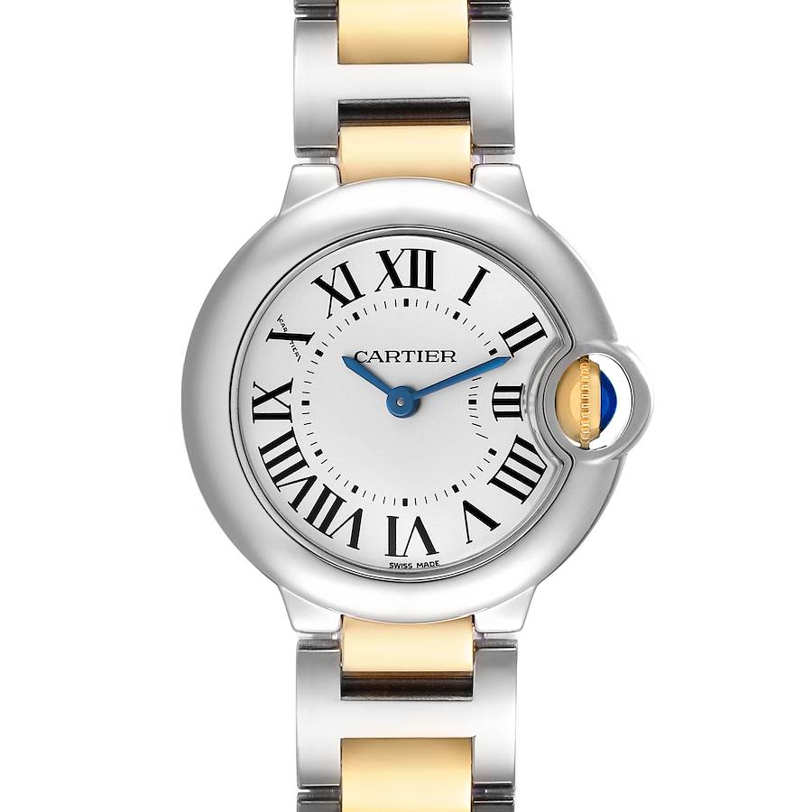 Cartier Ballon Bleu 28 Steel Yellow Gold Ladies Watch W69007Z3. Quartz movement. Stainless steel round case 28.0 mm in diameter. Fluted 18k yellow gold crown set with a blue spinel cabochon. Stainless steel smooth bezel. Domed, scratch resistant sapphire crystal. Silvered opaline dial with black radial Roman numeral hour markers and blued steel sword-shaped hands. An inner minute track. Secret Cartier signature at X. Stainless steel and 18K yellow gold bracelet with a hidden double deployant clasp. Fits a 6 1/4" wrist.