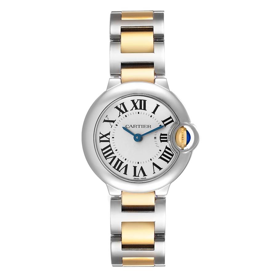 Cartier Ballon Bleu 28 Steel Yellow Gold Ladies Watch W69007Z3 Papers. Quartz movement. Stainless steel round case 28.0 mm in diameter. Fluted 18k yellow gold crown set with a blue spinel cabochon. Stainless steel smooth bezel. Domed, scratch resistant sapphire crystal. Silvered opaline dial with black radial Roman numeral hour markers and blued steel sword-shaped hands. An inner minute track. Secret Cartier signature at X. Stainless steel and 18K yellow gold bracelet with a hidden double deployant clasp. Fits a 6 3/4" wrist.
